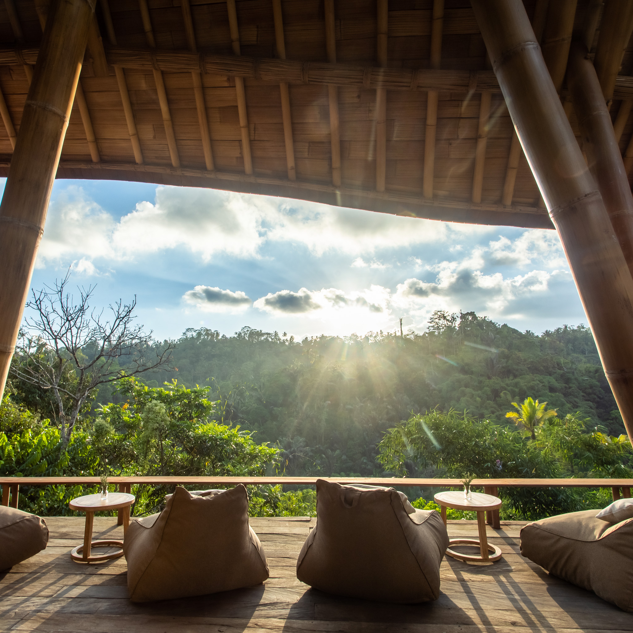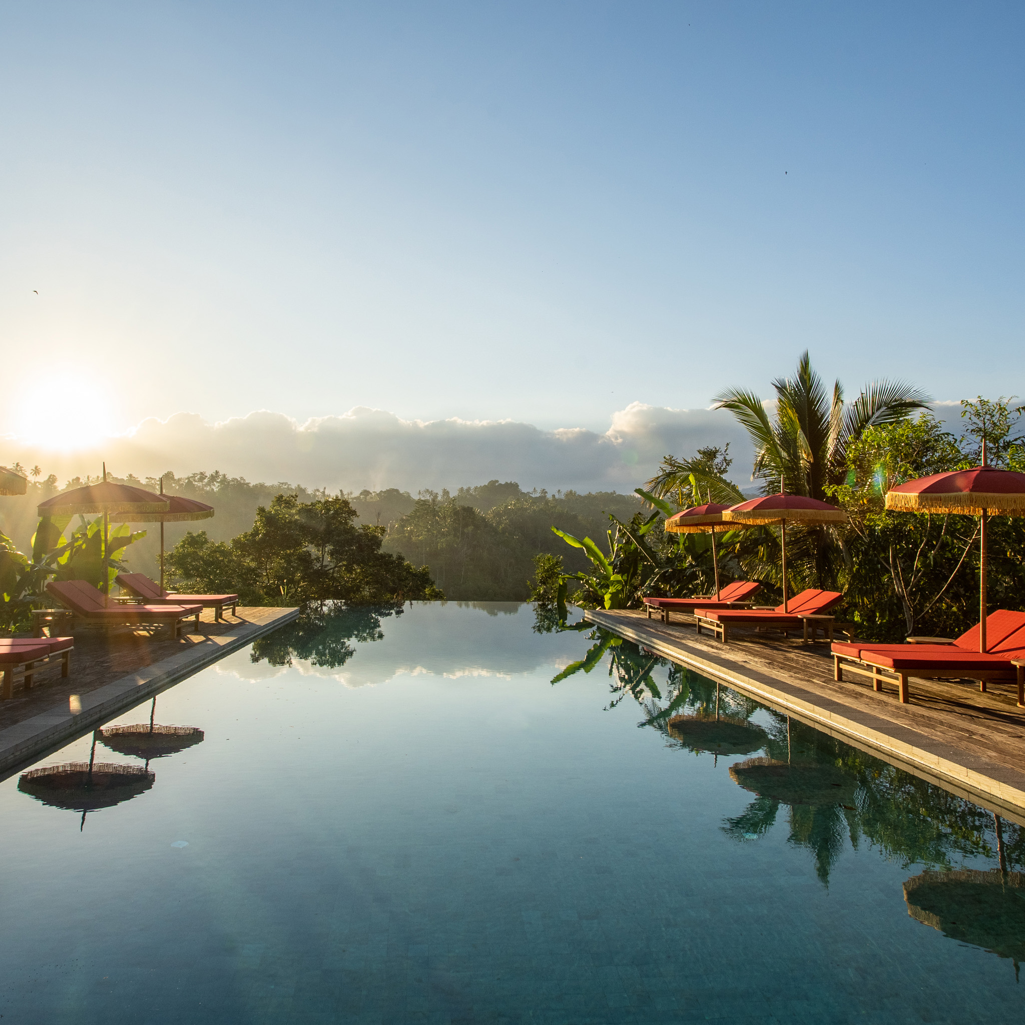 Das Buahan befindet sich im tropischen Hochland im Norden von Ubud. Berge und Wälder, soweit das Auge reicht, dazu noch der Ayung Fluss und ein Wasserfall, den man zu Fuß erreicht. Der schönste Ausblick? Den gibt es in dem Luxusresort erfreulicherweise nicht. Nur ganz viele, je nach Tageszeit in immer wieder wechselnden Stimmungen. Am 22 Meter langen Infinitypool, wo die orangefarbenen Sonnenschirme und Liegen hübsche Farbakzente setzen, kann man sich nicht an der Umgebung satt sehen, auf der eigenen Terrasse oder im Open-Air-Spa in einem Pavillon auch nicht und so verhält es sich auf dem ganzen Anwesen.