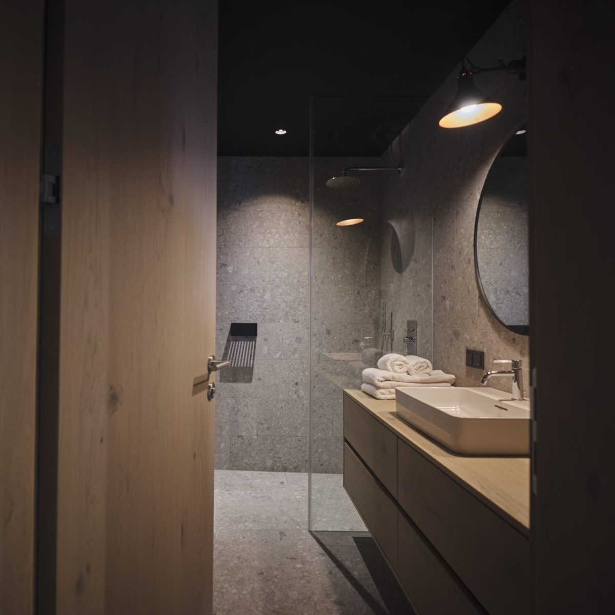 Der fußbodenbeheizte, geschliffene Betonboden melangiert in unaufgeregtem grau-beige, die schwarzen Decken und Wände geben Raum, die großzügigen Flächen und Möbel aus hellem, warmen Lärchenholz strahlen Eleganz und Gemütlichkeit aus. Minimalistisch und wohnlich gehen in den Haus und Hof-Apartments eine auf allen Ebenen wohltuende Beziehung ein. Hier gibt es kein zu viel und eine sichtbare Liebe zum Detail.