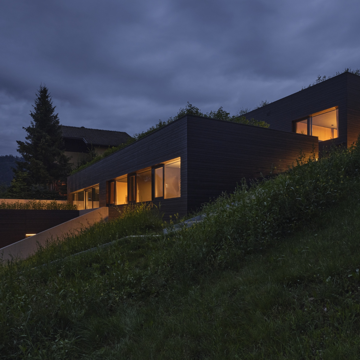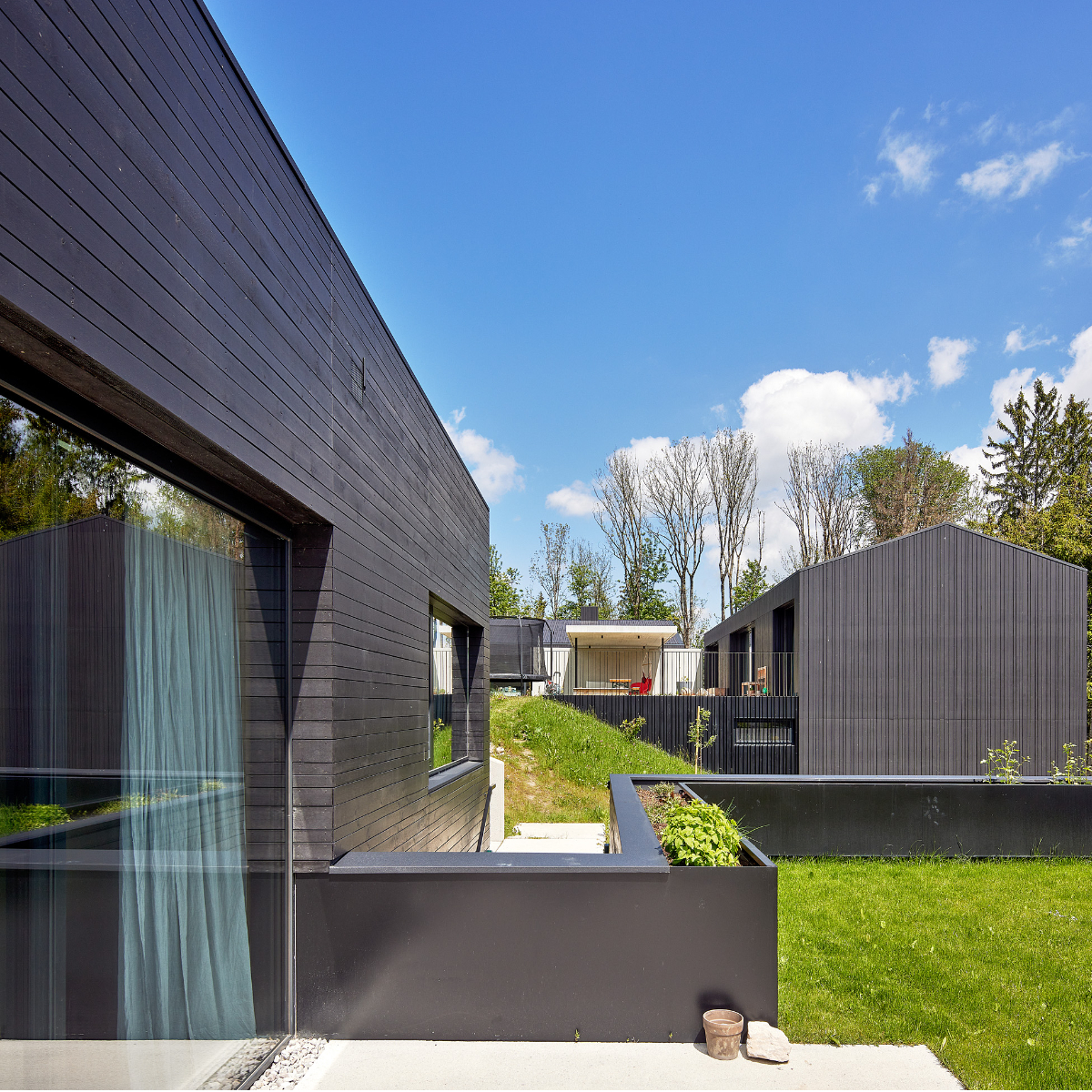 Die große Terrasse ist übergangslos durch die sich leicht zu öffnenden Panoramatüren zu erreichen. Auch hier findet man nichts Überflüssiges. Stühle, ein Tisch und eine Lampe die abends Licht spendet. Das Haus und Hof ist ein modernes, weitläufiges Ensemble aus drei Ferienwohnungen der Extraklasse. Die drei schwarzen Kuben fügen sich auffällig unauffällig in die grüne, im Winter weiße Landschaft ein. Berge und Seen vor der Tür. Es ist friedlich und ruhig. Drinnen wie draußen.