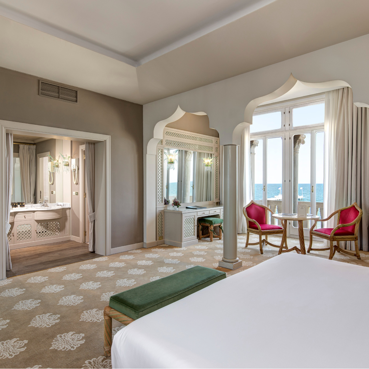 Der elegante Baustil findet sich nicht nur im Innenhof mit Springbrunnen wieder oder in der opulenten Lobby, sondern auch in allen der knapp 200 Zimmer und Suiten, die übrigens die größten Venedigs sind. Besonders schön: Zimmer 436 mit Meerblick!