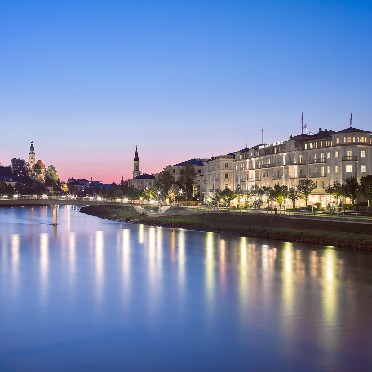 Nicht nur von ihren Balkonen, auch von den Restaurant-Terrassen aus, genießt man einen einmaligen Blick auf die Salzach, das Salzburger Theater oder den Makartplatz. Das Wahrzeichen der Stadt, die Festung Hohensalzburg, und die malerische Altstadt bestechen zudem mit ihrer mittelalterlichen und romantischen Bauweise.