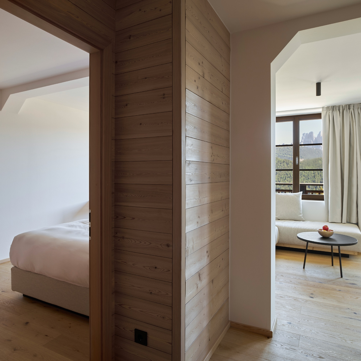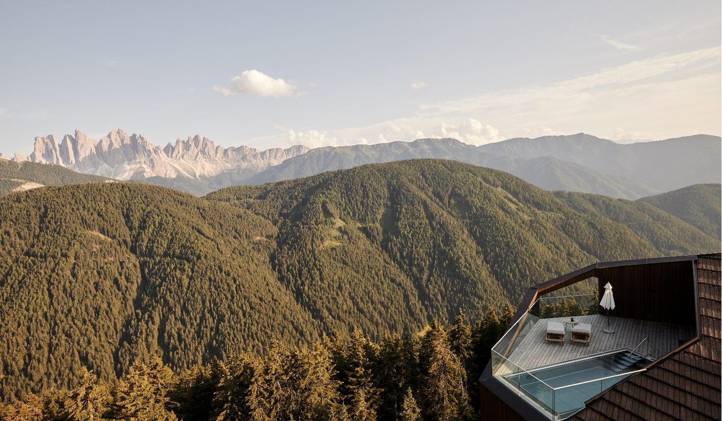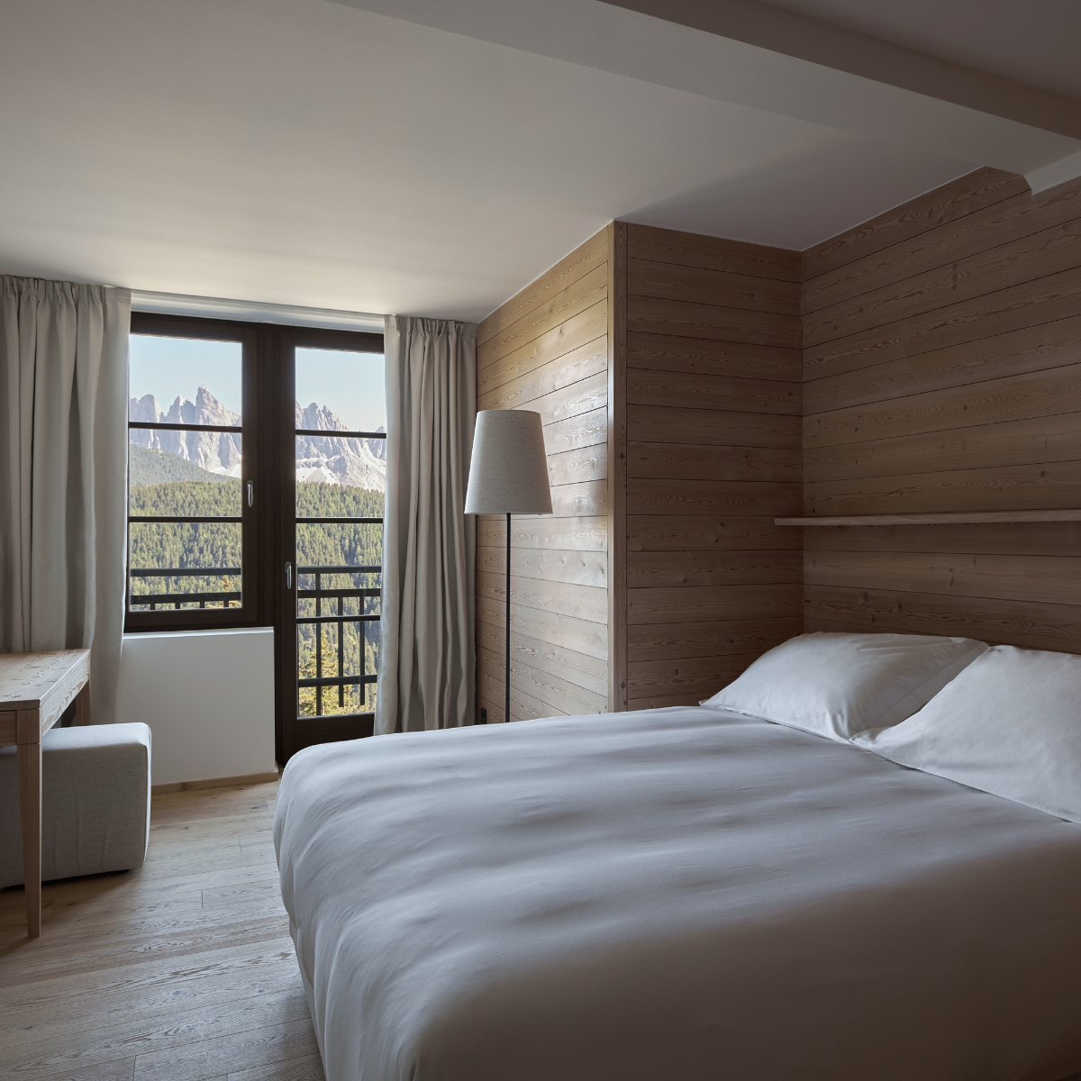 Alle 62 Suiten des Luxusrefugiums – mit 50, 55 und 200 Quadratmetern sehr großzügig bemessen – umarmen die Natur. Durch ihre Südausrichtung sind sie ganztägig sonnenverwöhnt und bieten den Gästen einen weiten Ausblick auf die Bergmassive des UNESCO-Weltnaturerbes Dolomiten.