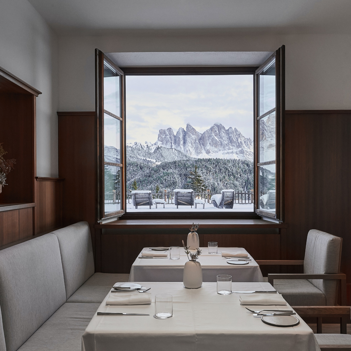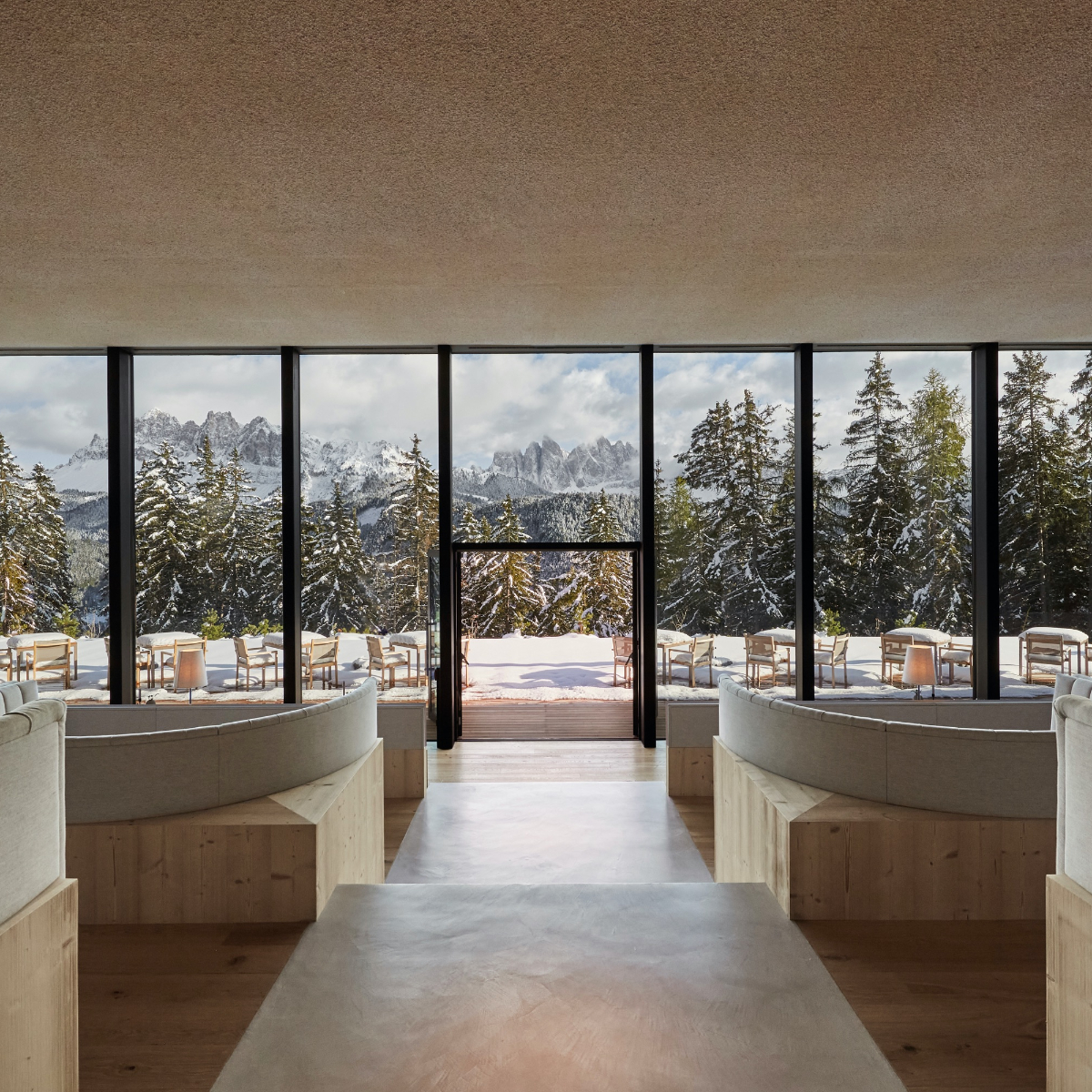 Das Restaurant ist stufenförmig ausgerichtet. So bietet jeder Tisch die gewünschte Privatsphäre und gleichzeitig ermöglichen bodentiefe Fenster einen weiten Blick über die umliegenden Wälder und den Sonnenuntergang in den Dolomiten – die Natur wird quasi in den Raum geholt.