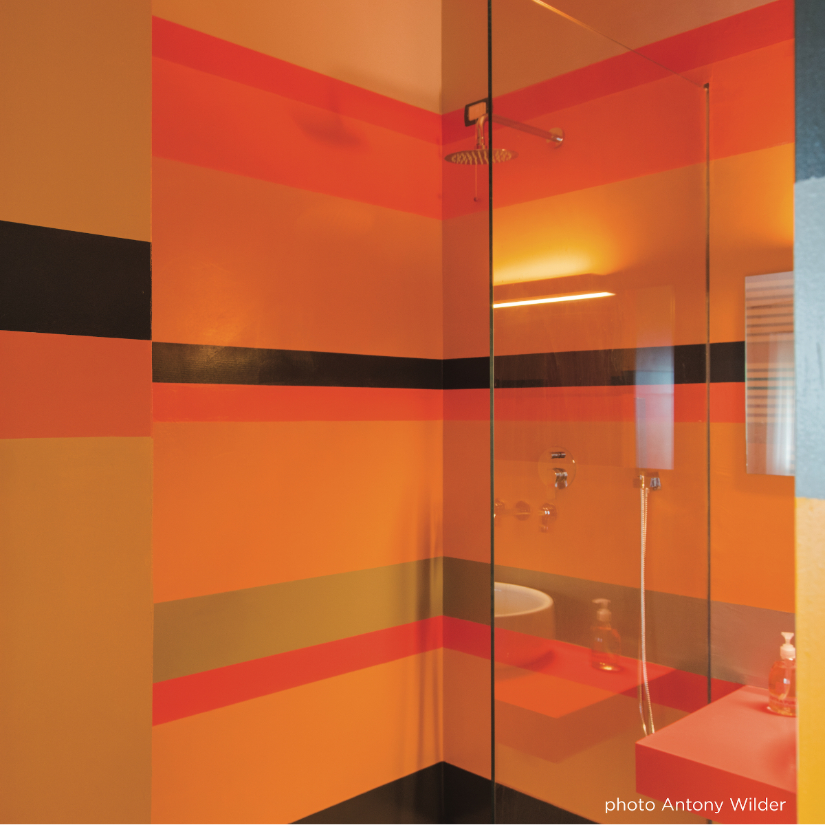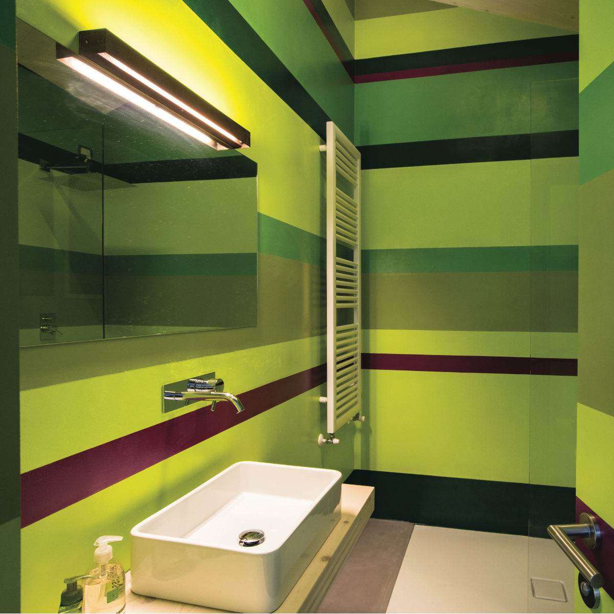 Im La Mugletta befinden sich drei Gasträume. Auch in diesen sind sämtliche Wände aus Lärchenholz. Die Böden im gesamten Ensemble sind aus Beton. Die Wände der Badezimmer glatt verputzt und in den Lieblingsfarben von Ulla und Eberhardt gestrichen. Es gibt ein gelbes, grünes und ein oranges Zimmer. Alle individuell eingerichtet und farblich verschieden designed. Die warmen Töne des Holzes und die bunten Wände kontrastieren angenehm mit dem unaufgeregt-wohnlichem Grau der Böden.