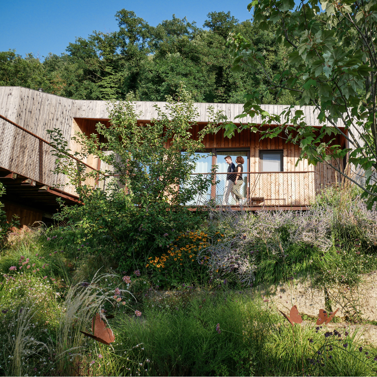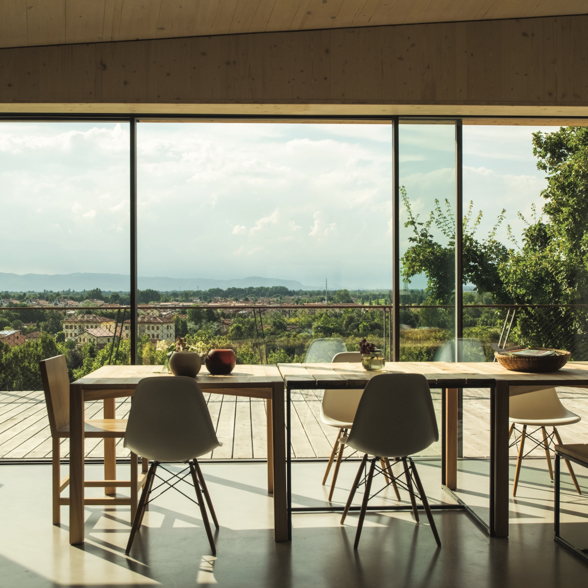 Der Bau im Gewand aus Lärchenholz und Glas ist mit großer Sorgfalt und Sensibilität vom Architektur- und Designkollektiv Integrale Collective aus Padua in die Umgebung eingefügt worden. Bäume, Beete und Blumen umgeben das Haus und die weitläufige Terrasse. Große Fensterfronten geben den Blick frei auf den geräumigen und gemütlichen Salotto.