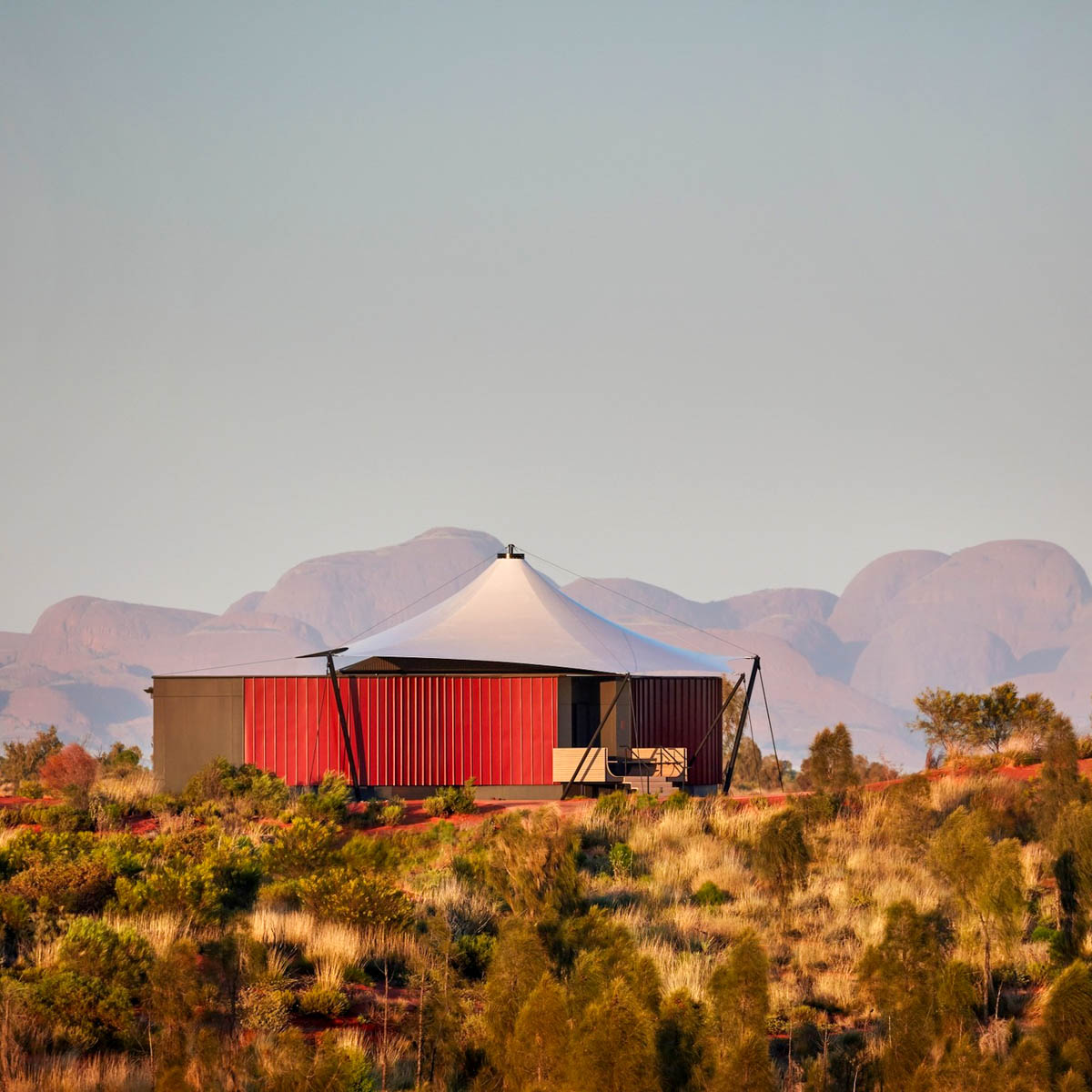 16 Zelte mit riesigen Fenstern im roten Sand. Immer den Uluru, so der offizielle Name, der auch eine heilige Stätte der Aborigines ist, vor Augen, es ist ein magischer Ort. Je nach Sonnenstand, beim Sonnenaufgang und -untergang und allen Zeiten dazwischen leuchten die Natur, der Sand, die Dünen, der Uluru, hervorgerufen durch Eisenoxide, in unterschiedlichen Rot- und Brauntönen.