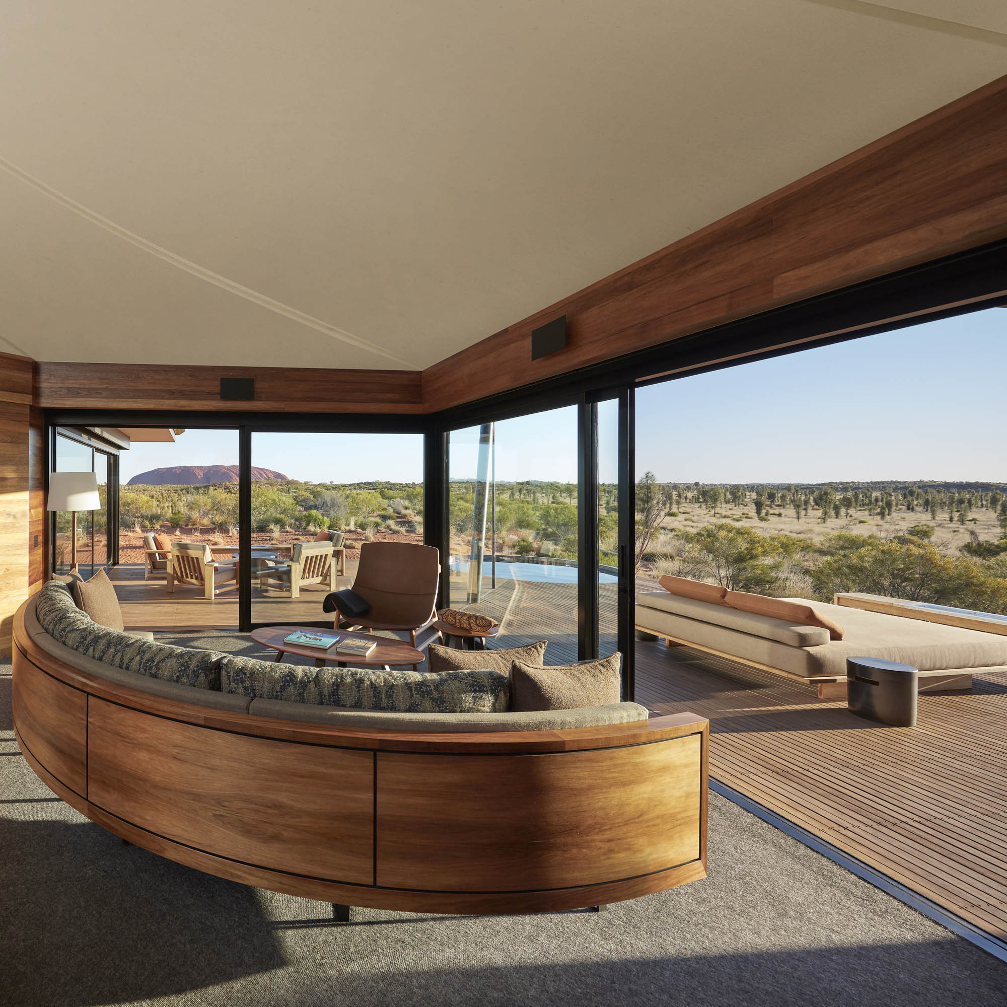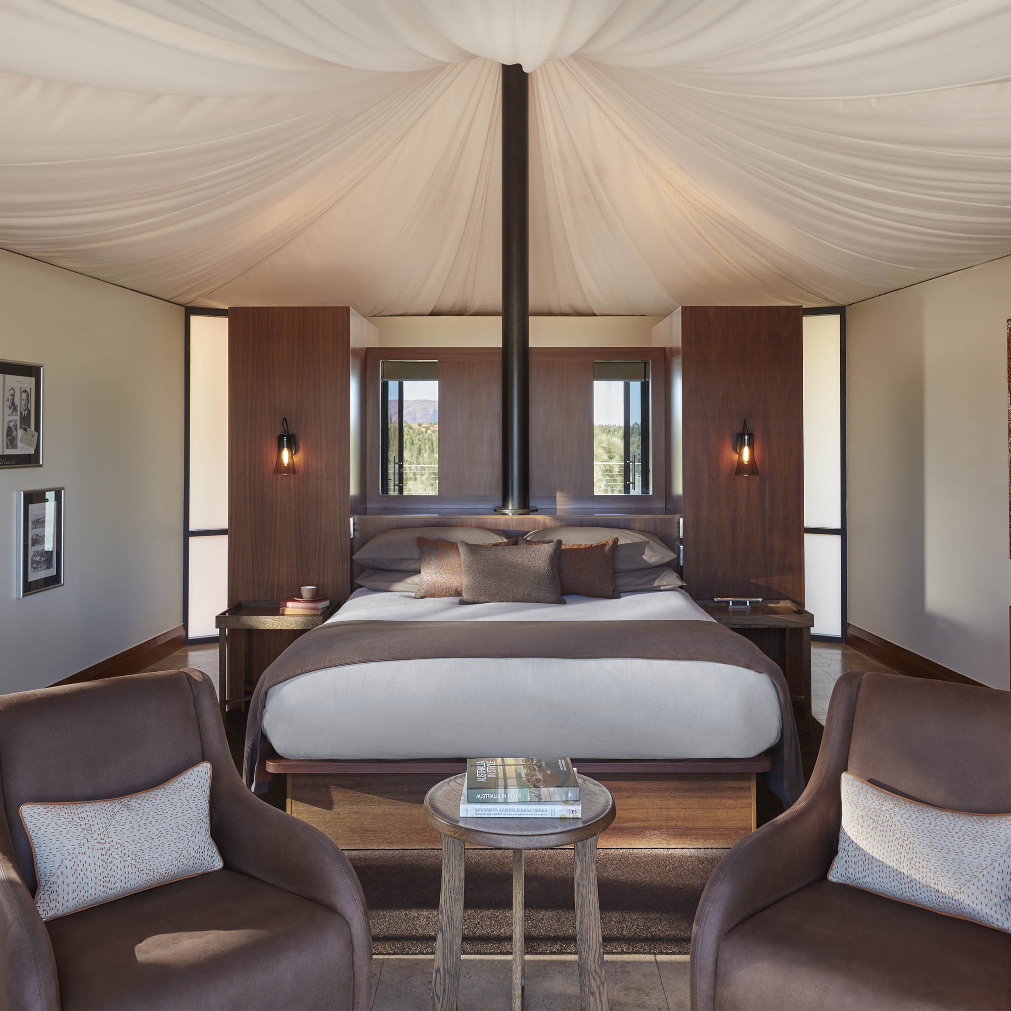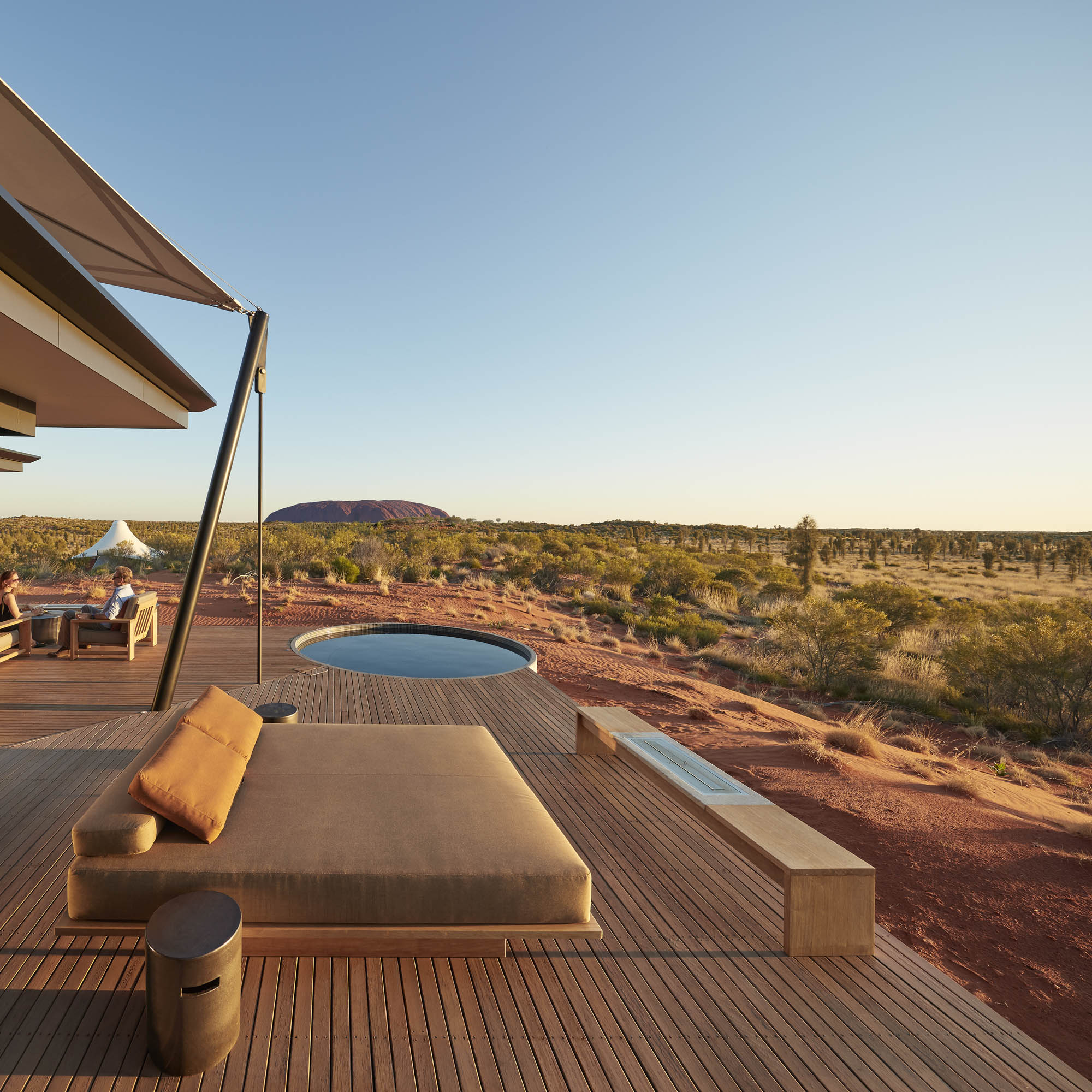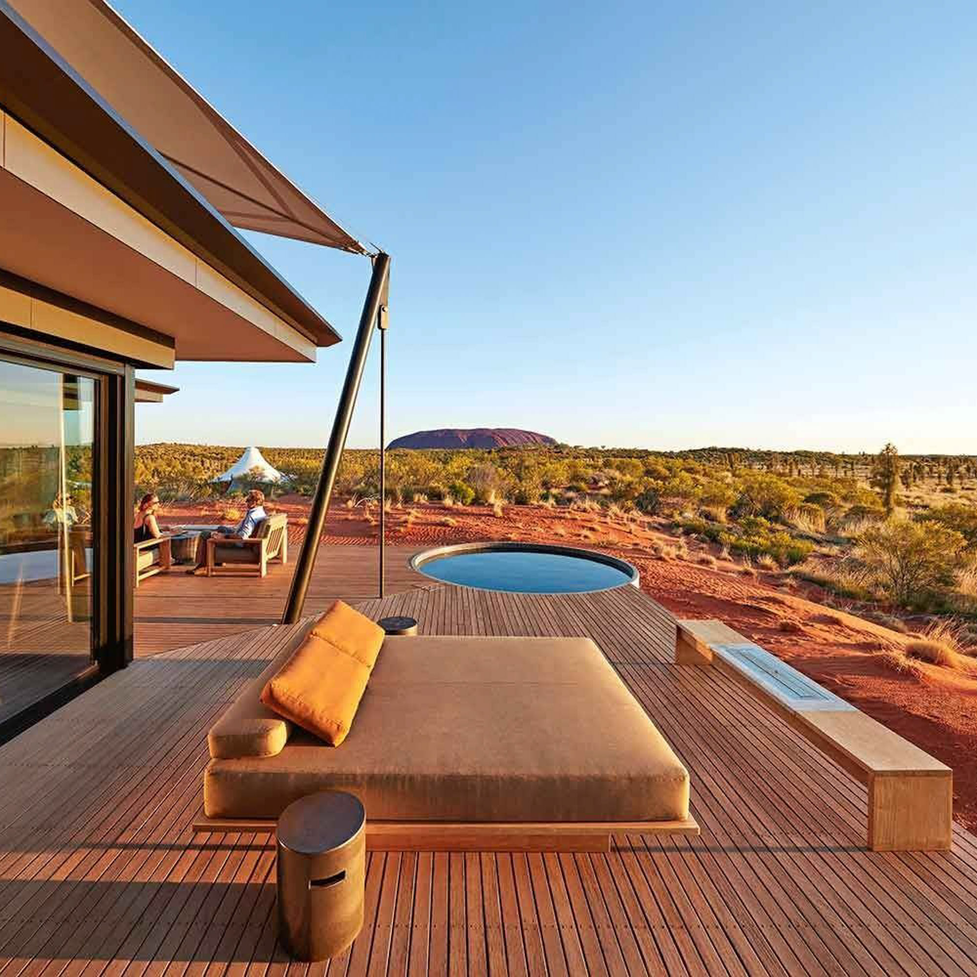 Der gemütlichste Platz zum Berggucken ist das Tagesbett auf dem großen Balkon des eigenen Luxuszeltes. Über eine Urkraft der Natur hinüber, das Feuer im Außenkamin. Dass es draußen warm ist, spielt keine Rolle, es geht um die Behaglichkeit inmitten des Outbacks, der australischen Wüste, die hier nicht nur Rot sondern durch das Buschland auch Grün ist.