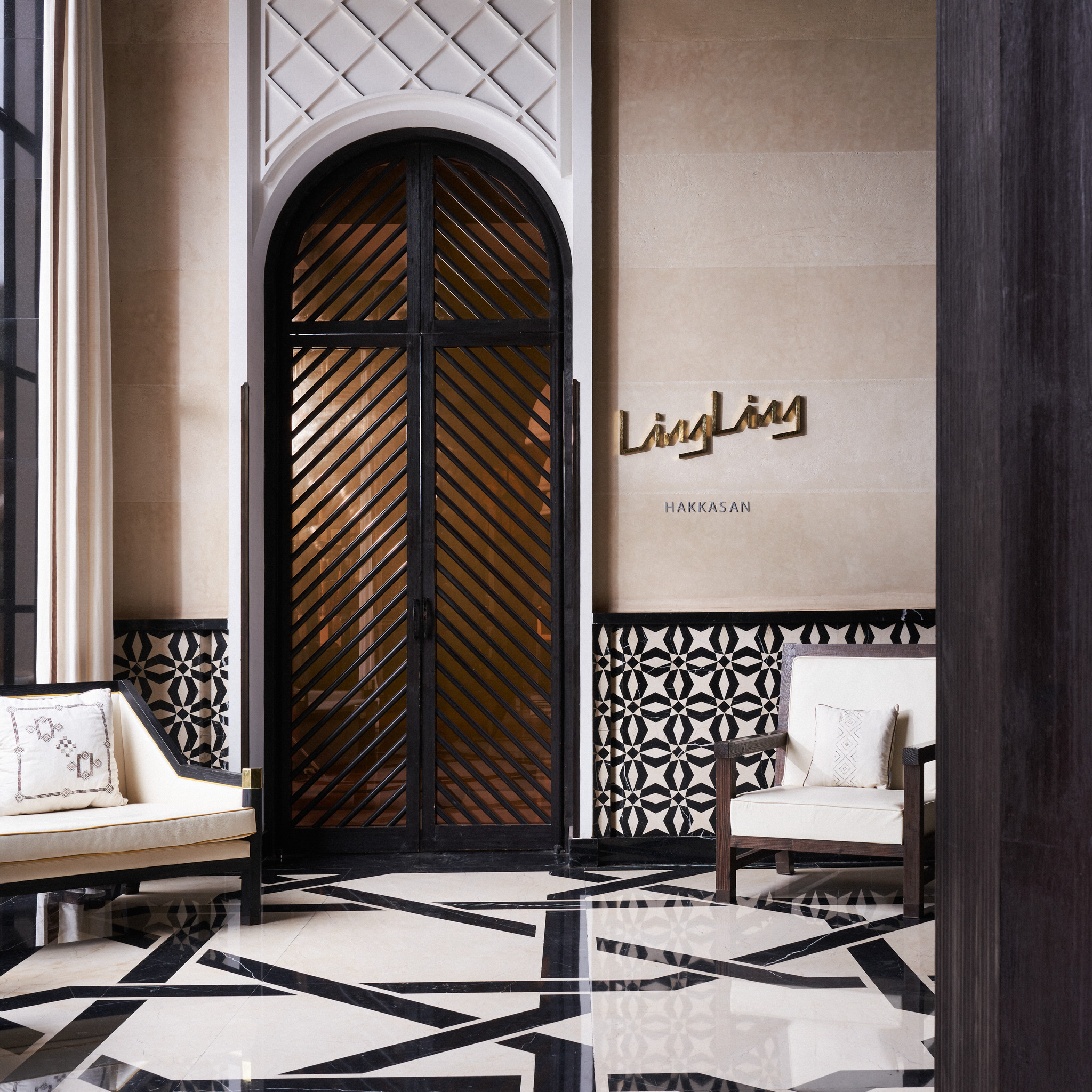 Das von Berbern und arabisch-andalusisch inspirierte Dekor, Wasserbecken, auch die runde Wanne darf durchaus so bezeichnet werden, die mit dem traditionellen Tadelakt-Kalkputz bearbeiteten Wände, handgewebte Teppiche, üppig mit Kissen ausgestattete Nischen und als Gegensatz zartes Gitterwerk – die Vorstellung vom Orient könnte Tradition und Moderne nicht besser verbinden.