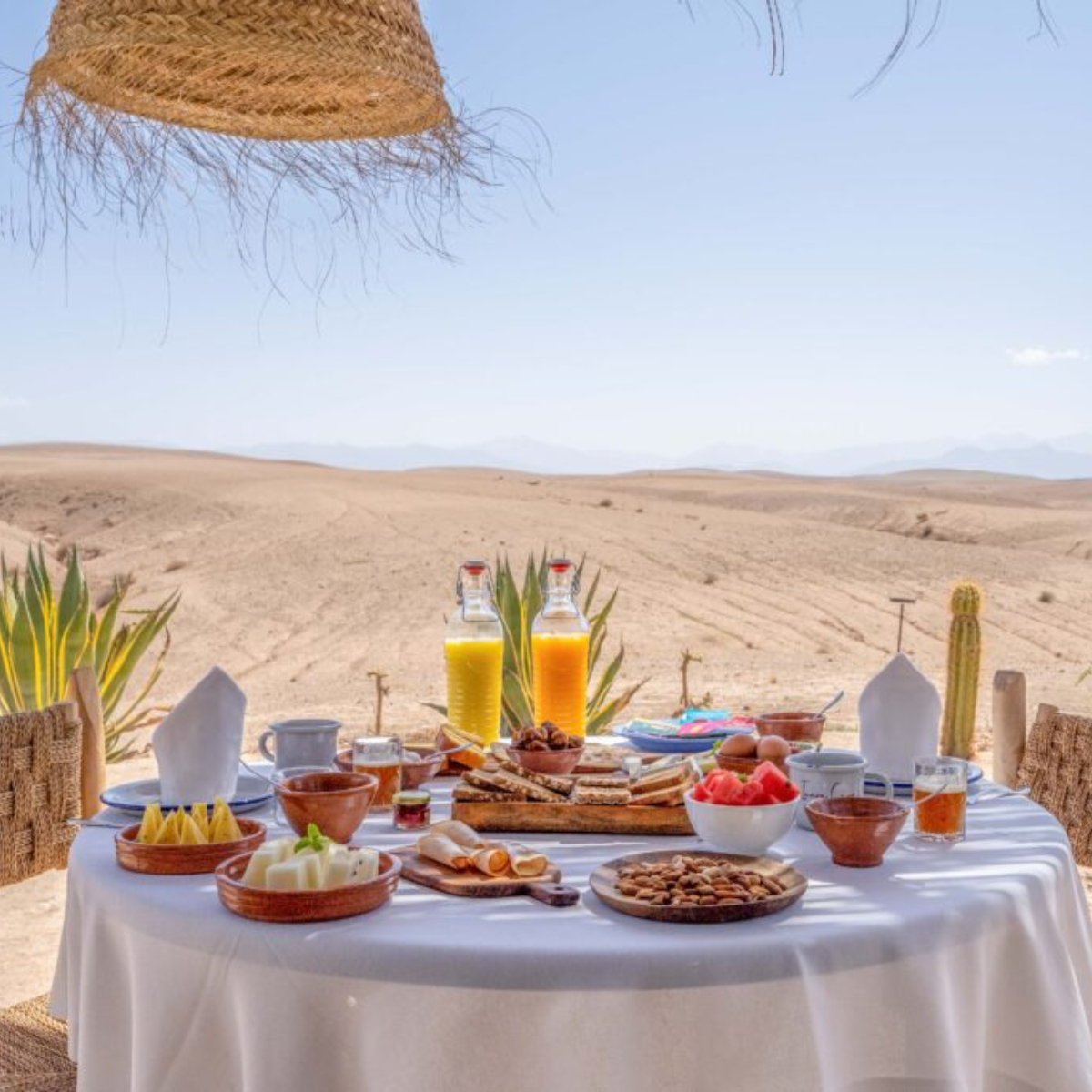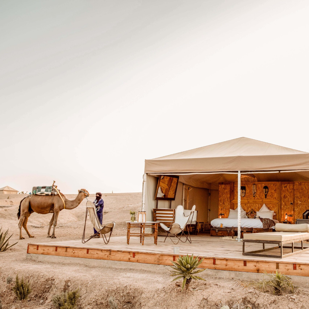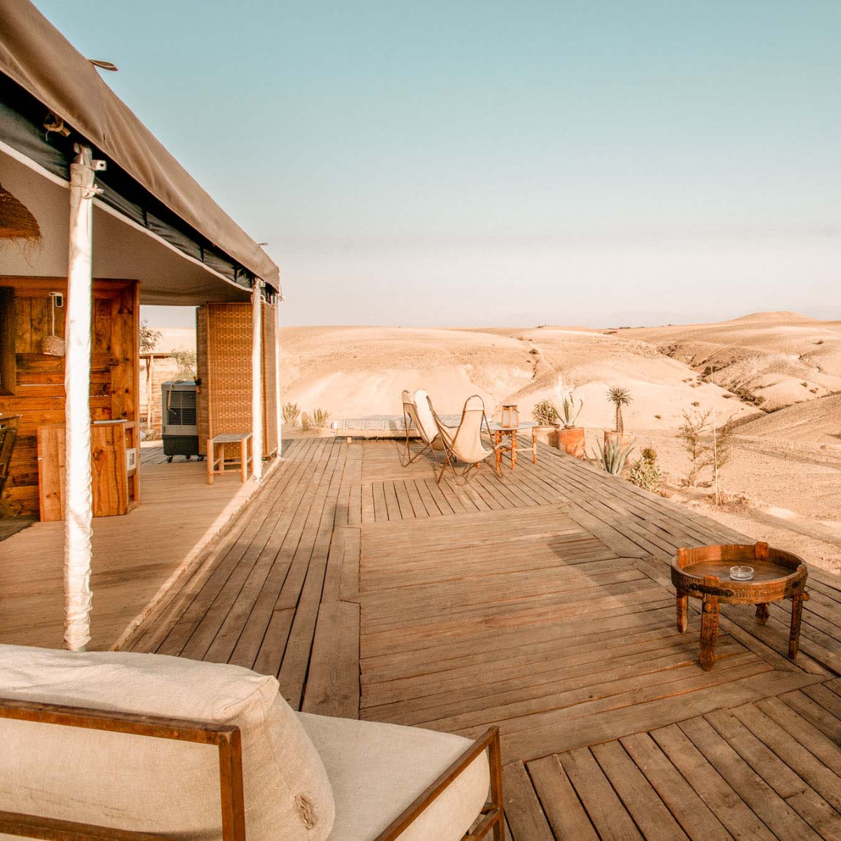Ein Jeep, der die Gäste des Inara Camps in nicht mal einer Stunde von Marrakesch über holprige Sandpisten ins Nichts bringt. Nicht ganz. Mittendrin befindet sich dieser großartige Glamping-Spot. Glamping, diese Mischung aus Camping und Glamour – was sich unvereinbar anhört, zählt zu den eindrücklichsten Reisemomenten überhaupt. Zimmer, Suiten? Im Inara Camp gilt ein anderes Vokabular. Man wohnt in Zelten, fühlt, wie der Wind auf die „Stoffwände“ trifft, öffnet keine Fenster, sondern rollt eine ganze textile Wand hoch. Das Drinnen, bestückt wie beim Filmklassiker „Lawrence von Arabien“ mit Holzboden und kolonialem Mobiliar, verschmilzt mit dem Draußen.
