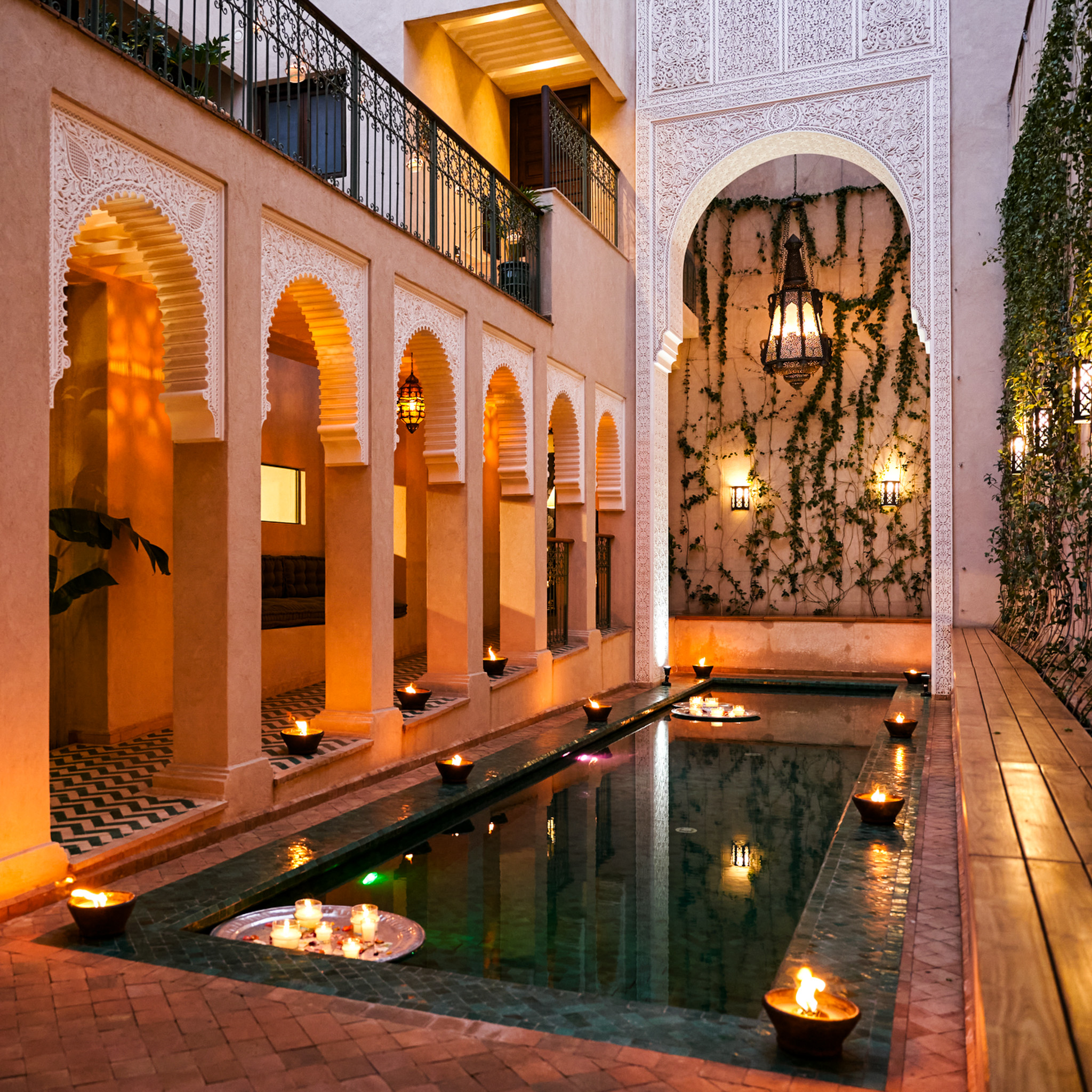 Marrakesch weiß mit Luxus-Unterkünften ganz besonders umzugehen. Ein Wasserbecken, das in einem Hof plätschert, umgeben vom Haus. Diese Riads haben die Marokkaner schon vor langer Zeit gebaut, ruhige und grüne Oasen inmitten der Stadt. Das Izza Marrakech ist ein solcher, fast schon magischer Ort. Gleich drei Innenhöfe, gerade einmal 14 wunderschöne Zimmer Suiten, hohe Bogen-Tore, marokkanische traditionelle und gegenwärtige Kunst – überhaupt ist Marrakesch auch ein Zentrum für moderne Kunst, nur zwei Beispiele, das Yves-Saint-Laurent-Museum und die Comptoir des Mines Galerie.