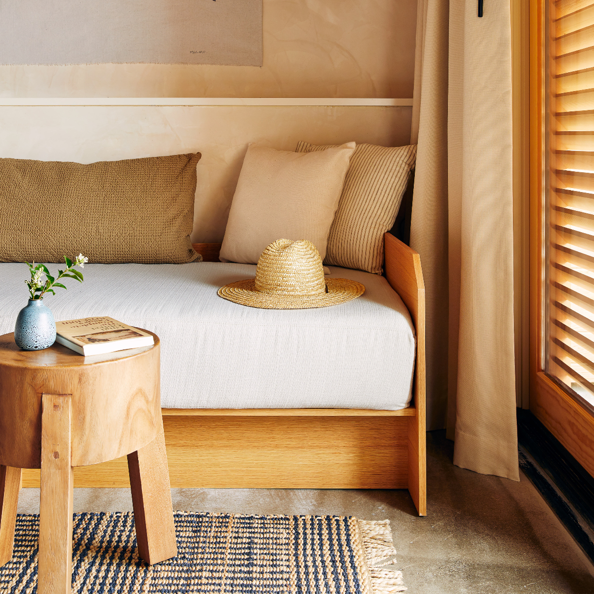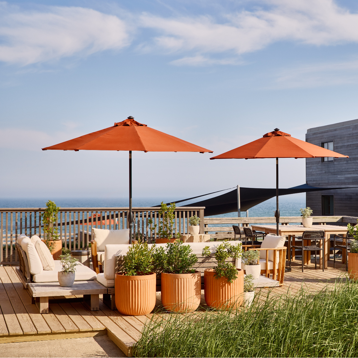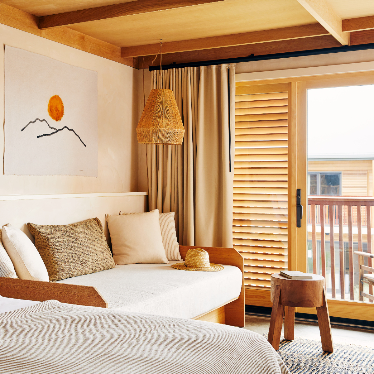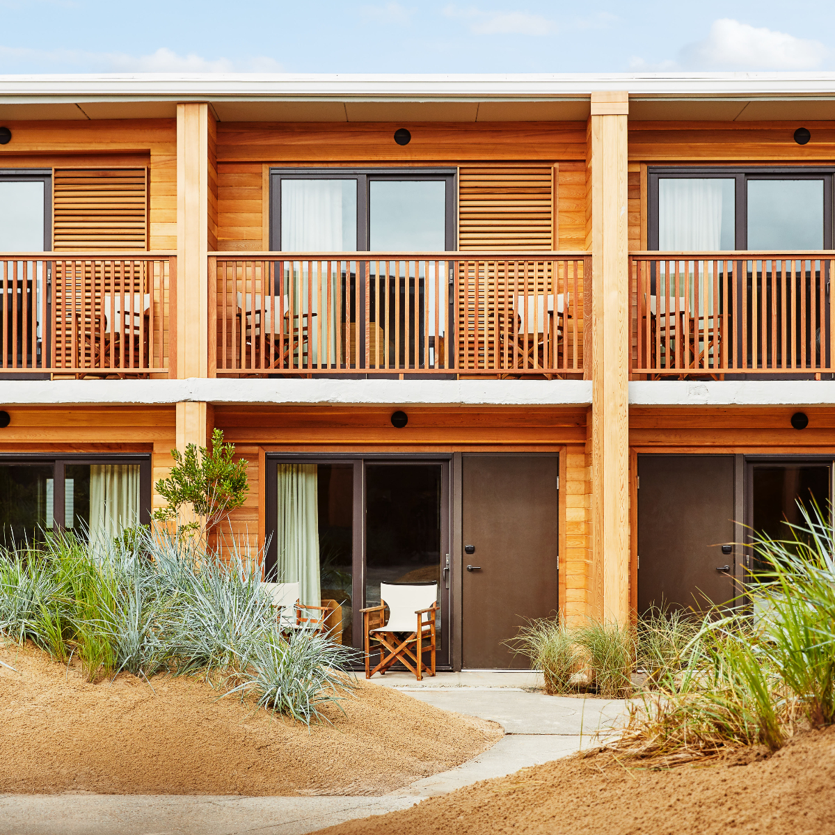 Über 96 Zimmer und Studios, neu sind zwei große Studios, verfügt das zweistöckig angelegte Marram mit seinen hölzernen Fassaden, das Zuhause auf Zeit, das zu neuen Perspektiven inspirieren soll. Entsprechend reduziert ist der behagliche Einrichtungsstil mit ruhigen hellen und gedeckten Farben, geflochtenen Lederbänken, Rattan-Lampenschirmen und Jute-Teppichen, der vom Brooklyner Designbüro The Post Company kreiert wurde.