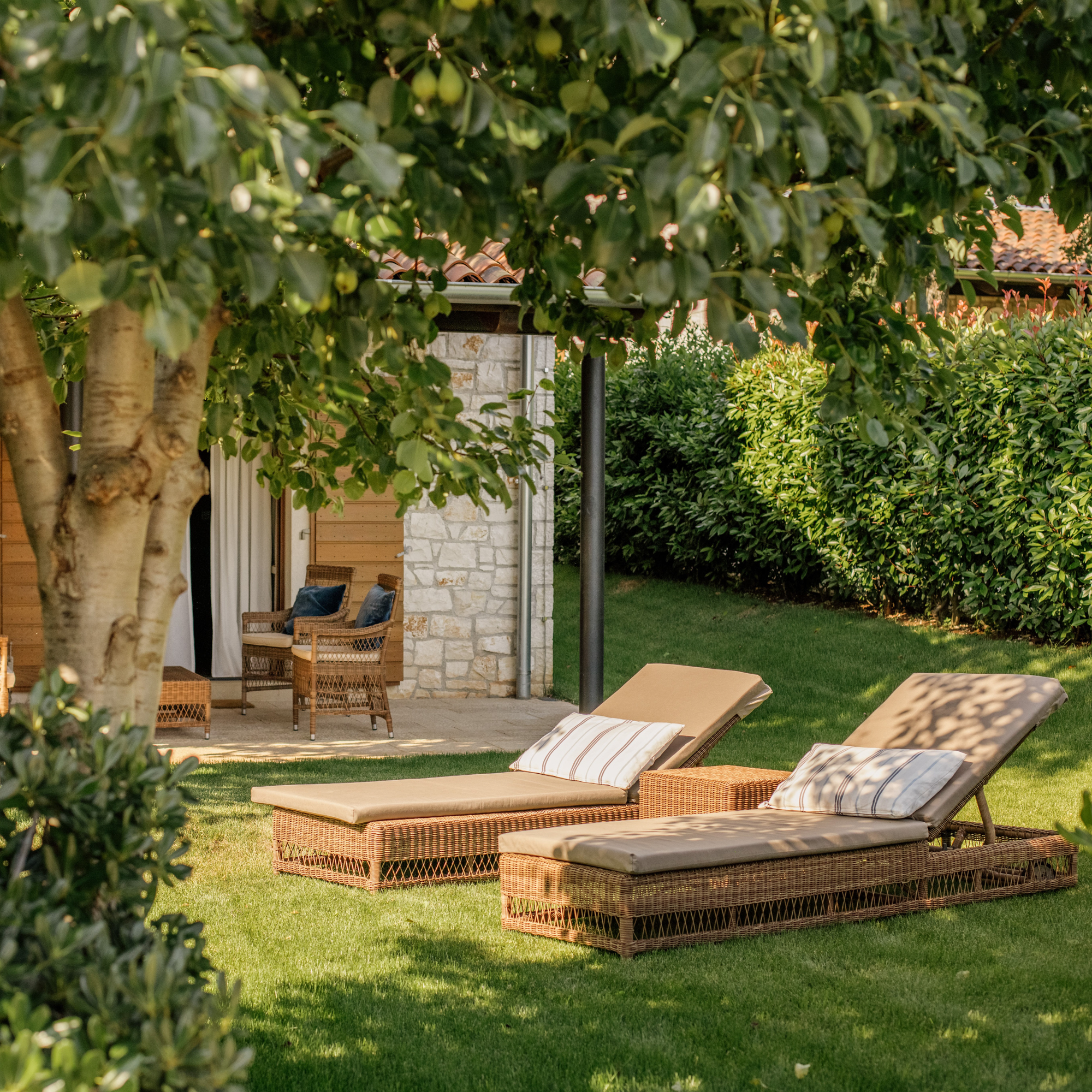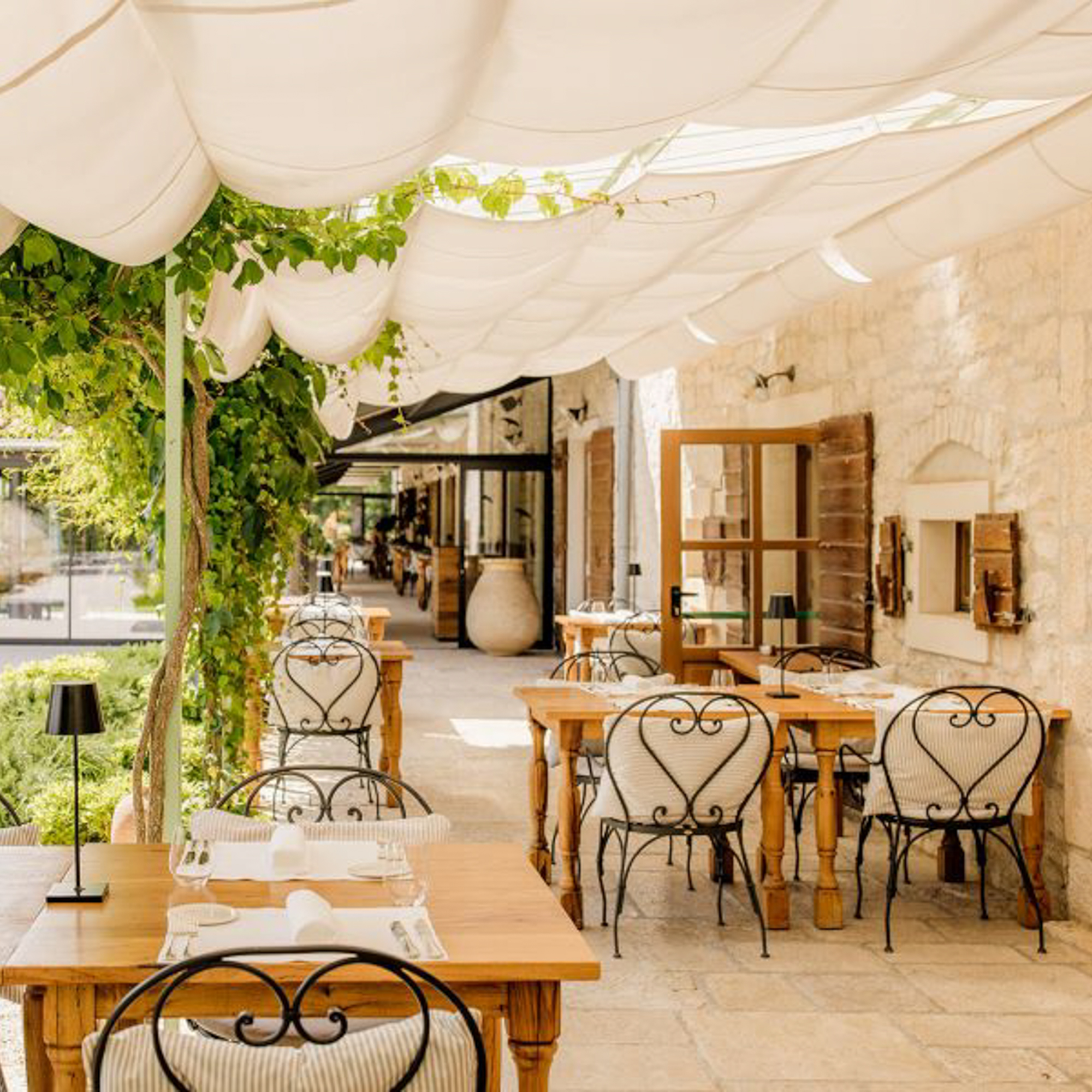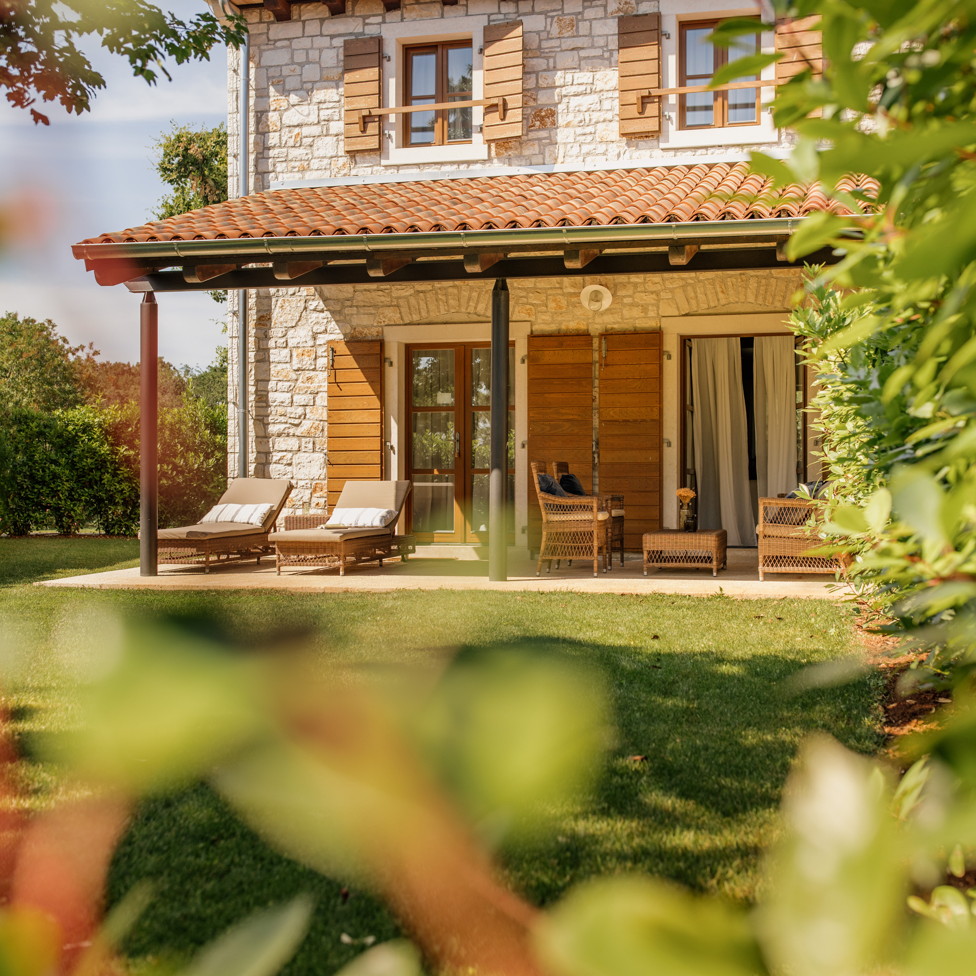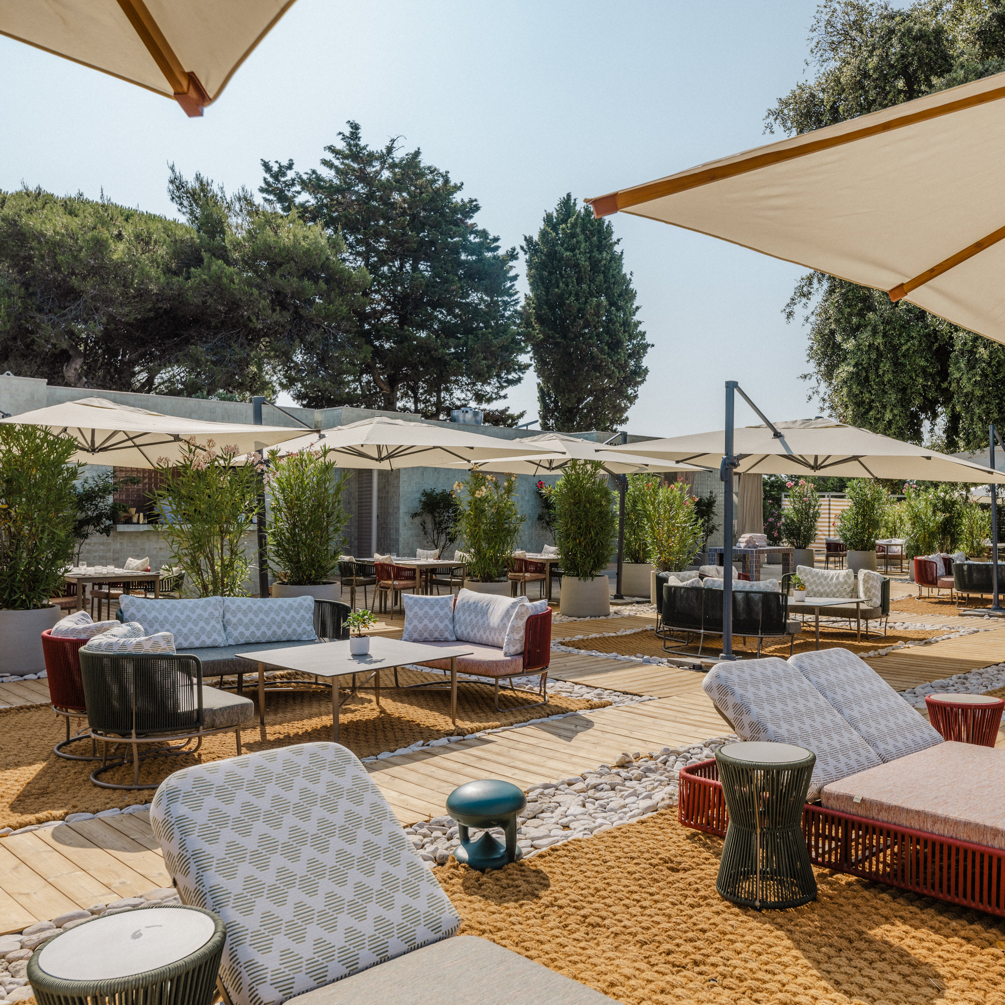 Die Architektur ist zurückhaltend, aber nicht kühl: Lokaler Stein, warmes Holz, natürliche Stoffe – nichts wirkt überladen, nichts ist laut. Man wohnt mitten in der Natur und hat zugleich das Gefühl, Teil eines durchdachten Konzepts zu sein. Viele der Villen öffnen sich zum Weinberg, die privaten Gärten duften nach Rosmarin und Thymian.