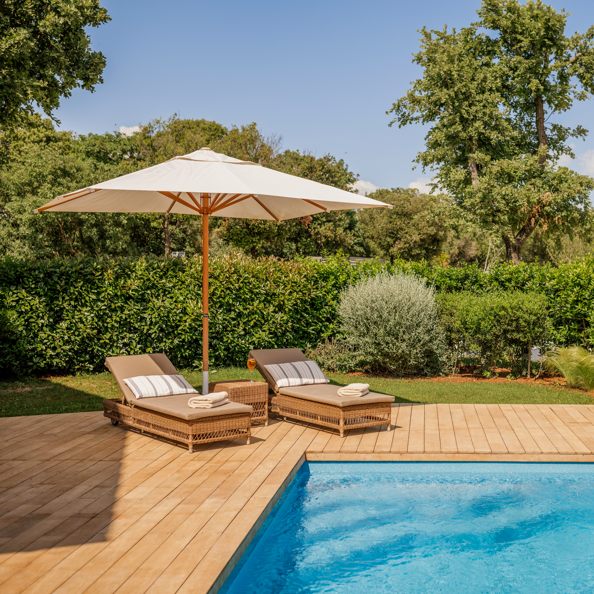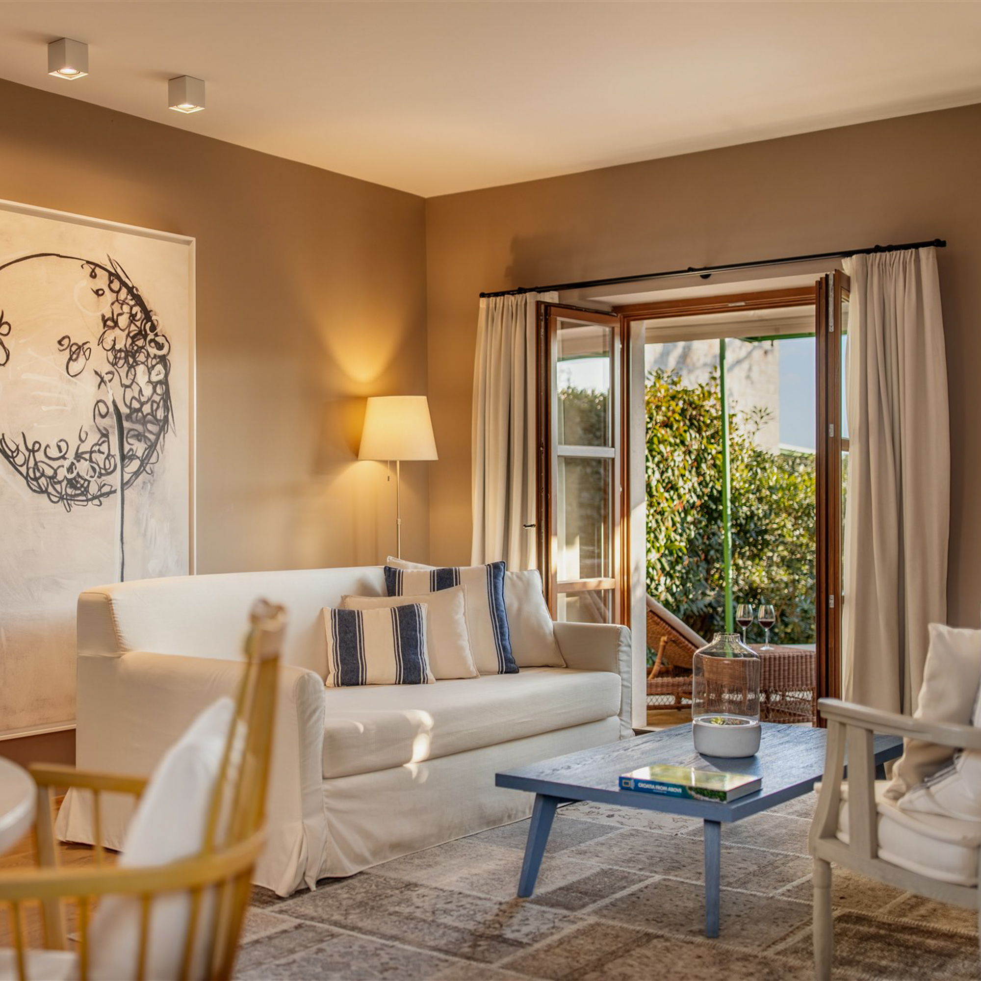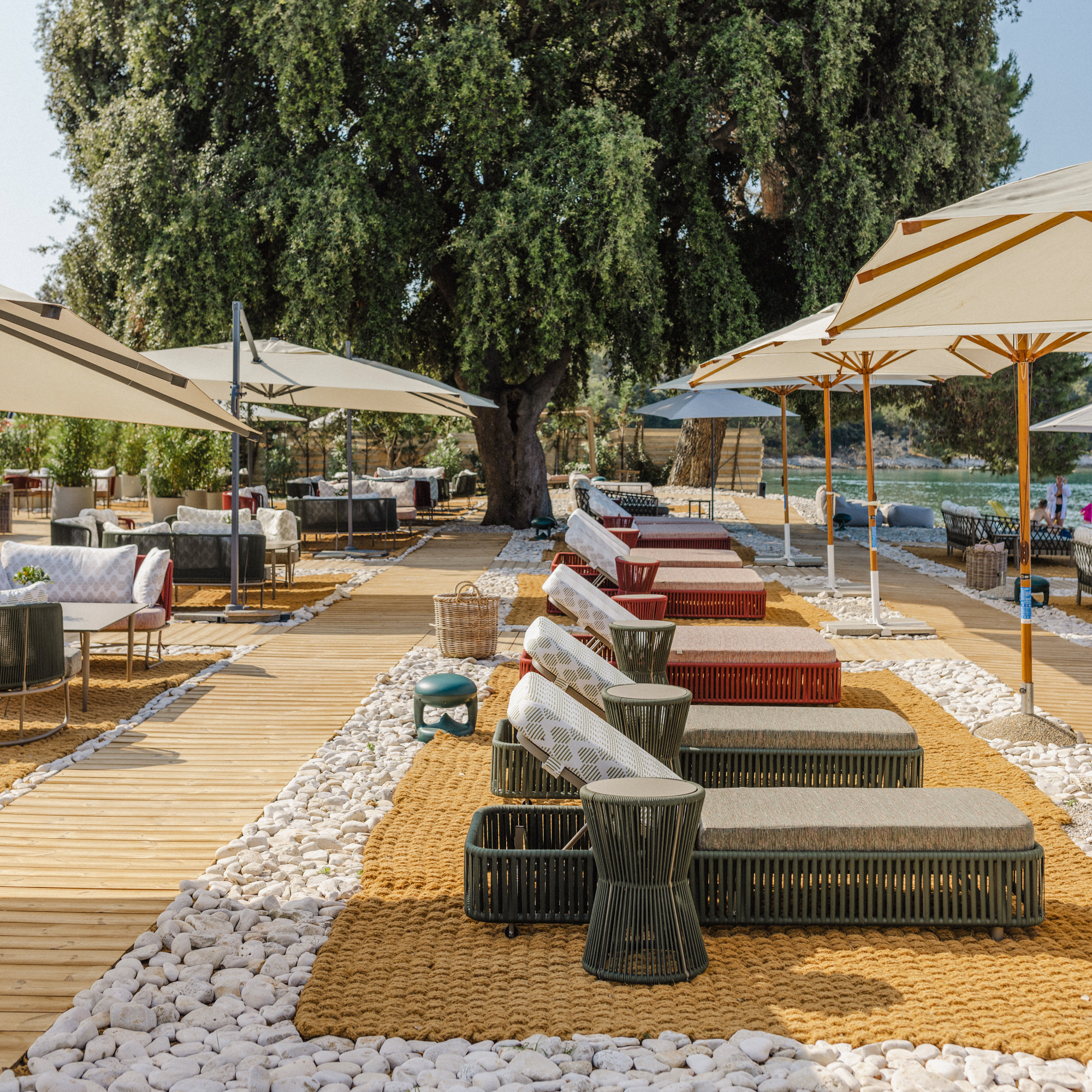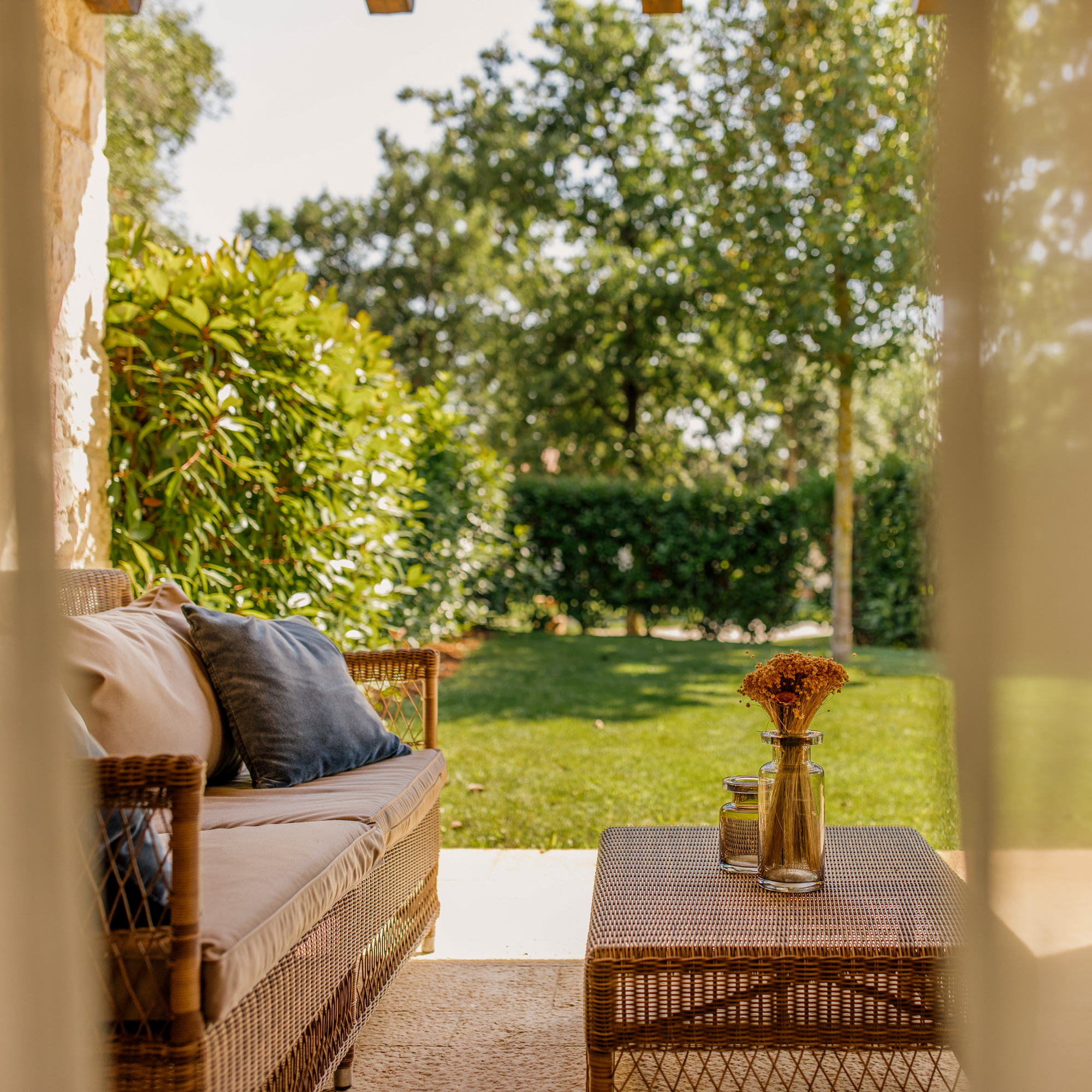 Die Architektur ist zurückhaltend, aber nicht kühl: Lokaler Stein, warmes Holz, natürliche Stoffe – nichts wirkt überladen, nichts ist laut. Man wohnt mitten in der Natur und hat zugleich das Gefühl, Teil eines durchdachten Konzepts zu sein. Viele der Villen öffnen sich zum Weinberg, die privaten Gärten duften nach Rosmarin und Thymian.
