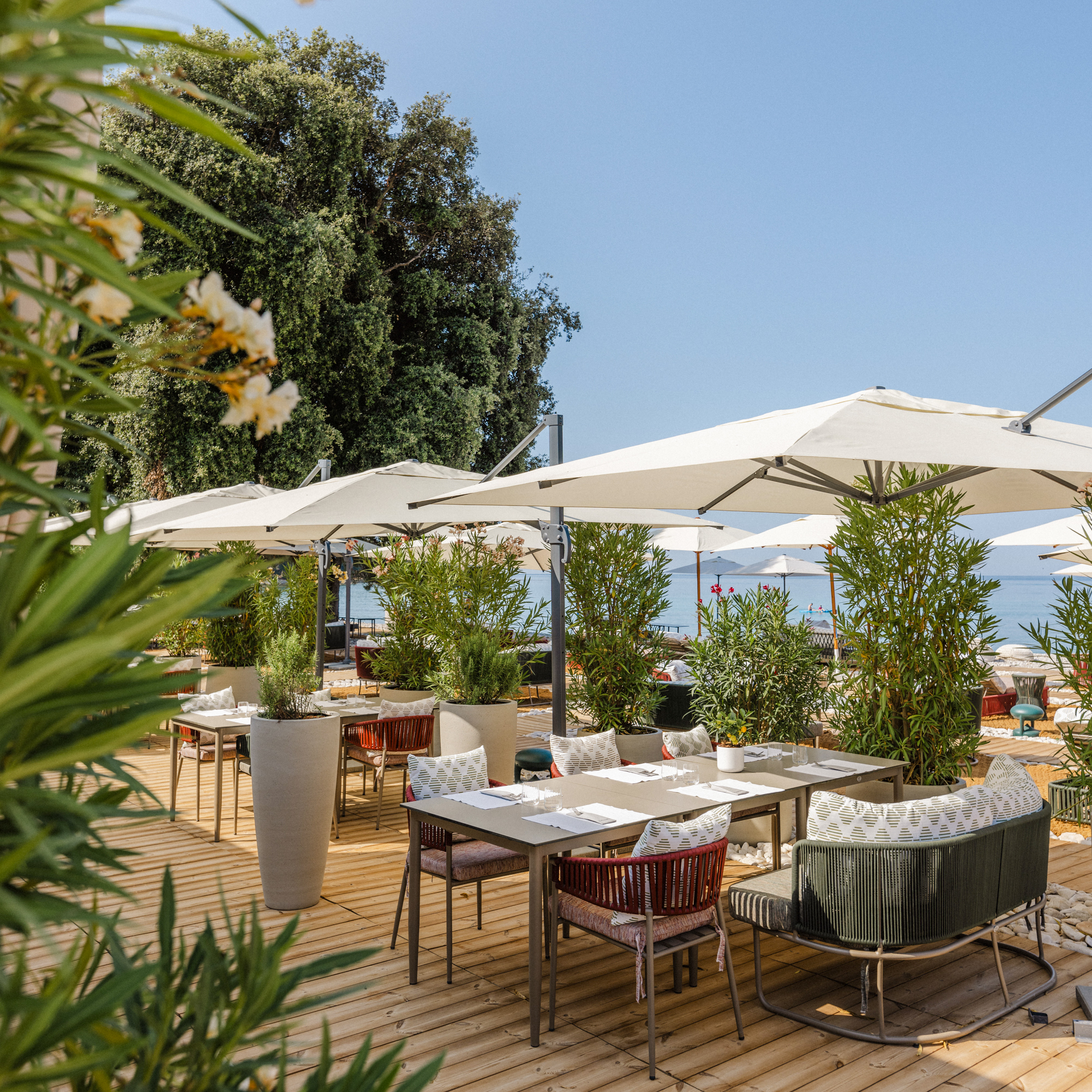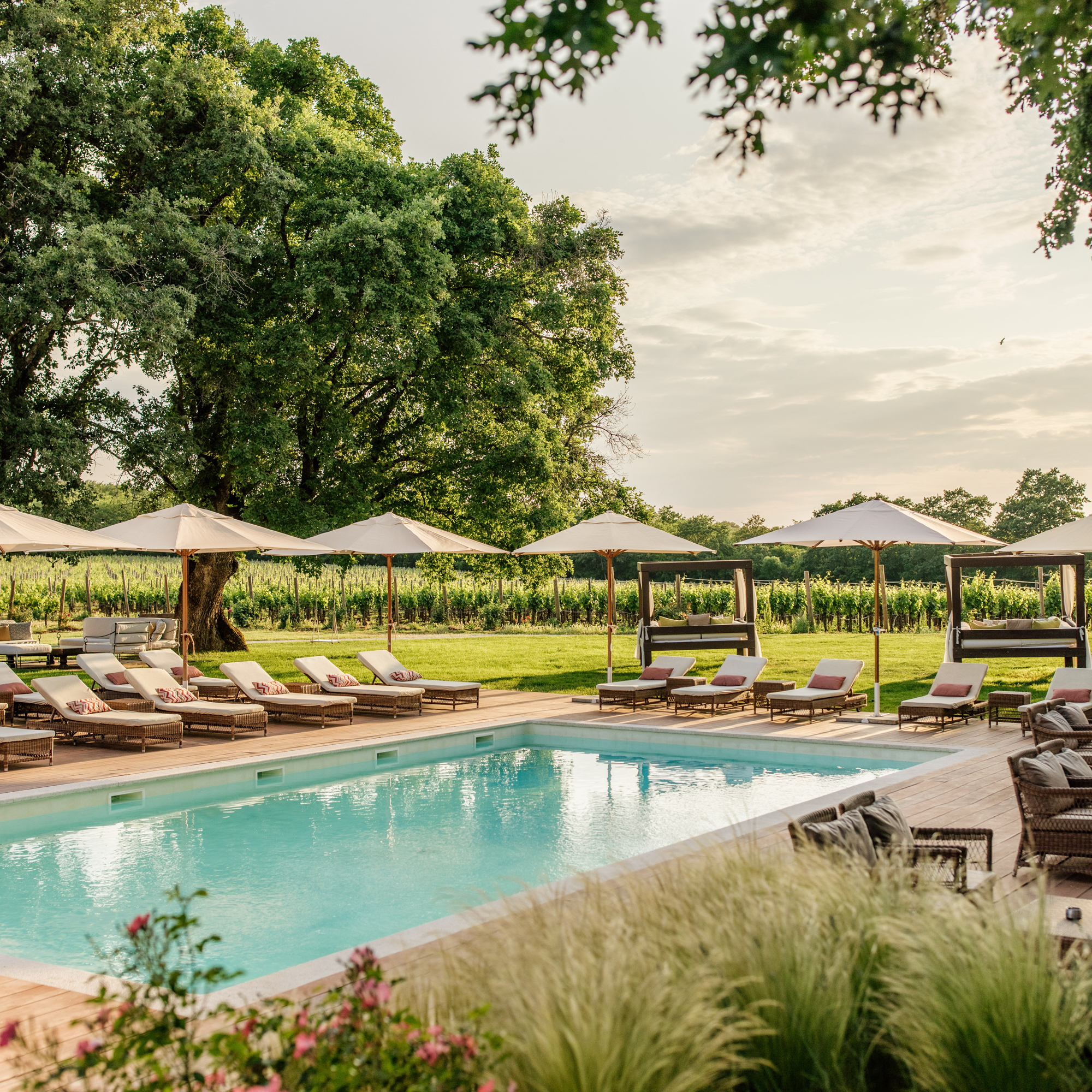 Tagsüber gibt es genug zu tun – oder nichts, wenn man das möchte. Yoga unter Pinien, Massagen im Spa, Weinproben im Keller, Fahrradtouren durch die umliegenden Dörfer oder einfach ein stiller Nachmittag am Pool mit Blick auf die Weinberge. Nur einen Spaziergang, oder eigenem Hotel-Beachtransfer, entfernt liegt das Meer, wo im Sommer 2025 der neue Meneghetti Beach Club eröffnet – mit Restaurant und Lounge, die mediterrane Gelassenheit und Understatement vereinen. Am Abend dann: ein Spaziergang durch das goldene Licht, ein Glas Rotwein unter den Olivenbäumen, das Zirpen der Grillen.