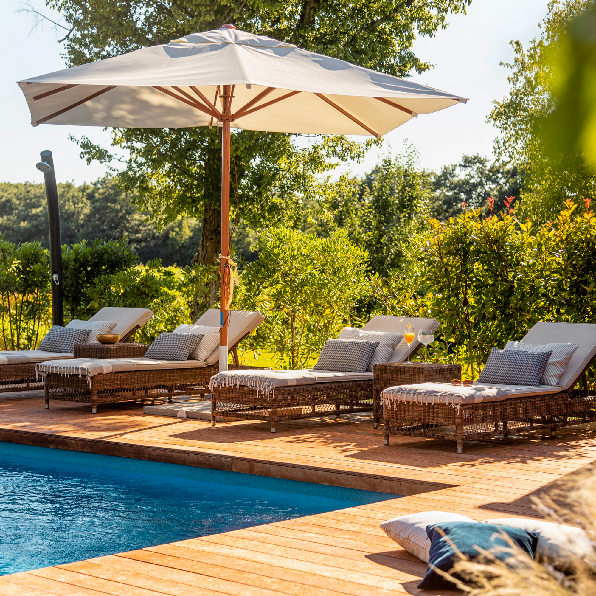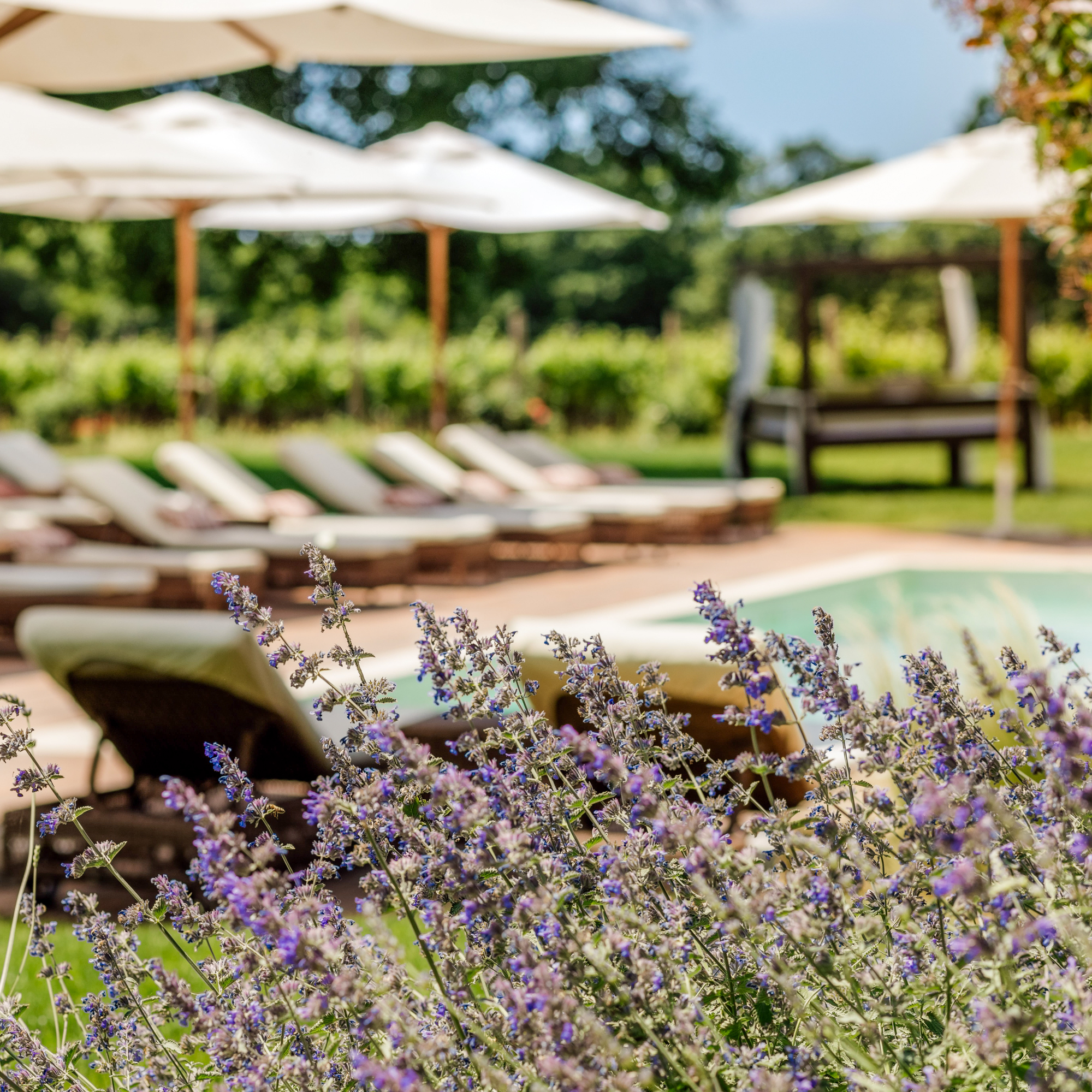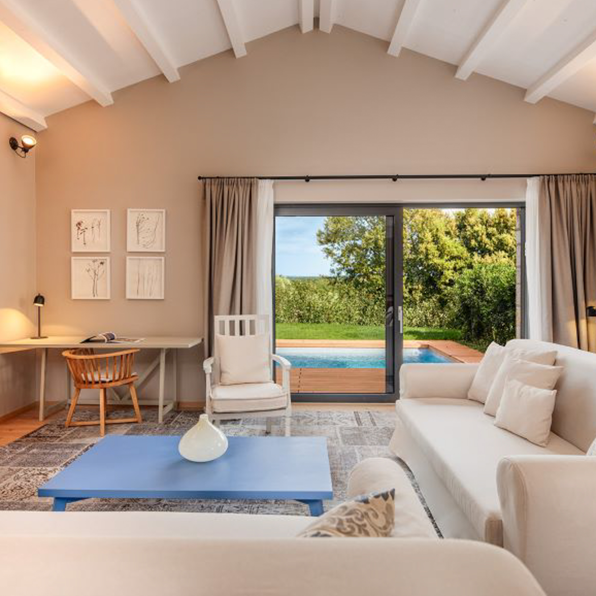 Heute stehen zwischen Natursteinmauern und alten Scheunen luxuriöse Villen mit privaten Pools, lichtdurchflutete Zimmer, ein eleganter Spa-Bereich und gleich mehrere Pools unter freiem Himmel. Alles fügt sich stimmig zu einem großen Ganzen. Es ist diese stille und schöne Harmonie aus Alt und Neu, aus Reduktion und Komfort, die sofort ein Gefühl von Ankommen erzeugt.