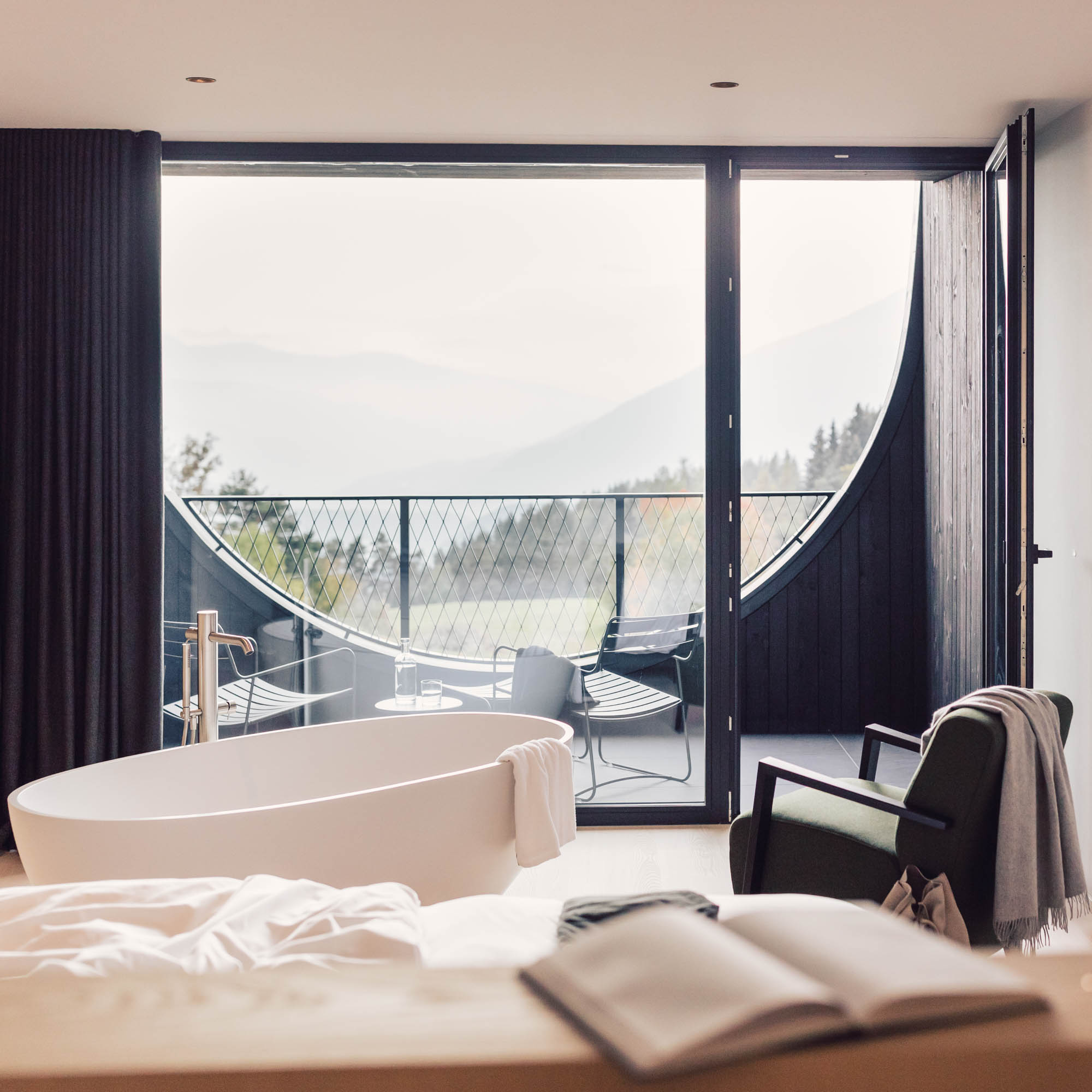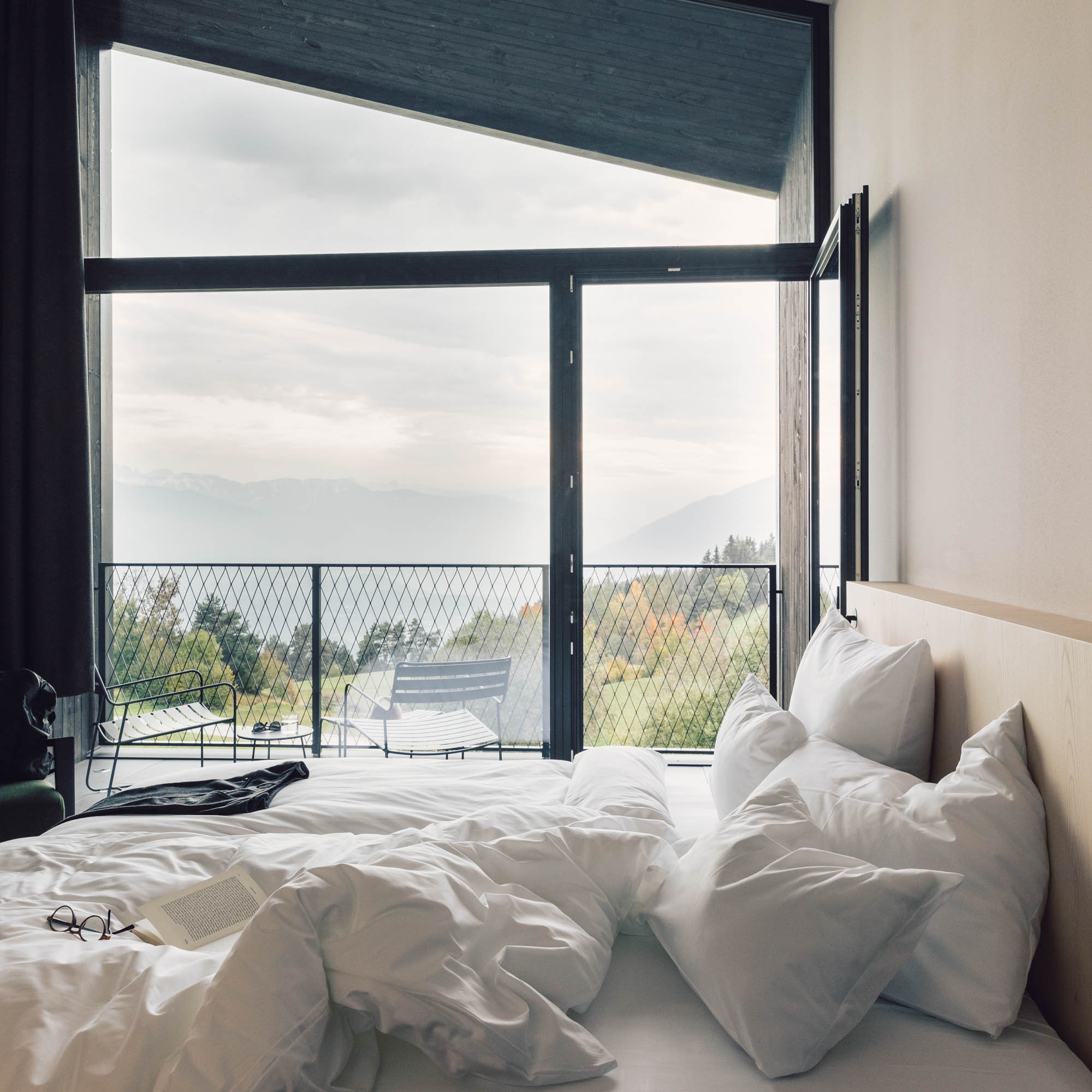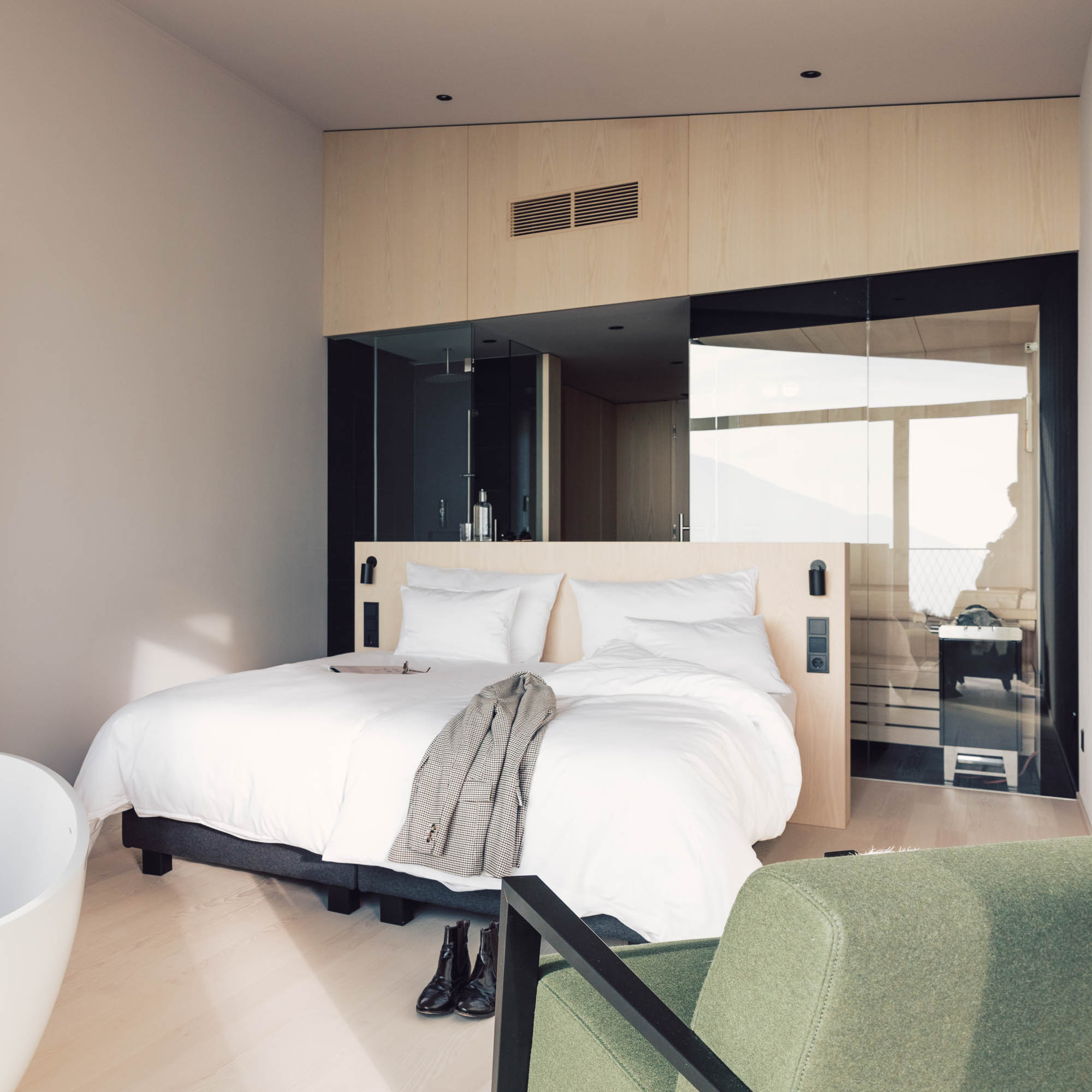 Die Natur ist immer greifbar. Wir sind angekommen, um gefühlt eine Ewigkeit zu bleiben. Durch die deckenhohen und bodentiefen Fenster der Rückzugsorte, so werden im Milla Montis die hellen, in sanften und ruhigen Farben gehaltenen, edel-purisitschen Zimmer und Suiten bezeichnet, gibt es keine Grenzen, nur fließende Übergänge. Was auch dazu führt, dass es richtig Spaß macht und ungemein entspannt, hier Stubenhocker:in zu sein.