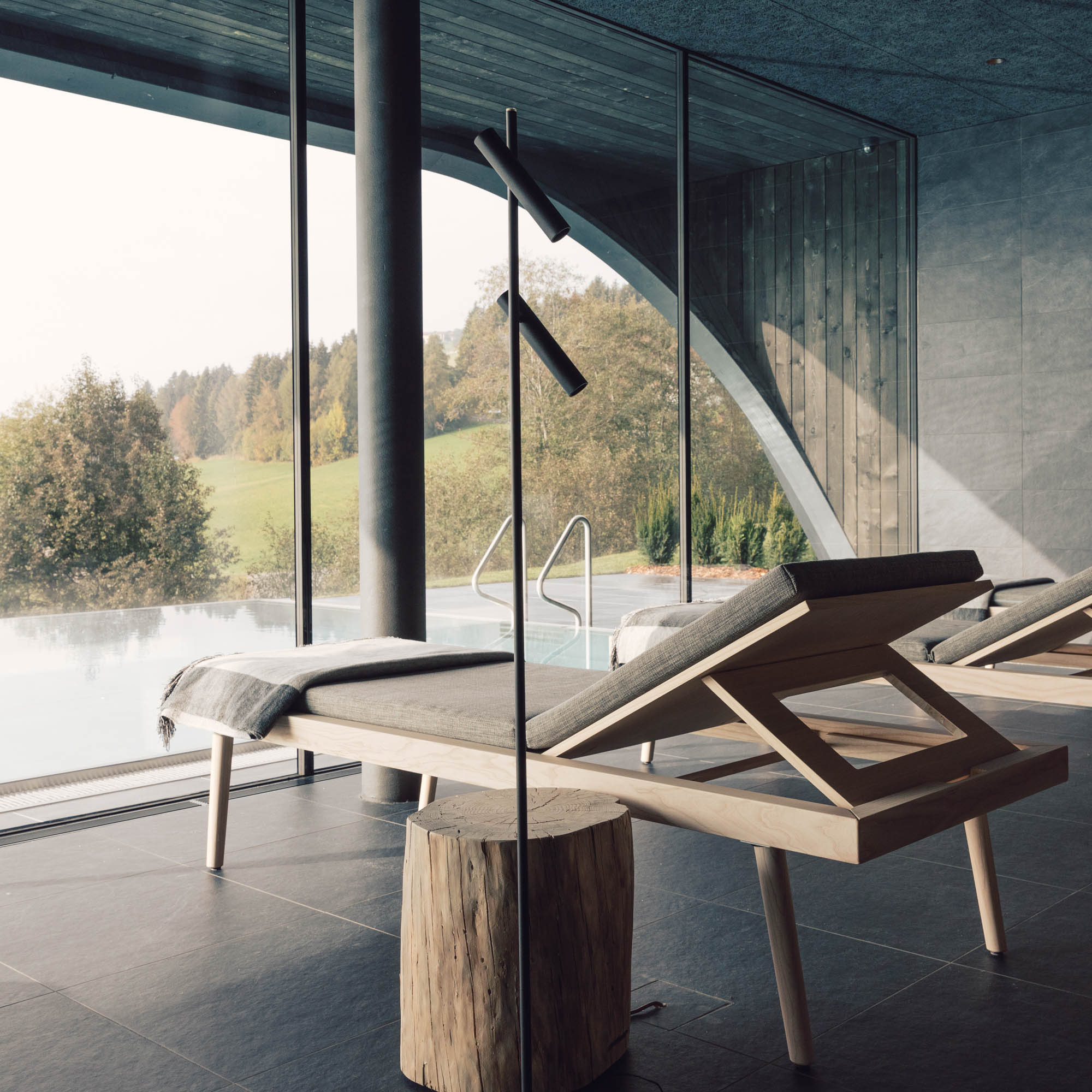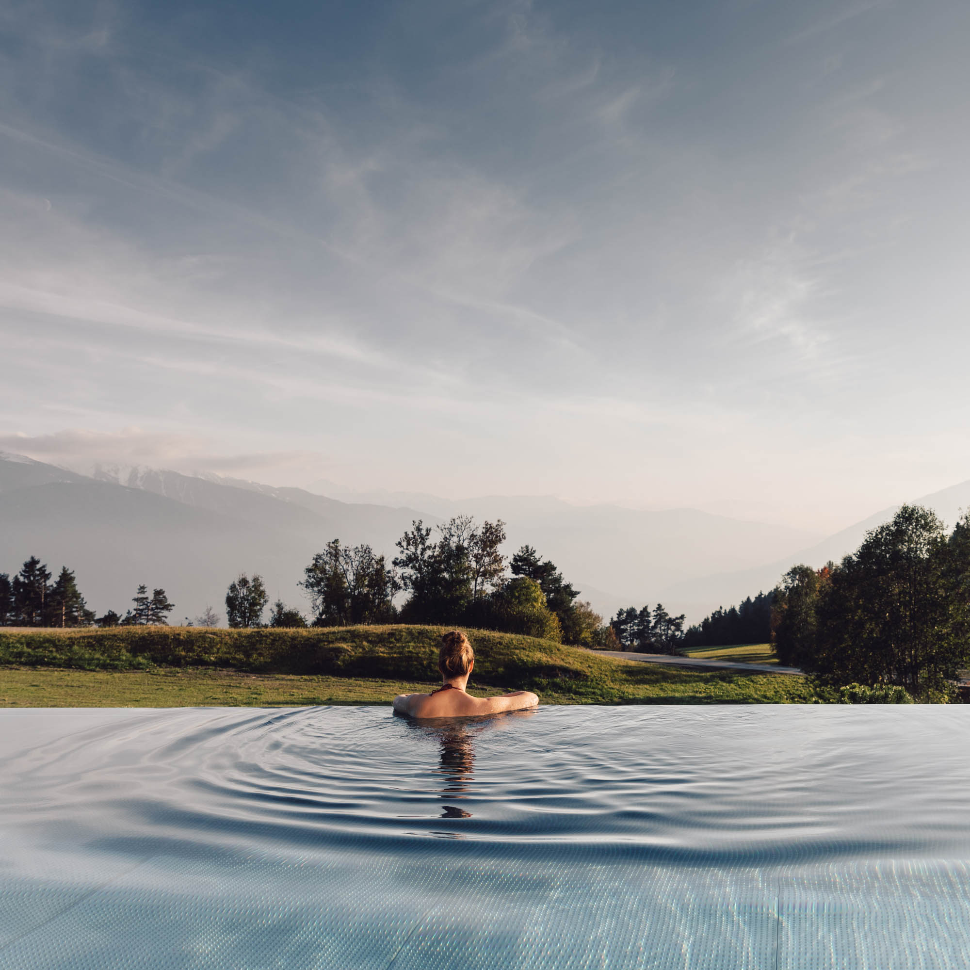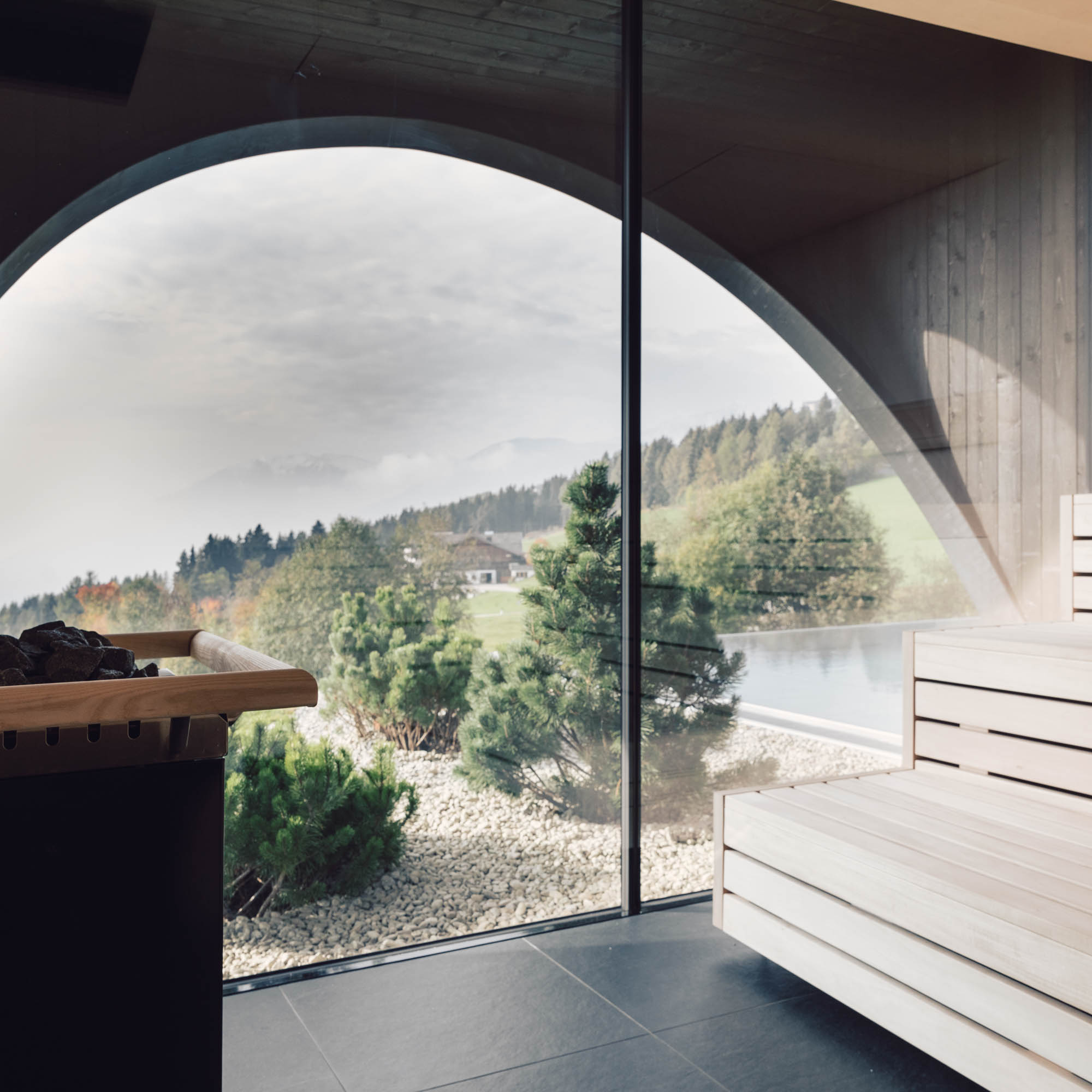Seine Inspirationsquelle? Das, was schon da ist, die Berge und die bestehenden Häuser drum herum. Die Gipfel, die Dächer, sie finden sich im Milla Montis wieder. In den großen Glasscheiben spiegelt sich die Umgebung, immer anders, je nach Tageszeit. Wellness für die Augen, Tiefenentspannung, und auf einmal ist sie wieder da, die Lust und Freude, auf Entdeckungstour zu gehen, etwas, das im Alltag viel zu kurz kommt.