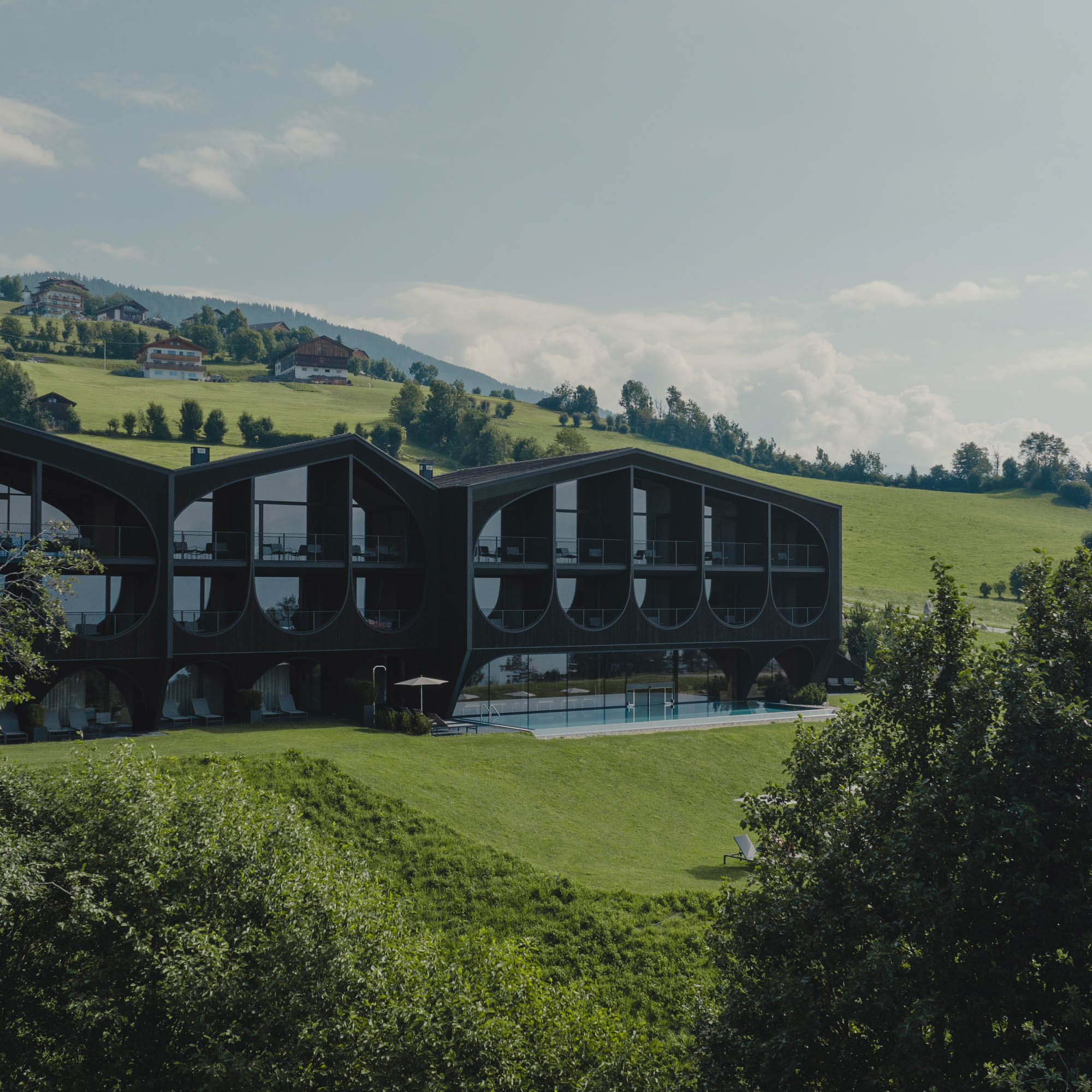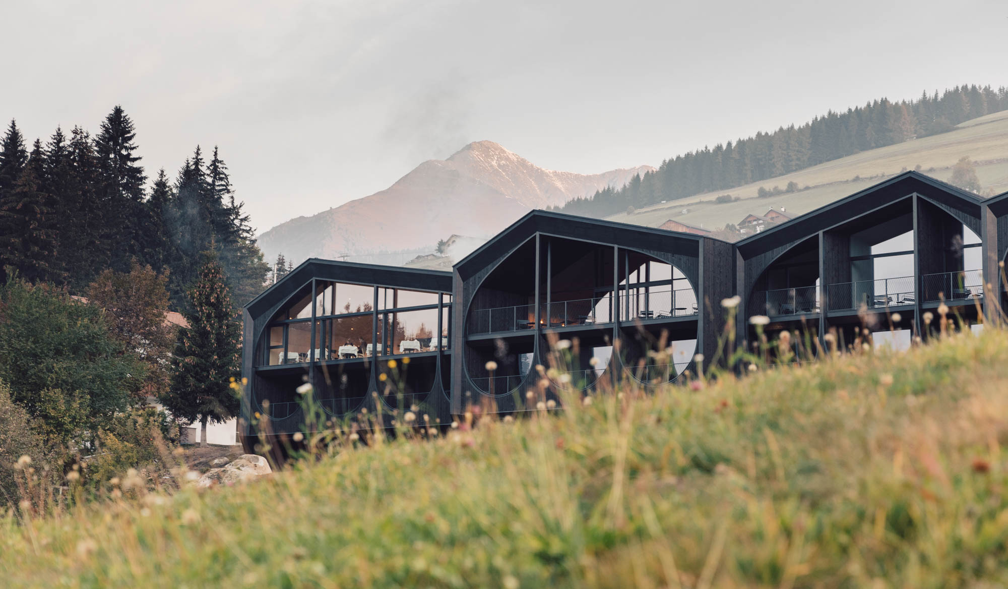 Andererseits locken uns die Berge, die Wiesen und Almen wie von unsichtbaren Fäden gezogen hinaus. Erst einmal wird die Aufmerksamkeit jedoch vom Milla Montis an sich in Anspruch genommen. Der Architekt Peter Pichler hat einen ziemlich modernen Bau erschaffen, der es jedoch spielerisch schafft, mit der Natur zu harmonieren.