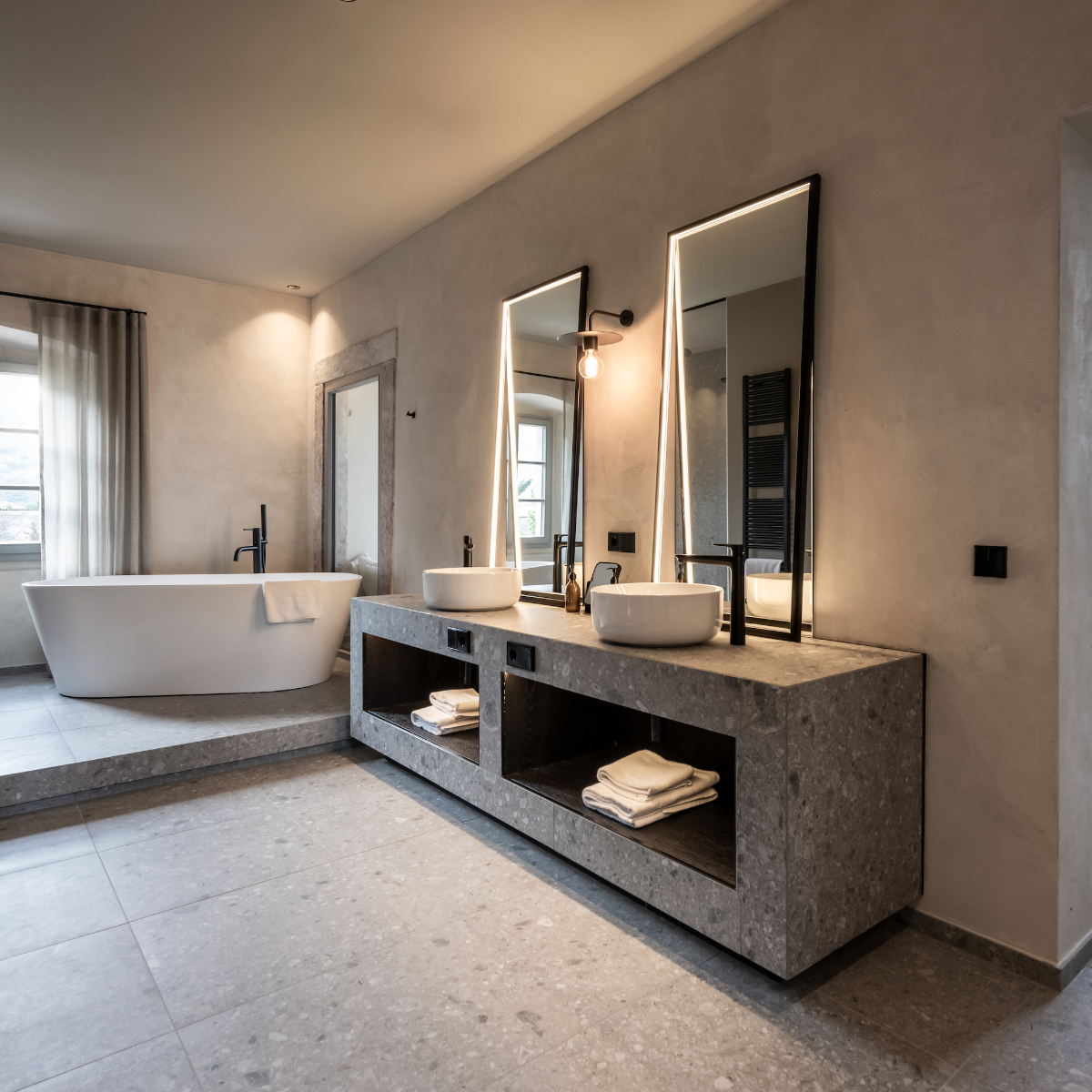 Bei der Wahl des Interieurs für sämtliche Bereiche des Hauses wurde auf elegante Schlichtheit, moderne Ästhetik und Hochwertigkeit gesetzt. In den Zimmern gibt es alles, was man braucht, aber keinen Überfluss. Die Details in mattem schwarz sind edel, funktional und fügen sich nahtlos in die Gestaltung der Räumlichkeiten an. Die Farbigkeit aller Zimmer und Flure ist in unaufgeregten, erdigen, kreidigen Tönen gehalten.