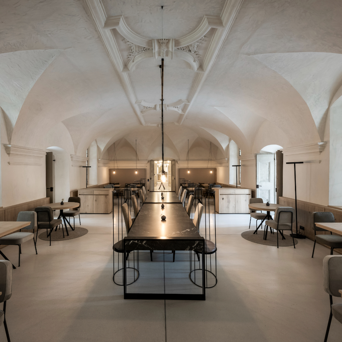 Dem preisgekrönten Architektur und Designbüro noa* ist es gelungen, die klösterliche Ästhetik und Atmosphäre zu erhalten und das Gebäude mitsamt seines Innenlebens weiter zu entwickeln. In den monumentalen, erhabenen Räumen des ehemaligen Klosters wurde der Charme der geschichtsträchtigen Architektur und die ruhige, meditative Atmosphäre bewahrt.
