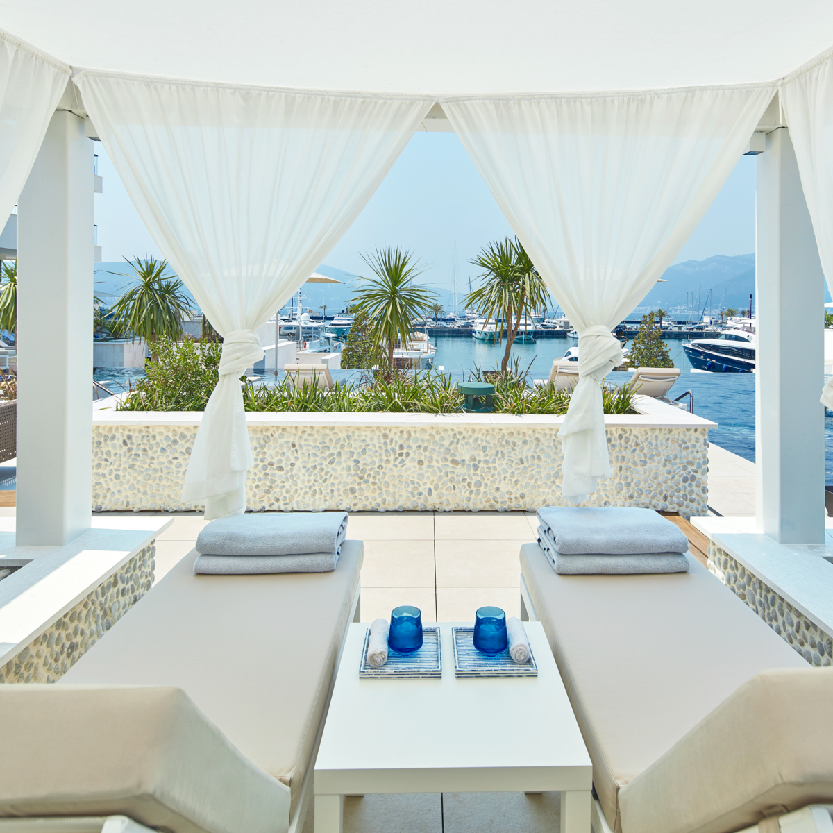 Die Marina ist ein Heimathafen für viele schöne Yachten - der größte der Adria. Dementsprechend erfahren ist das Regent Porto Montenegro darin, einer anspruchsvollen Kundschaft den perfekten Aufenthalt zu bieten. Die Anlage ist zweigeteilt in Hotel und Apartments. Der Hotel-Teil mit Restaurant und Bars ist in einem modern-maritimen Stil gehalten, schlicht, aber schick. Optisch soll er an das Innere einer solchen Yacht erinnern.