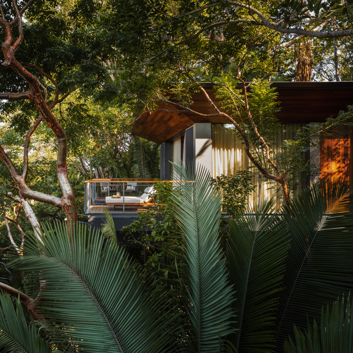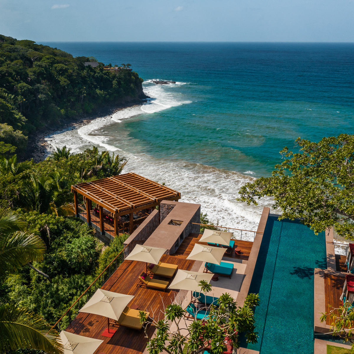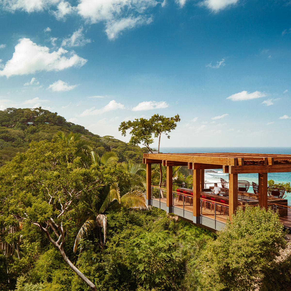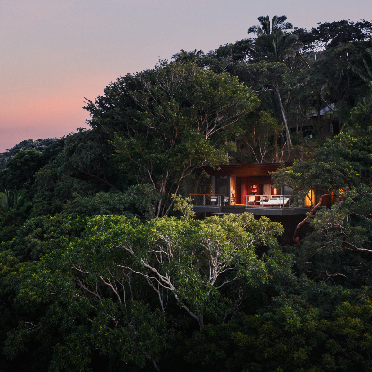 Steil stürzt sich der üppige Regenwald über vulkanische Felsen, die eine mächtige Klippenlandschaft formen. Zwölf Meter tief in den Ozean. Mittendrin, in versteckter Lage, gehen die 105 terrassenförmig angelegten Villen eine Symbiose mit der Natur ein. Erbaut als ökologische Designer-Baumhäuser, öffnen sie sich als Treehouses dem Regenwald, als Ocean Treehouses in verschiedenen Kategorien auch spektakulär zum Pazifischen Ozean.