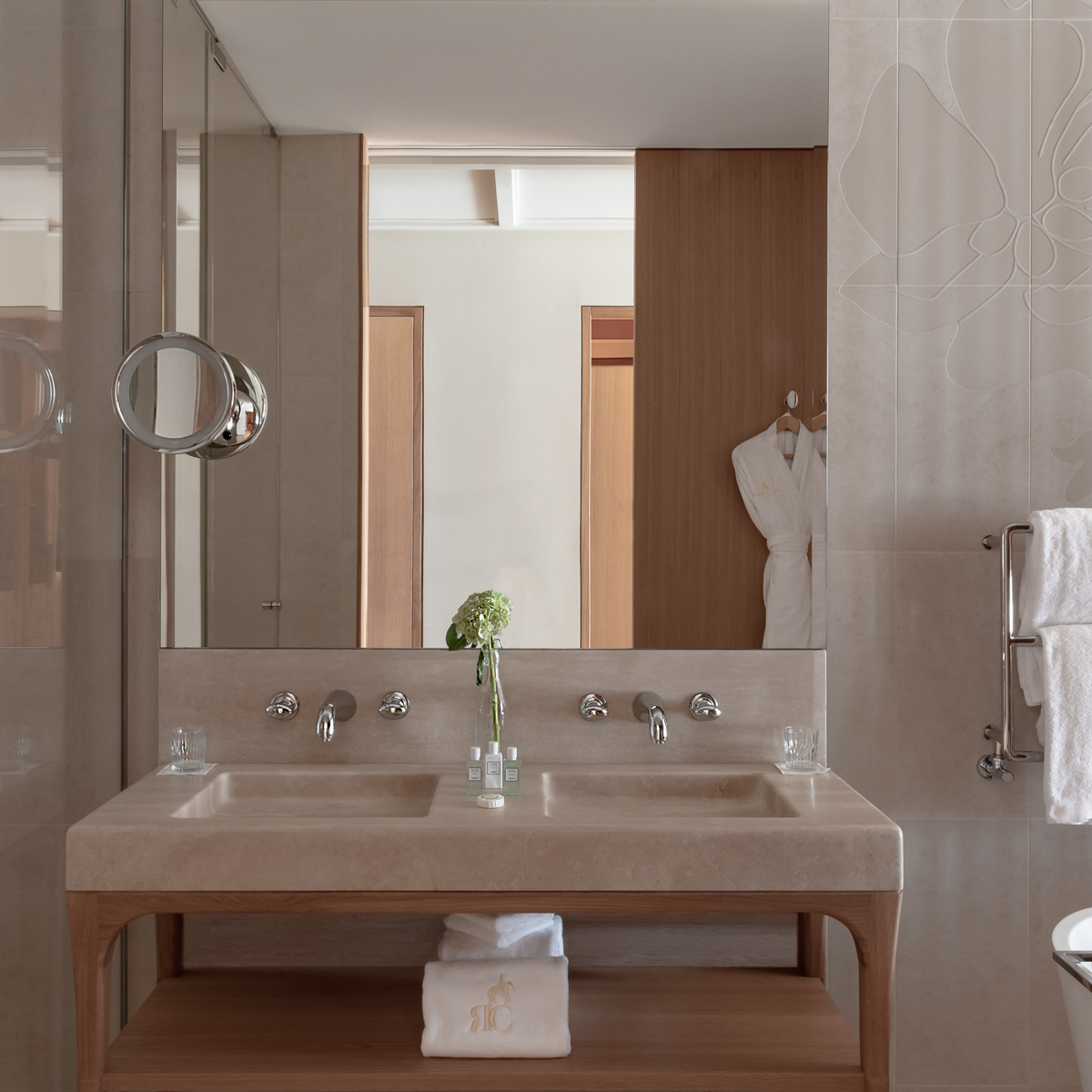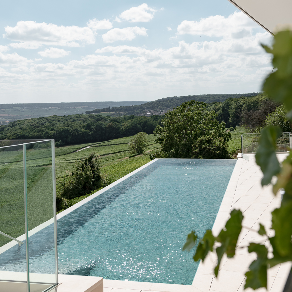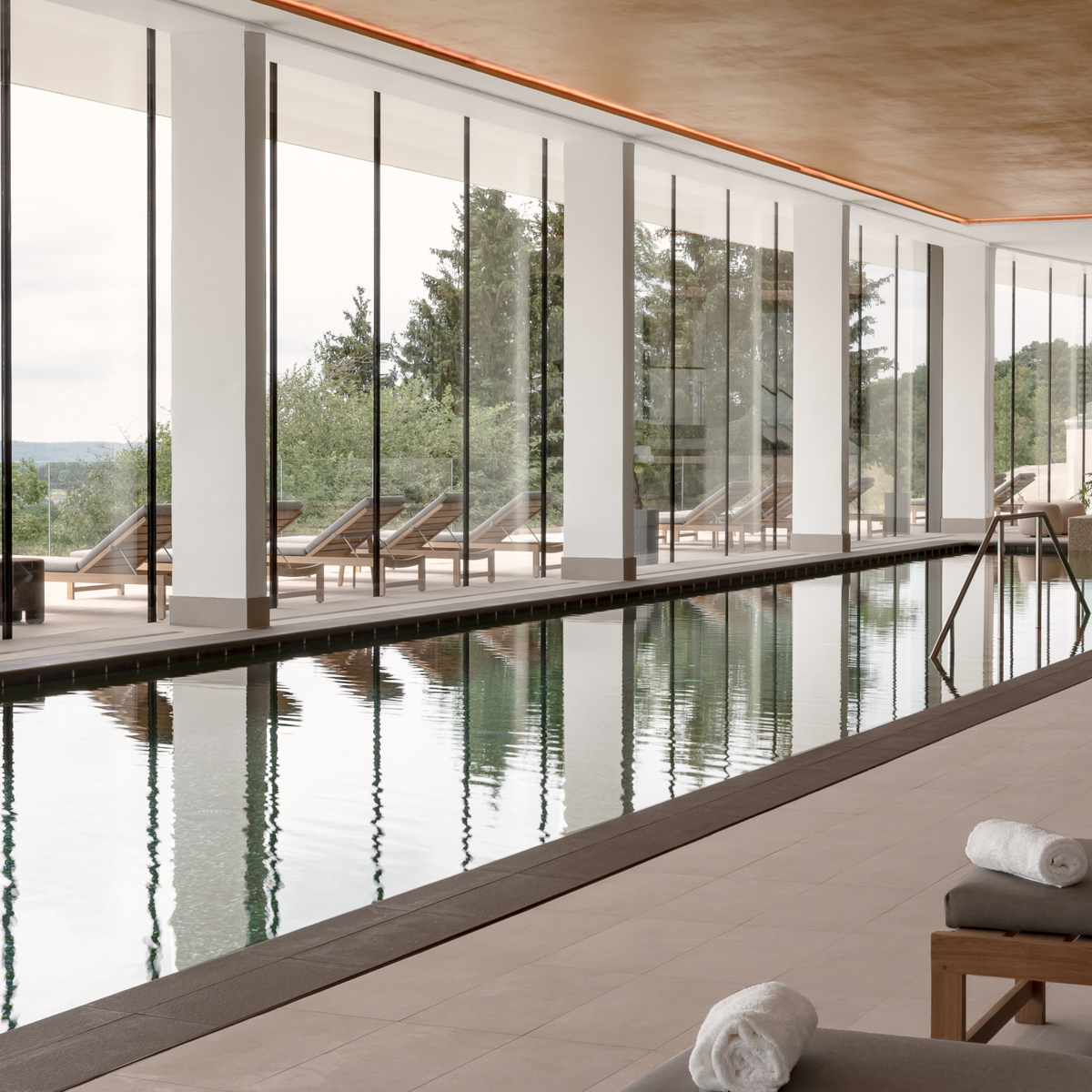 Für noch mehr Entspannung sorgen ein exklusives Hammam, verschiedene Saunen und eine Yoga-Raum und dank der großen Fensterfront hält der Blick auf die umliegenden Champagner-Reben auch bei kälteren Temperaturen hier Einzug und lässt den 25 Meter langen Indoor-Swimmingpool in hellem Tageslicht erstrahlen. Auch der große Infinity-Pool lädt dazu ein, den Blick über die zarten Weinhügel schweifen zu lassen.