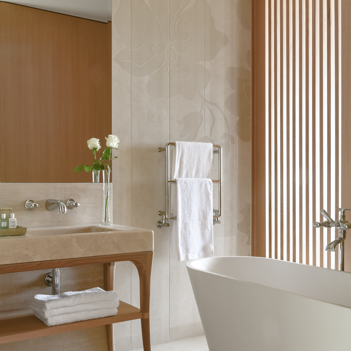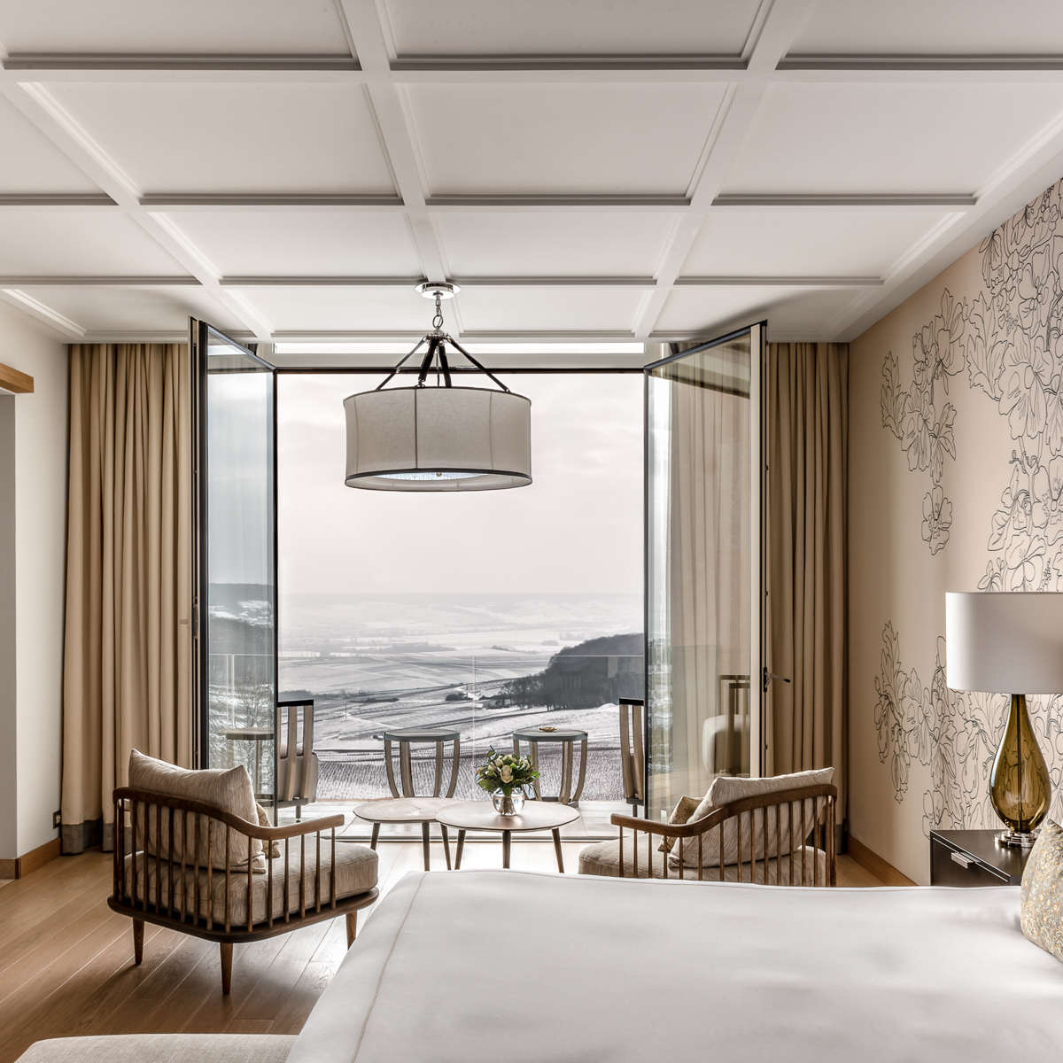 Ein Post-Haus aus dem 19. Jahrhundert und ein überaus moderner Flügel mit 47 Suiten bilden ein Amphitheater, das dem eindrucksvollen Anblick der Champagne den Vortritt lässt. Das Design von Sybille de Margerie kontrastiert mit viel Holz und Stein die Farben der wilden Natur rundherum. Warme Farben und klassische Formen treten mit moderneren Elementen und hochwertigsten Stoffen in Verbindung.