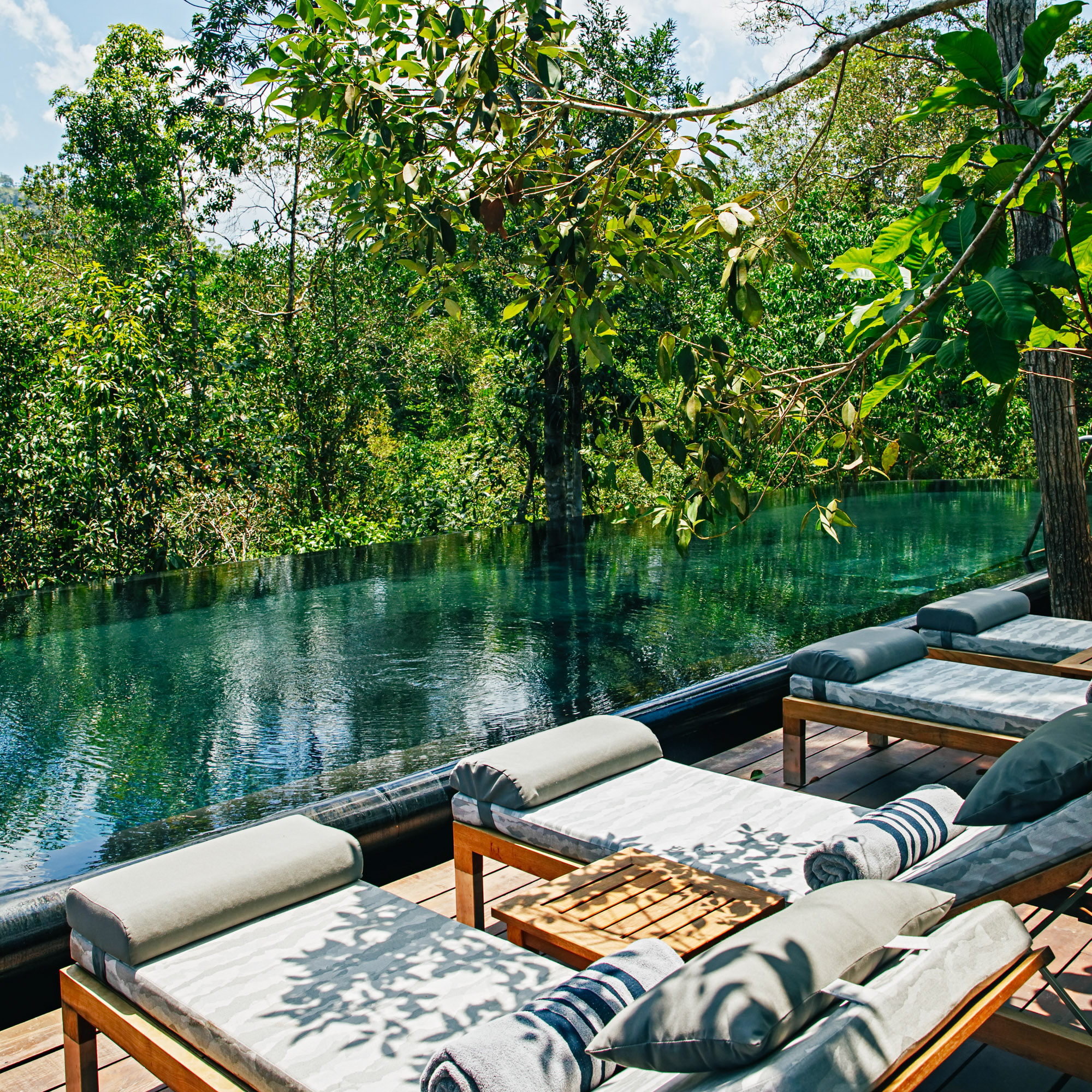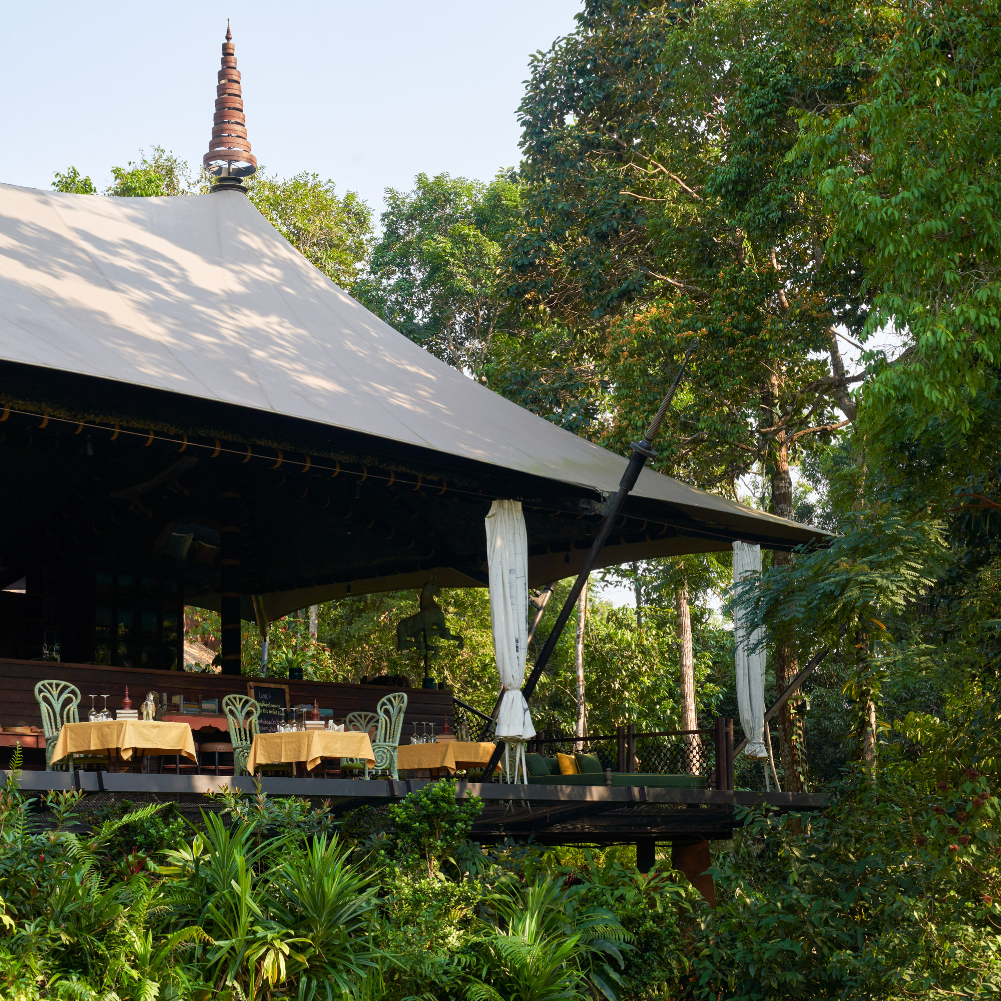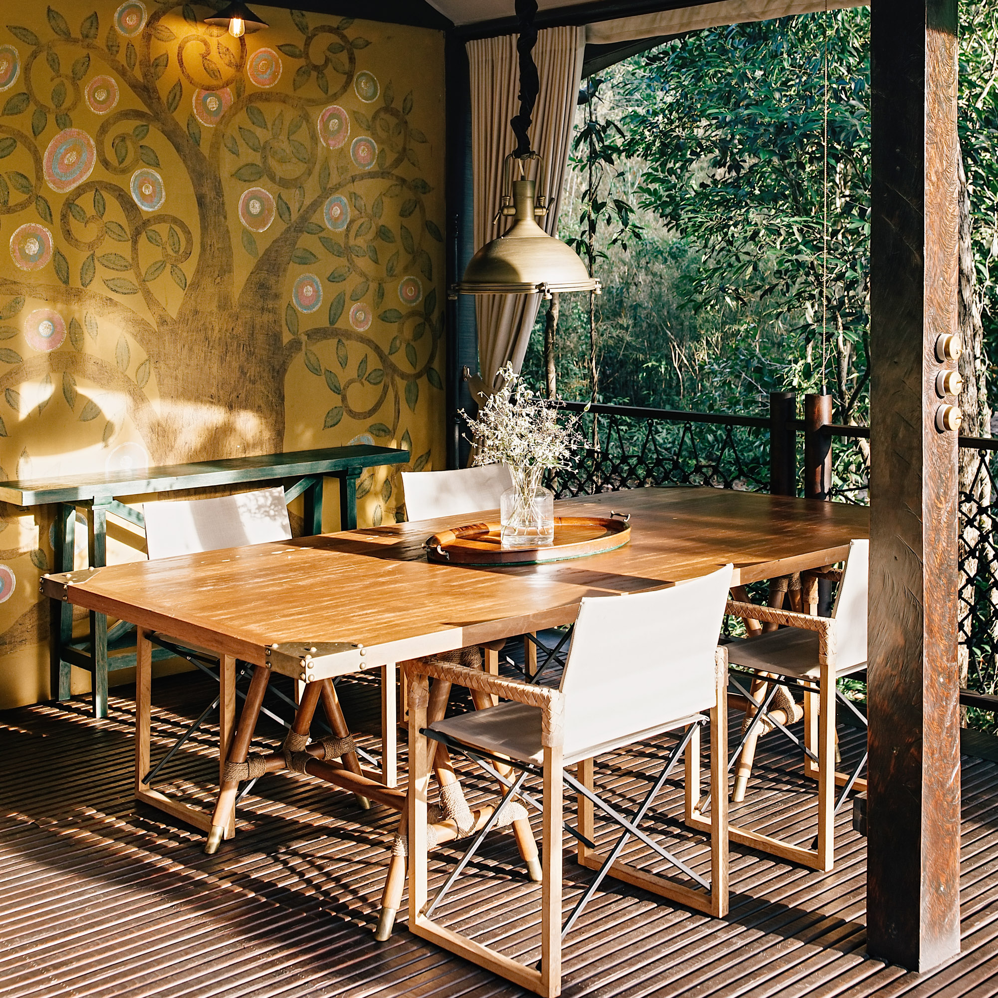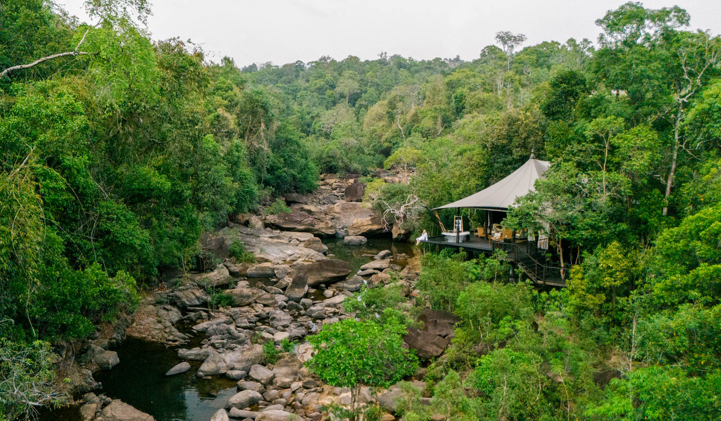 Was beim Glamping im arabischen Raum die Wüste und in Südafrika die Nationalparks sind, ist hier die Begegnung mit tropischem Grün und Wasser. Als Bill Bensley, einer der weltweit renommiertesten Hoteldesigner, vor ein paar Jahren dieses 350 Hektar große Stück Land kaufte, wollte er es vor Wilderei und Waldrodung schützen. Diese Mission besteht bis heute, nur dass er sich entschlossen hat, dort auch ein kleines Luxuscamp zu errichten.