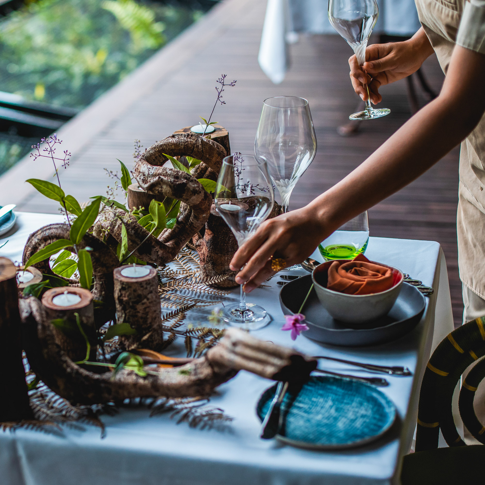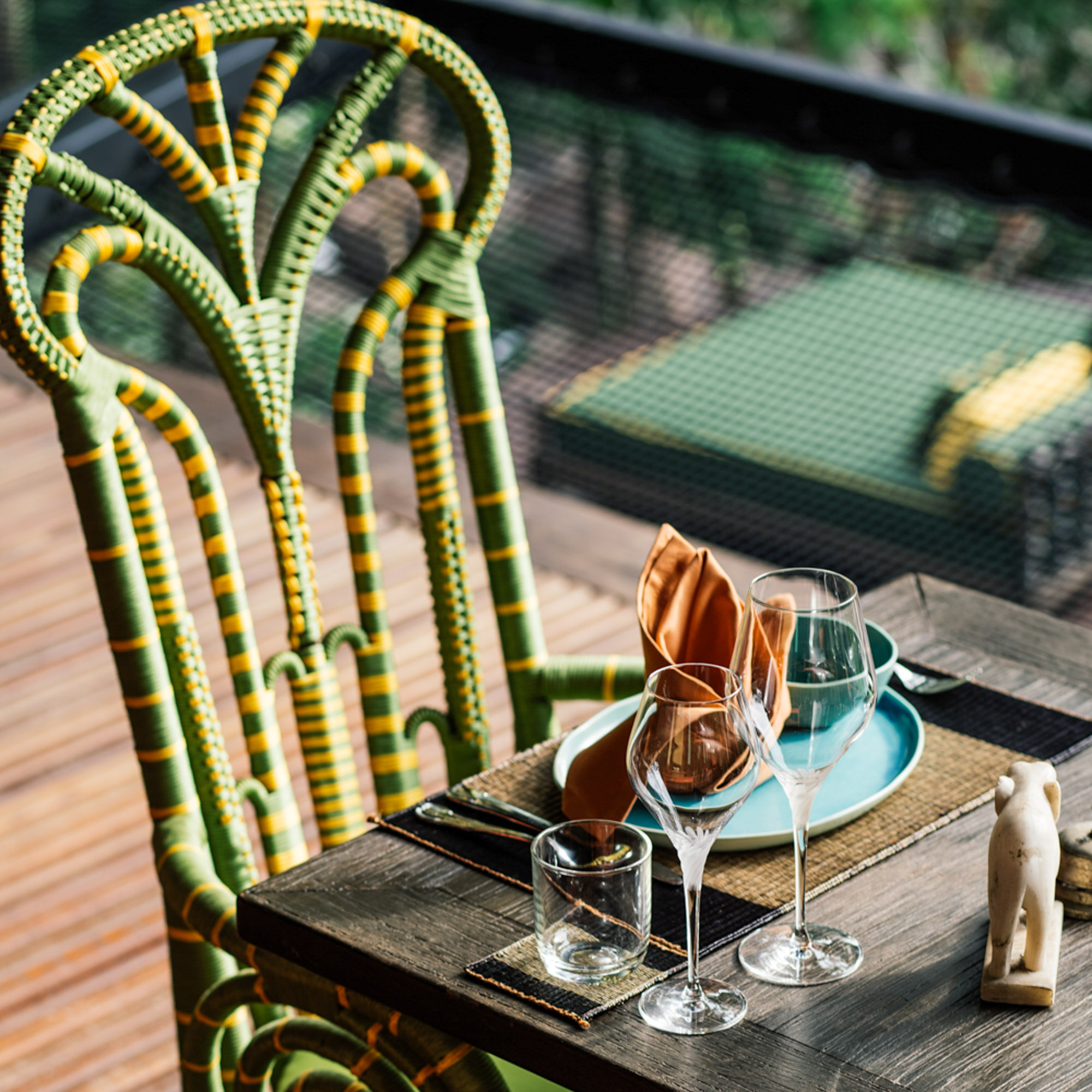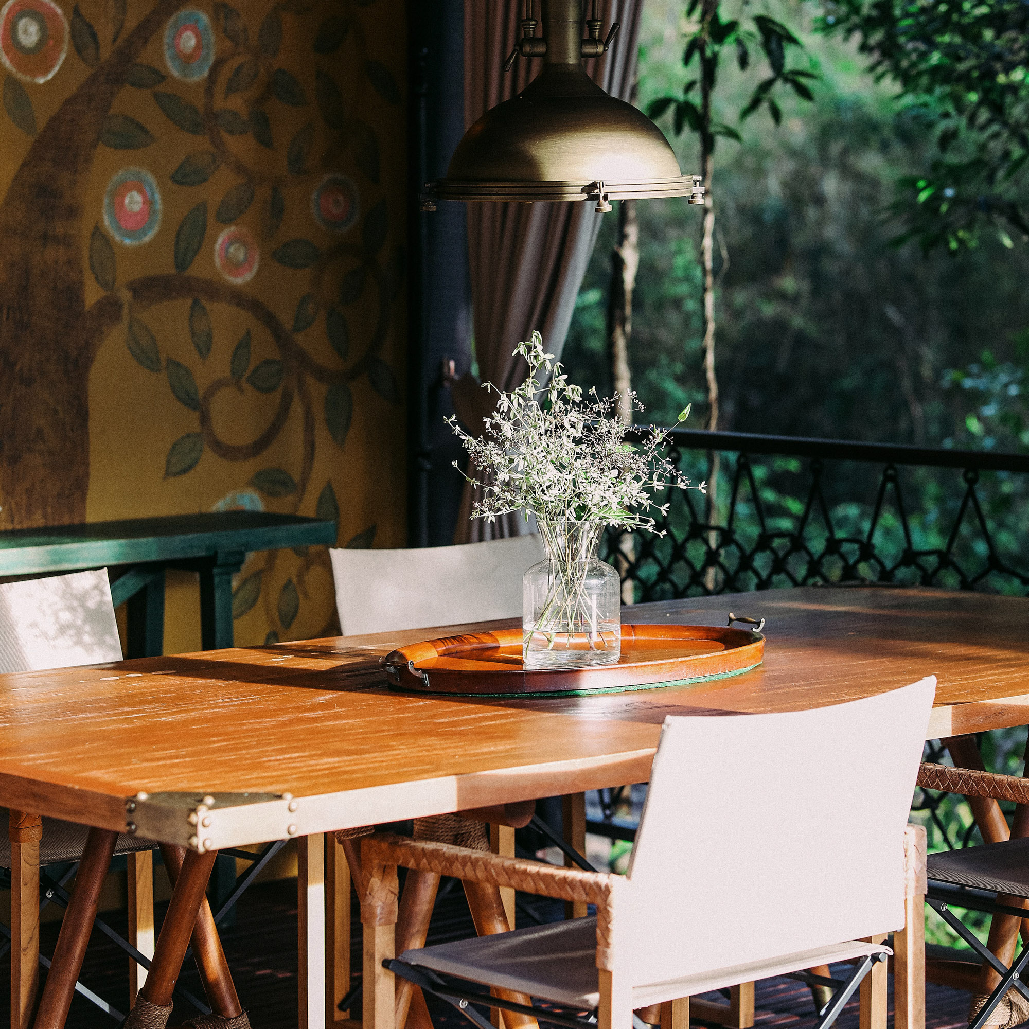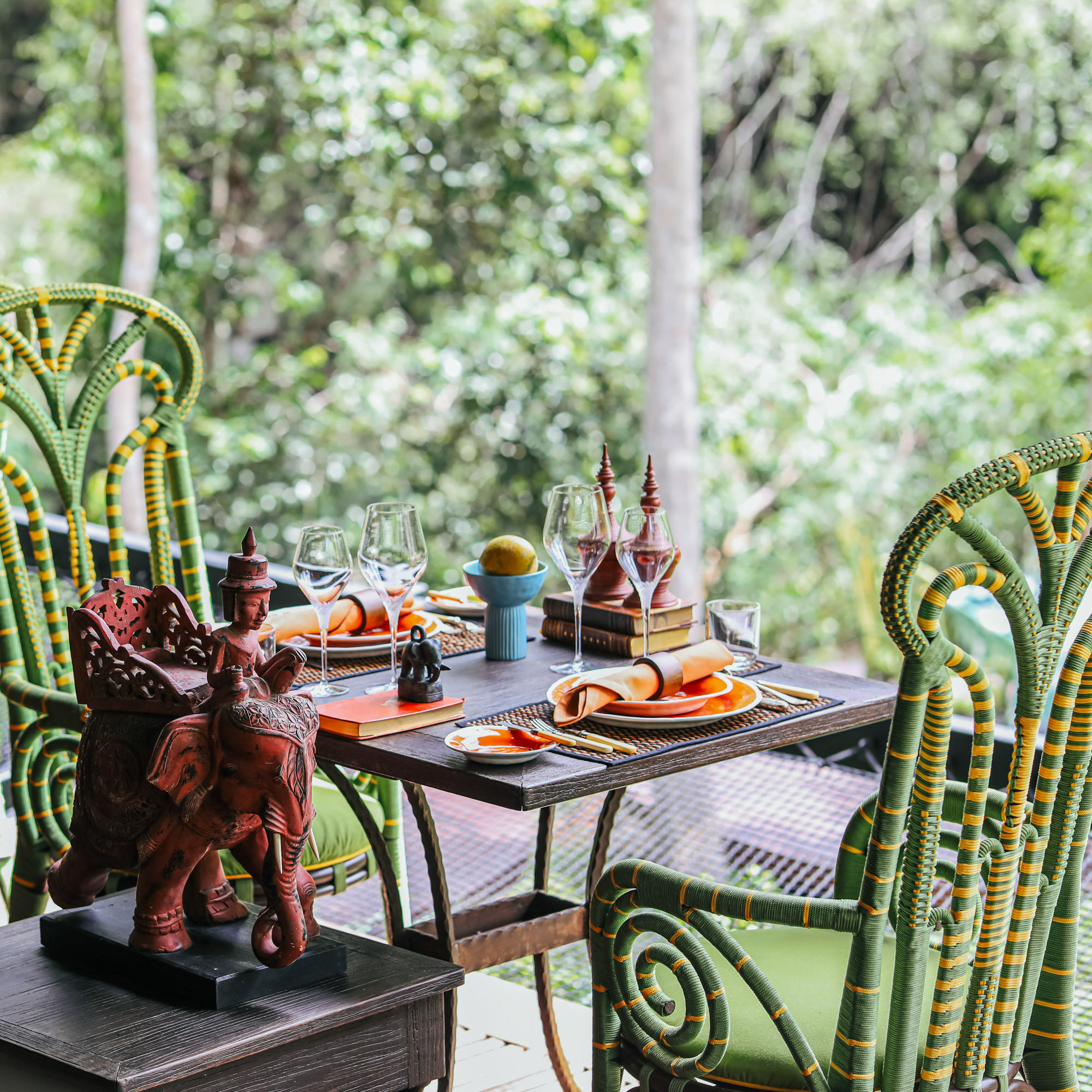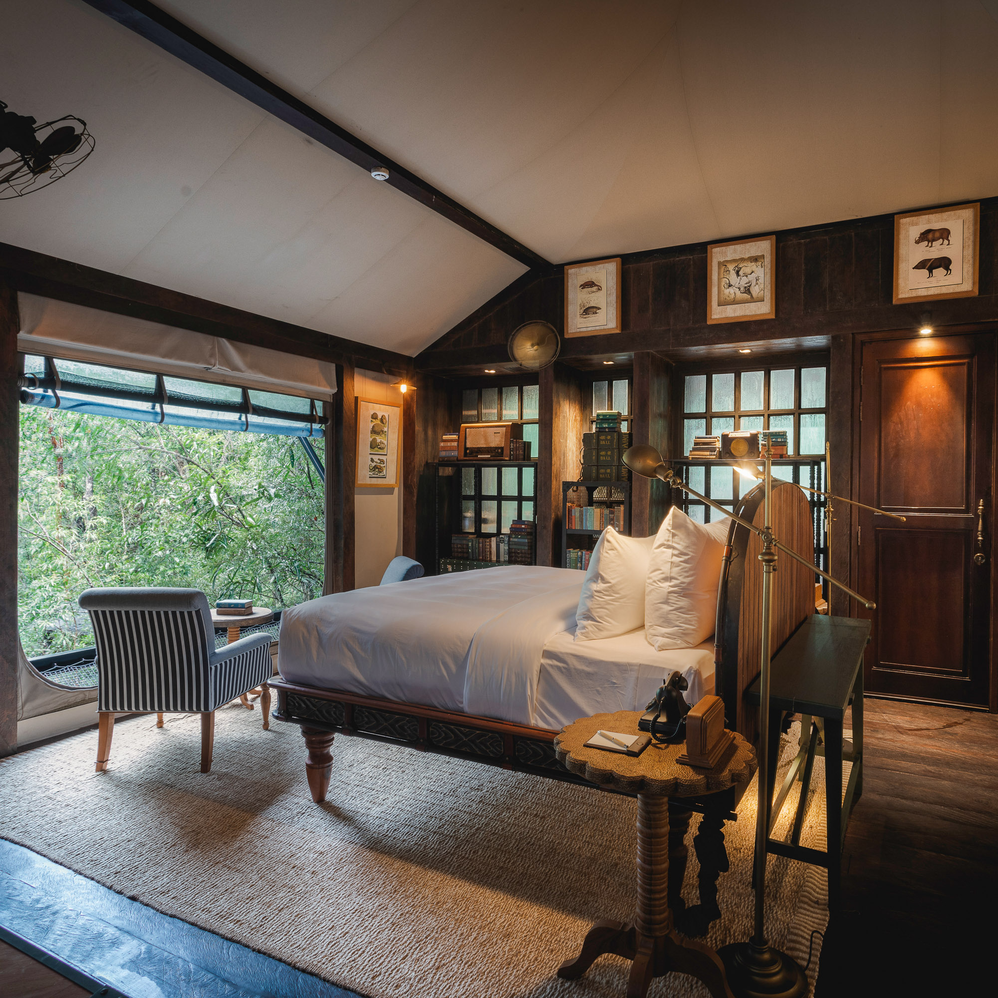 Das Interieur ist eine stilvolle Zeitreise, die auf die Farbpracht Asiens trifft. Zum Teil ersetzenVorhänge die Wände, um mit der Natur zu verschmelzen und Ausblicke zu gewähren auf den Dschungel und den Fluss, der teils über kleine Wasserfälle für eine einzigartige Geräuschkulisse sorgt. Egal ob vom Kingsize-Bett oder der freistehenden Wanne auf dem hölzernen Terrassenboden.