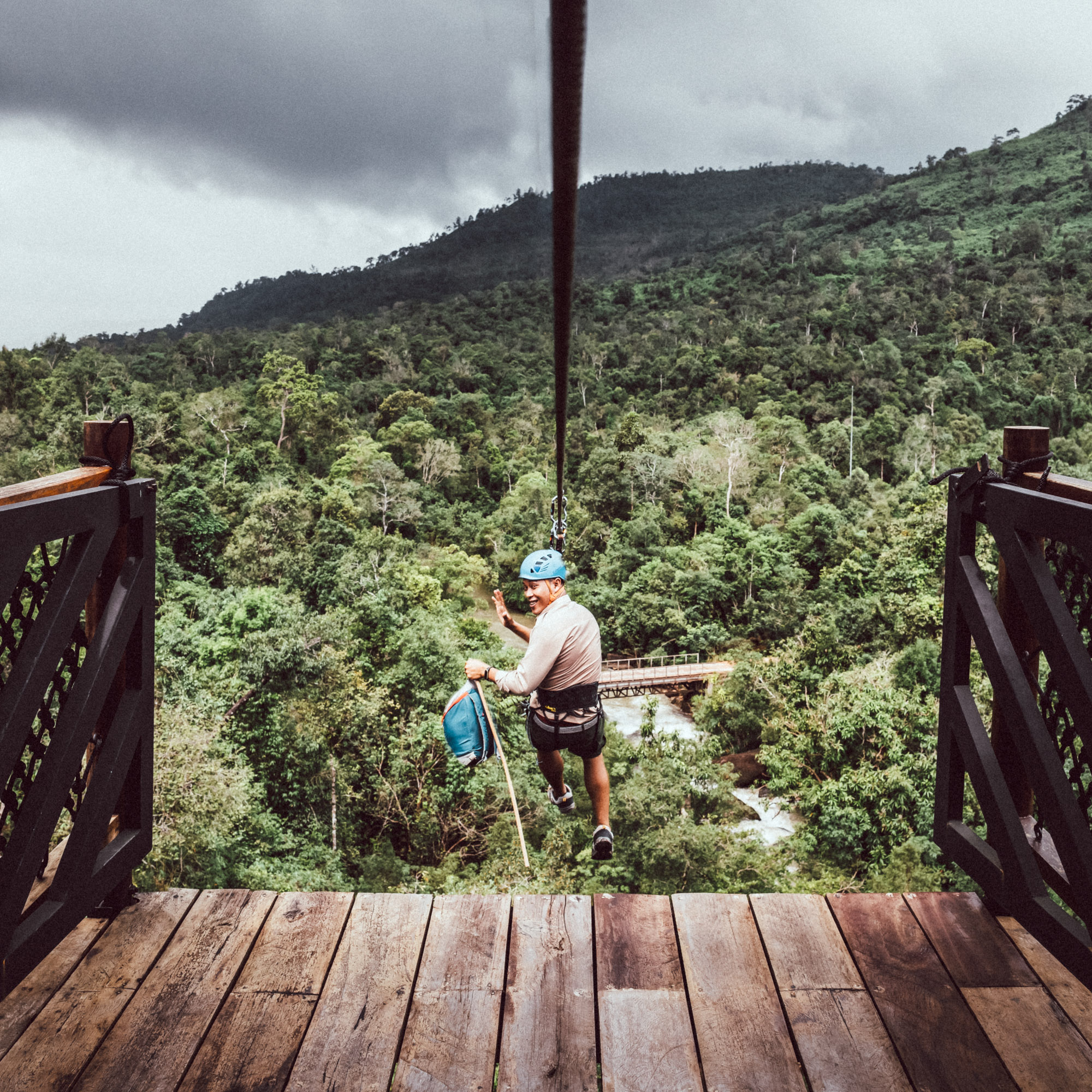Wir schweben, wir fliegen. Ganz ohne Motorstärke, nur mit unserem eigenen Körpergewicht. Meterhoch über immergrünen Wipfeln inmitten des tropischen Dschungels von Kambodscha. Es ist die wohl spektakulärste Anreise im Leben Abenteuer geneigter Globetrotterinnen und Globetrotter: per Seilrutsche fast 400 Meter weit ins ökologische Luxus-Glamping-Resort Shinta Mani Wild im Südwesten des buddhistischen und kulturschatz- und naturreichen südostasiatischen Landes.