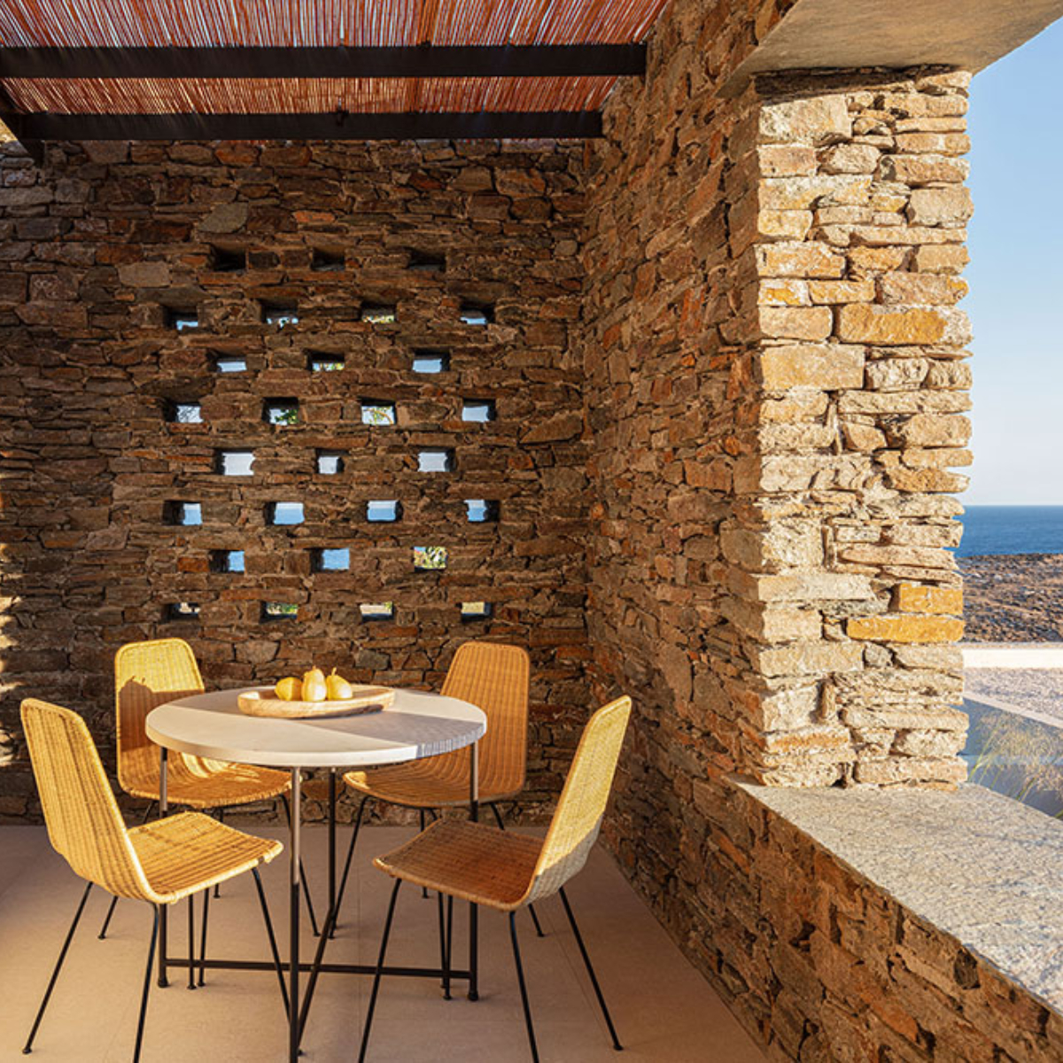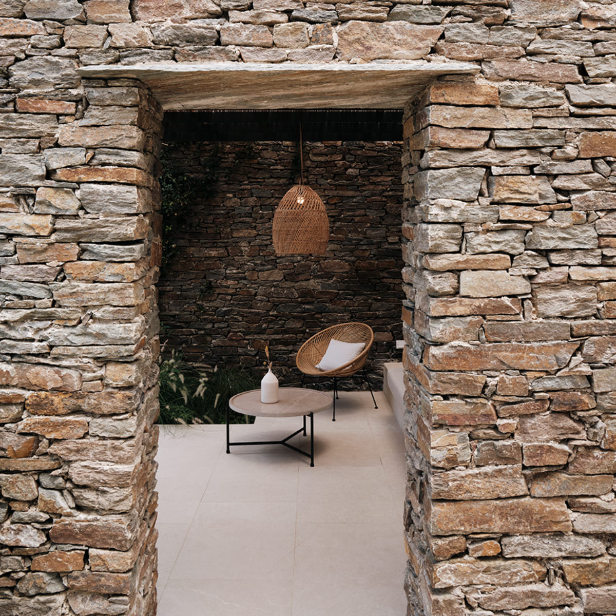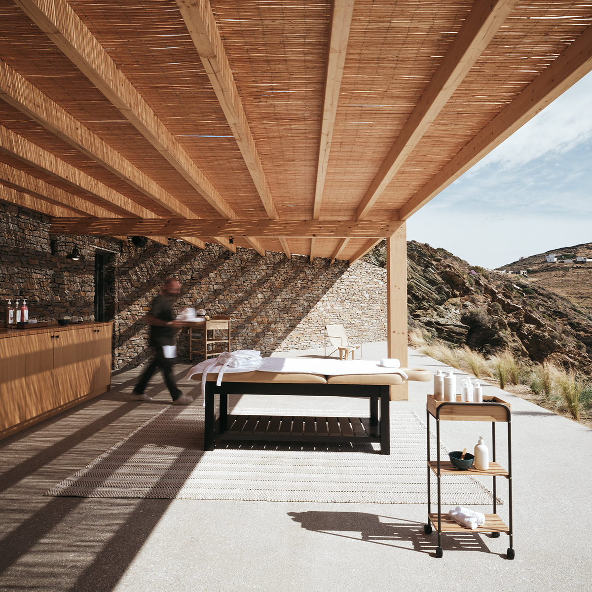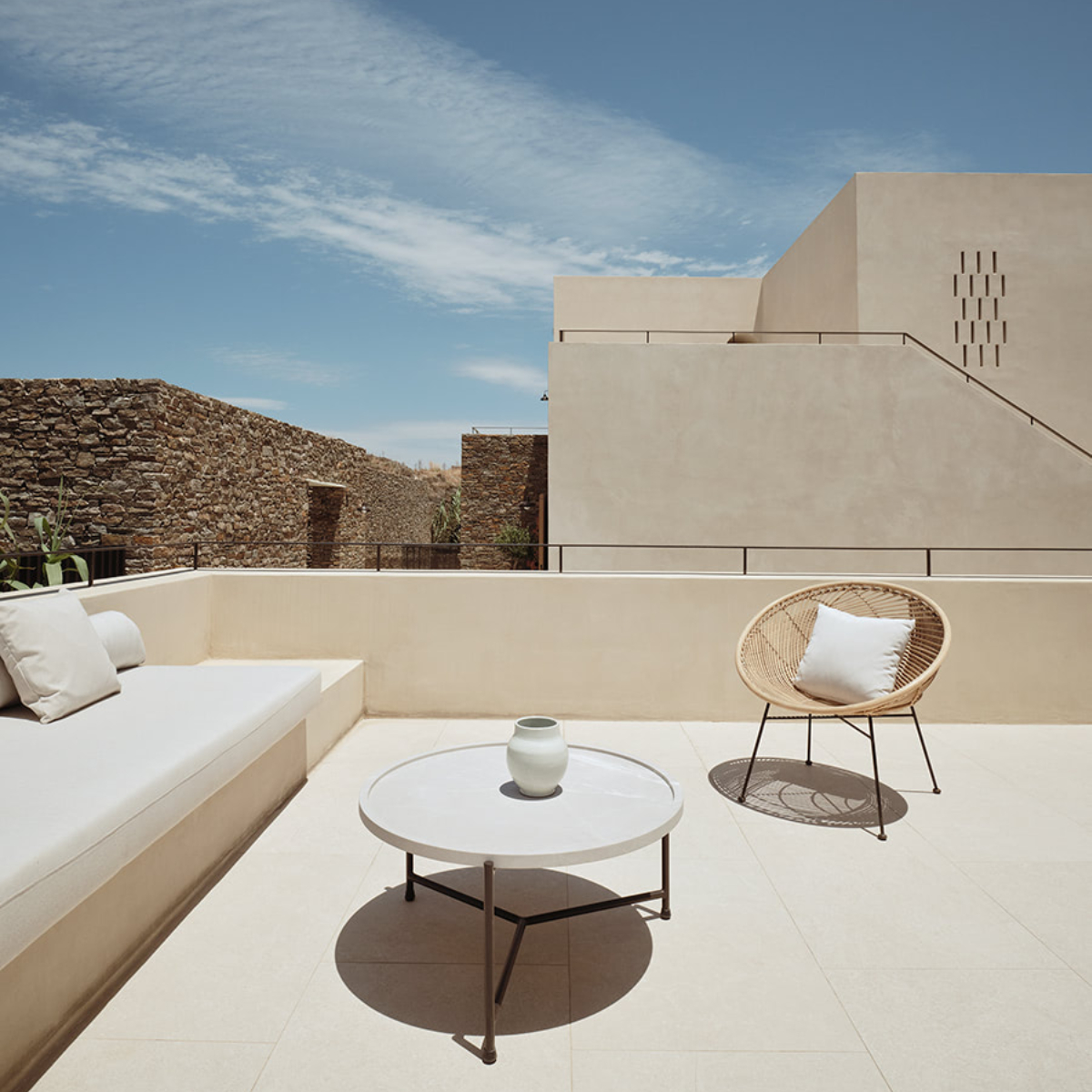 Sifnos ist einst durch Gold- und Silbervorkommen zu Reichtum gelangt. Dies ist längst Geschichte. Seit Jahrhunderten aber wird das Töpferhandwerk – die Insel hat reichhaltige Lehmböden – hochgehalten. Das sich sanft in die Landschaft einfügende 5-Sterne-Hideaway NÓS Hotel & Villas mit 31 Gästezimmern (33 bis 44 Quadratmeter) wurde aus und mit natürlichen Materialen, Stein, Holz, Kalkputz, erschaffen und ist mit seinen erdigen Texturen ein sehr haptischer Ort. Die hellenRäume, es gibt viele Terrassen und Balkone, öffnen sich zu lauschigen Innenhöfen, Drinnen und Draußen verschmelzen miteinander.