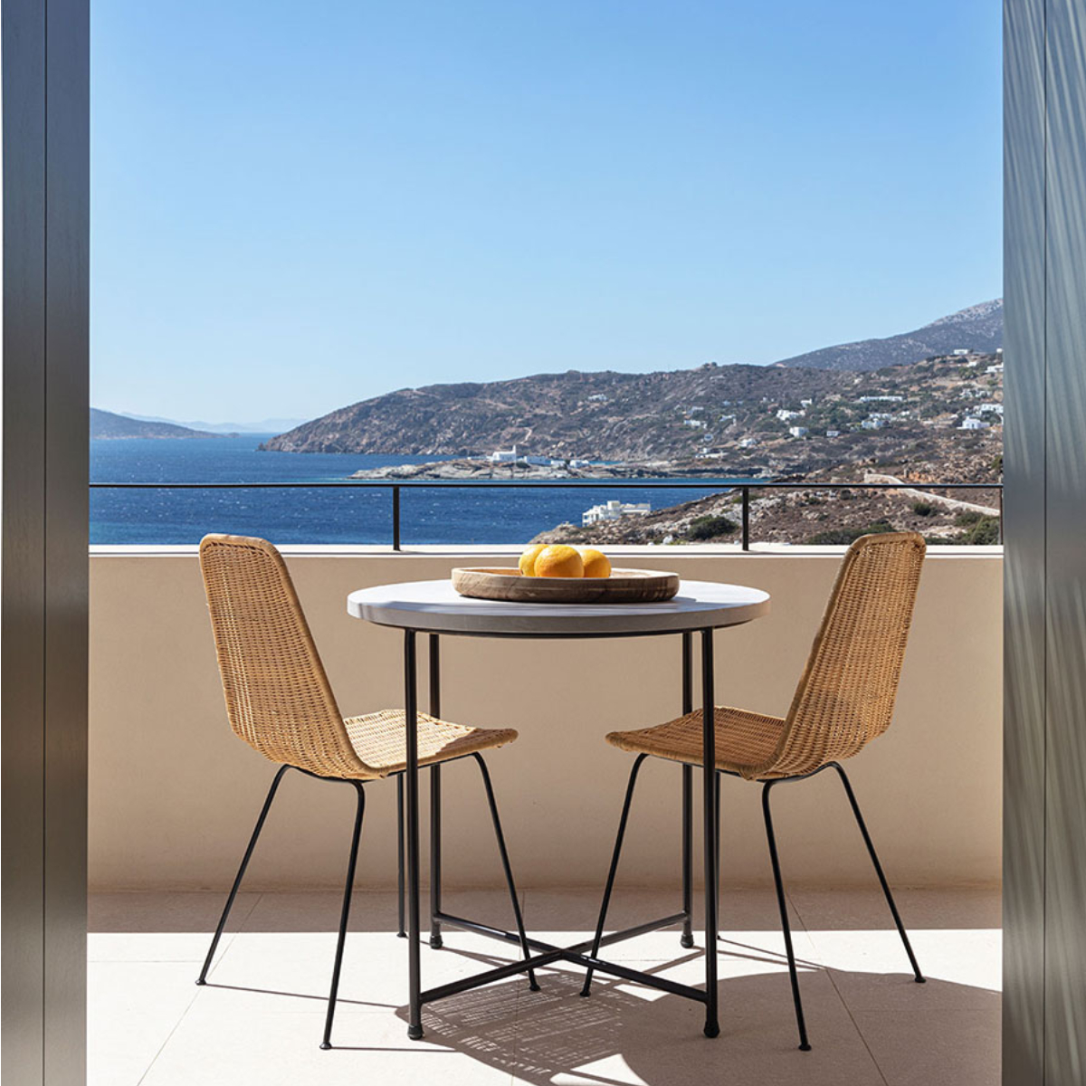 Wunderschöner Design-Purismus mit gekonnten Details, schon beim Check-In fühlt man sich zuhause. Zuhause plus, muss man sagen, das NÓS Hotel & Villas hat einen ungemeinen Standortvorteil. Man blickt auf die in der Sonne funkelnde Ägägis – zum Strand Faros sind es 300 Meter – und geht mit den Augen an der leicht hügeligen Küste spazieren.