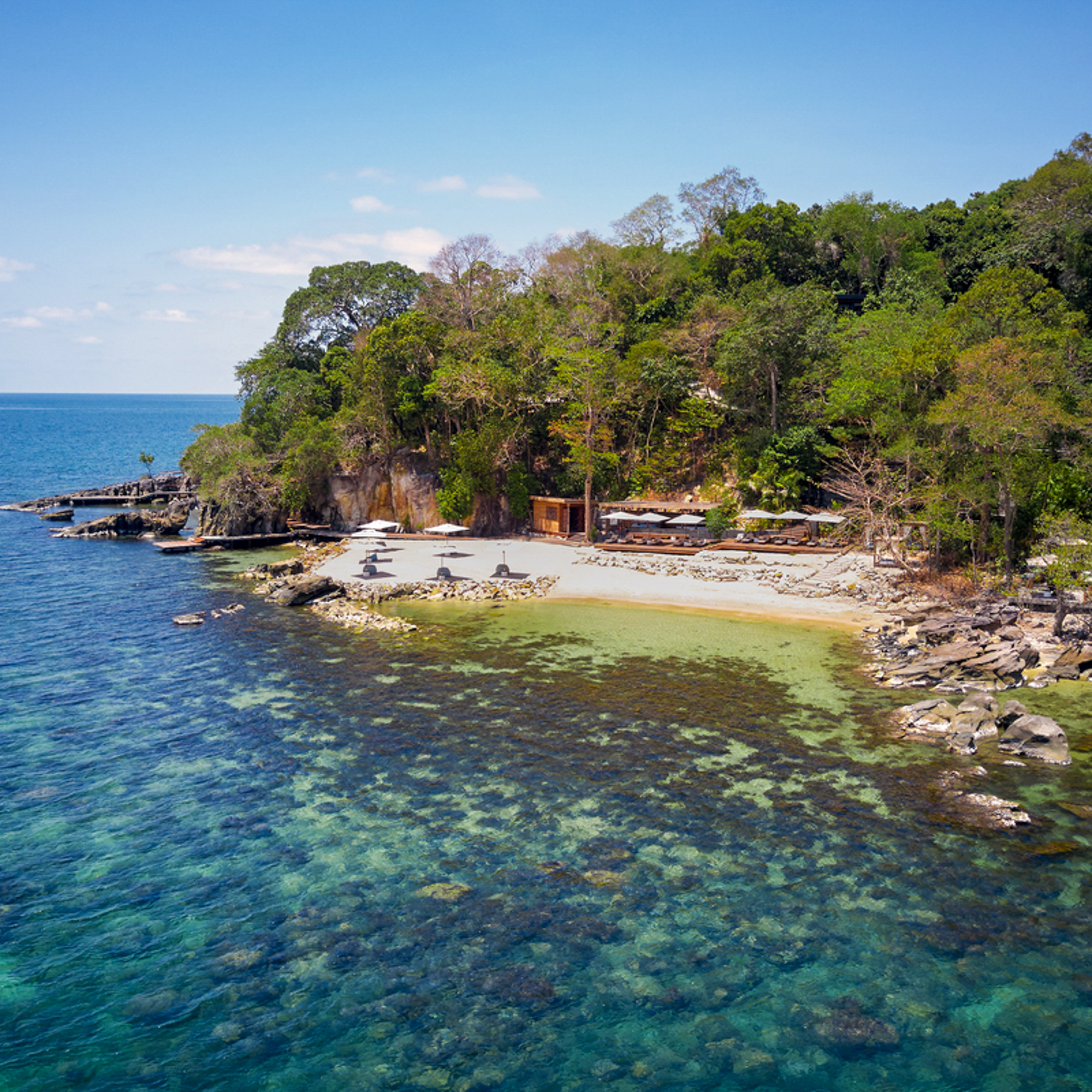 Nur 15 Minuten dauert die Bootsfahrt vom kambodschanischen Festland zur kleinen Insel Koh Krabey – und doch fühlt es sich an wie eine Reise in eine andere Welt. Weit weg vom Alltäglichen eröffnet das Six Senses Krabey Island einen Raum für all jene, die Stille suchen, Natur lieben und Wert auf nachhaltigen Luxus legen.
