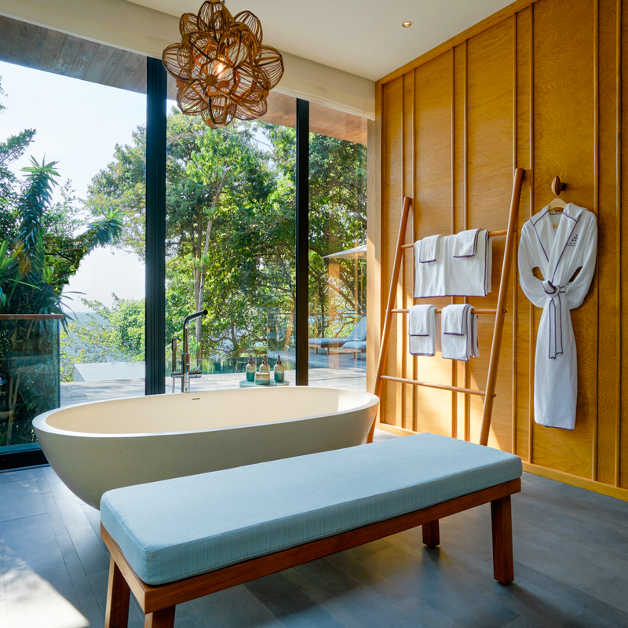 Die Insel selbst wirkt wie ein wohlgehütetes Geheimnis. Eingebettet in das satte Grün tropischer Wälder, umspült vom azurblauen Wasser des Golfs von Thailand, fügt sich das Resort mit seinen 40 privaten Pool-Villen harmonisch in die Landschaft ein. Keine Spur von künstlicher Inszenierung – hier ist alles durchdacht, reduziert und zugleich sinnlich. Architektur und Natur verschmelzen miteinander, verbunden durch gewundene Holzpfade, die sich durch den Dschungel ziehen wie versteckte Lebensadern.