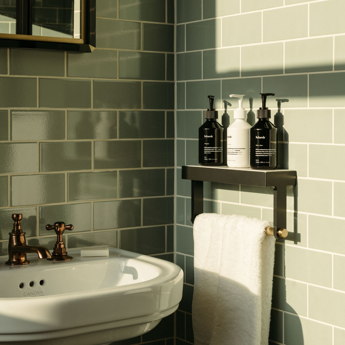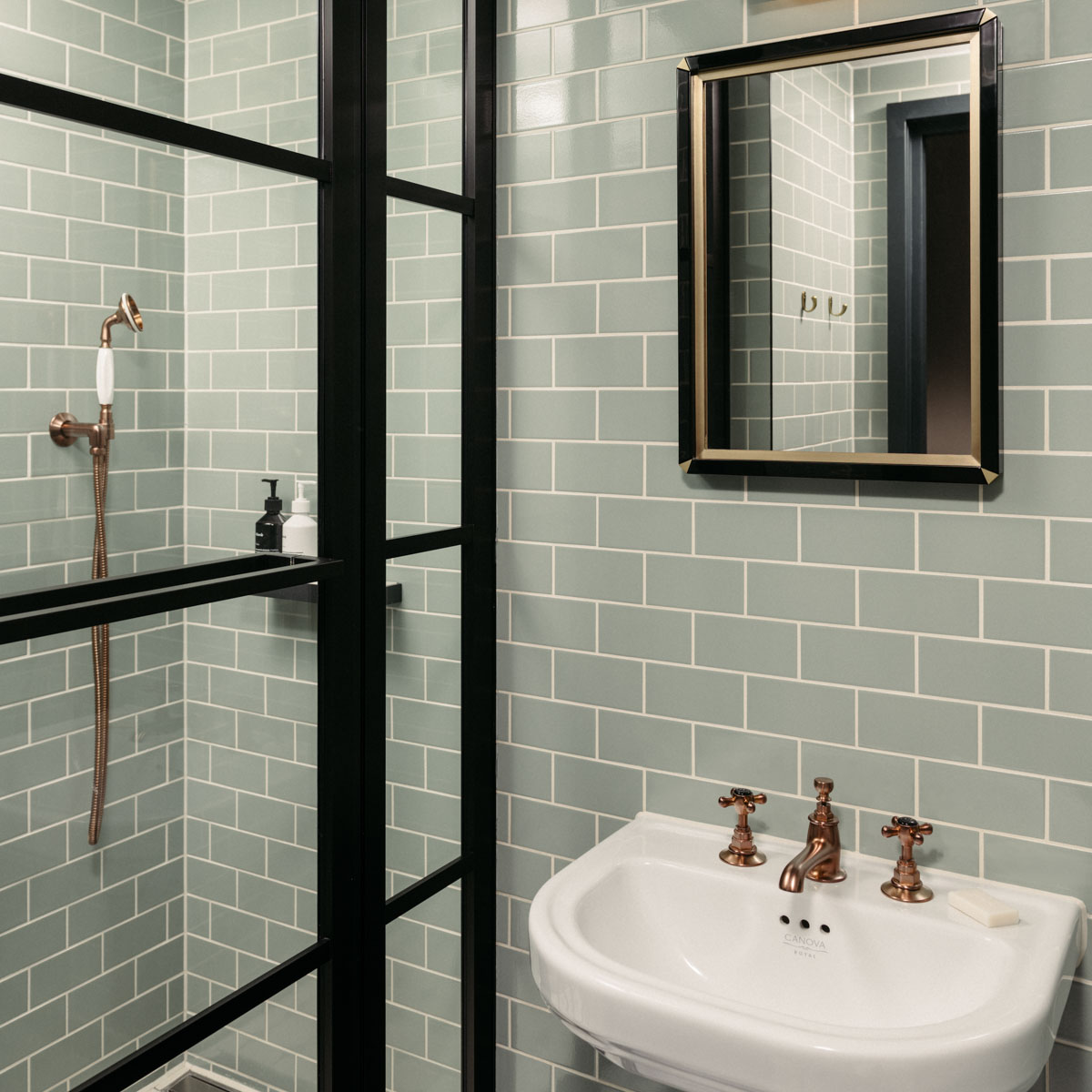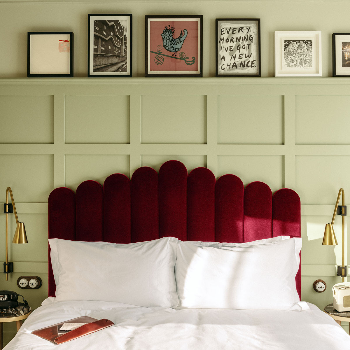 Liebenswerte Details wie das Retro-Hörertelefon oder das Vintage-Radio (natürlich mit Bluetooth-Funktion für die eigenen Tunes) und handgefertigte Gläser als Hommage an die Glasbläsereifabriken, die einst in diesem Viertel ansässig waren. Dazu salbeifarbene Fliesen, eine großzügig Walk-in-Dusche und geschmackvolle Armaturen im Bad – jedes Detail wirkt durchdacht und ist doch ganz unaufgeregt.