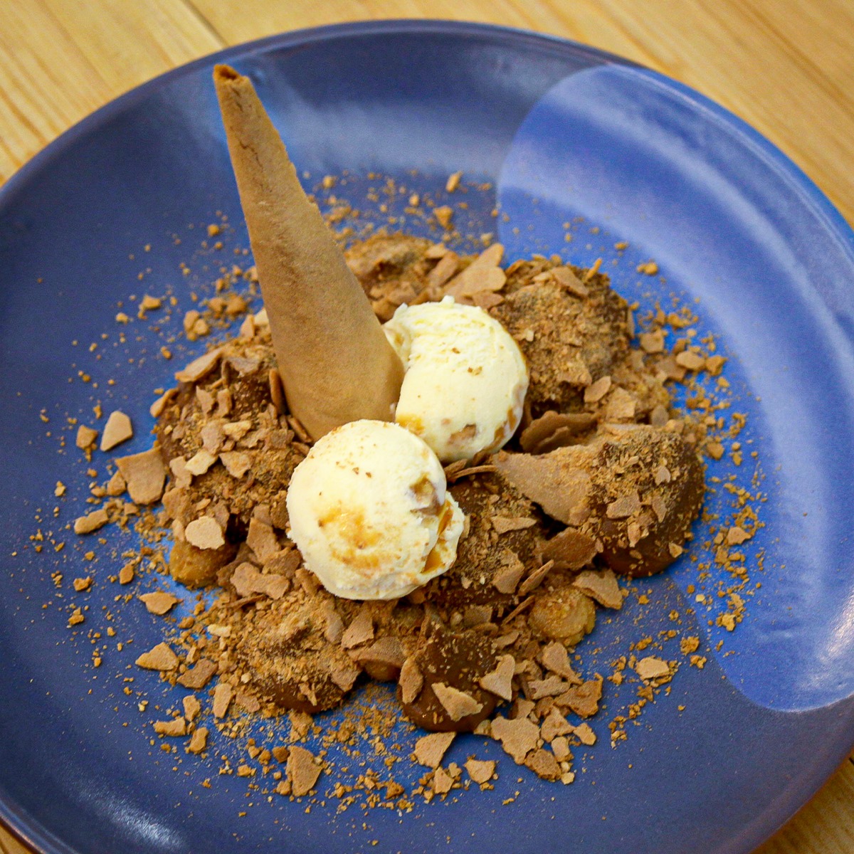 An dieser Stelle könnte der Bericht über das CruiX eigentlich enden. Wäre da nicht noch das Dessert, das köstlich und doch ein wenig traurig ausfällt. Nicht nur, weil damit der Abend im CruiX endet. Uns erwartet nämlich „A Sad Day at the Beach“. Was könnte sich dahinter anderes verbergen als eine in Karamell und Knusper gefallene Vanille-Eiswaffel. Vergnüglich, unbeschwert und saumäßig lecker – die perfekte Repräsentation unseres ganzen Abends. Ach was, unseres Aufenthalts in Barcelona.