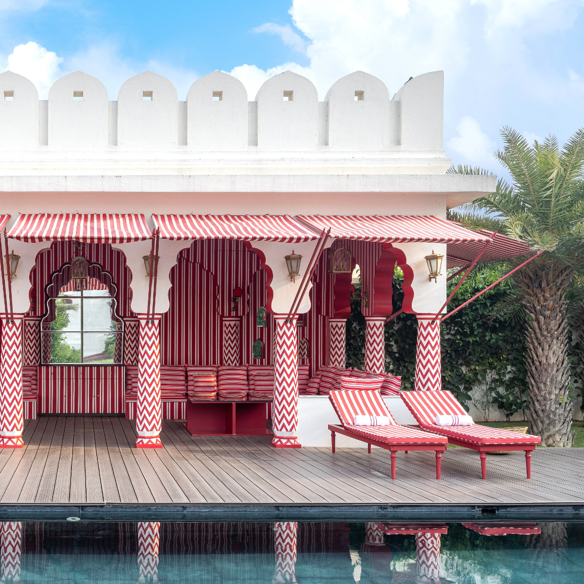 Überhaupt das ganze Farbspektrum Rot, damit könnte man die Villa Paladio beschreiben, das neueste Boutiquehotel im nordindischen Jaipur. Ein Edelstein also unter den Hideaways dieses südasiatischen Landes. Ein Schmuckkästchen, das sich hinter einer meterhohen roten Pforte verbirgt. Rund 15 Kilometer entfernt vom Zentrum Jaipurs, der Hauptstadt von Rajasthan.