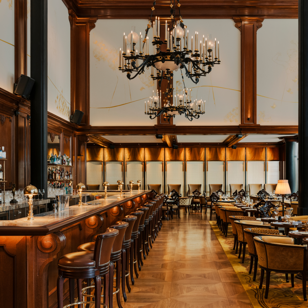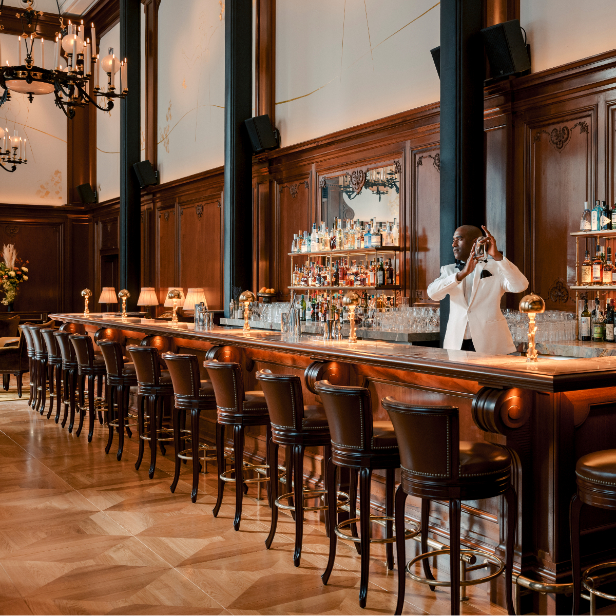 Die Lobby mit Eichenholzböden und Samtvorhängen, mit hellen Marmorsäulen, Wand- und Bodenmosaiken ist eine Reise ins Paris des 19. Jahrhunderts. Madame liegt die Gegenwart und Zukunft einer Hotelikone zu Füßen.
