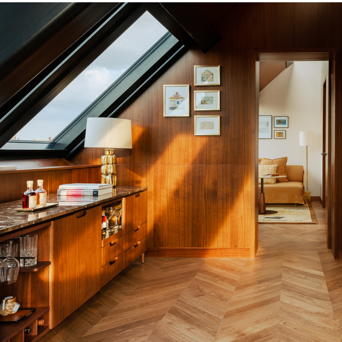 Taïeb hat damit eine räumliche Meisterleistung geschaffen. Alle Gästezimmer, wie auch das japanisch inspirierte Restaurant „La Plume“ von Küchenchefin Kayori Hirano, befinden sich auf einer Etage, auf insgesamt 5000 Quadratmetern. Darüber, über einige Stufen erreichbar, befinden sich nur noch die Cocktailbar und der Pariser Himmel.