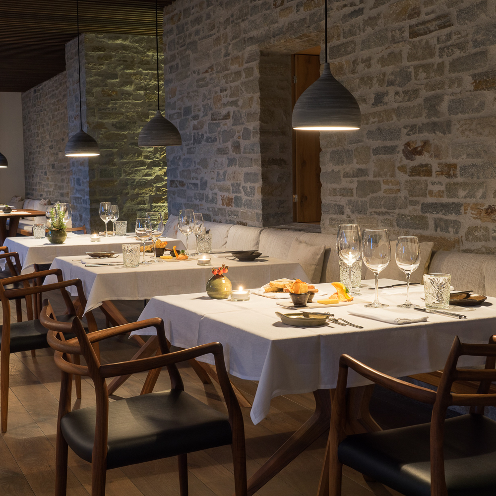 Gegessen wird von handgemachter Keramik der Österreicherin Petra Lindenbauer. Kein Teller, keine Schale und kein Krüglein gleicht dabei dem anderen. Eine weitere schöne Reminiszenz an die Natur, die auch hier im Restaurant allgegenwärtig ist. Blumen aus dem Garten. Zarte Leinen-Servietten. Hauchdünne Weingläser. Dezenter Luxus!