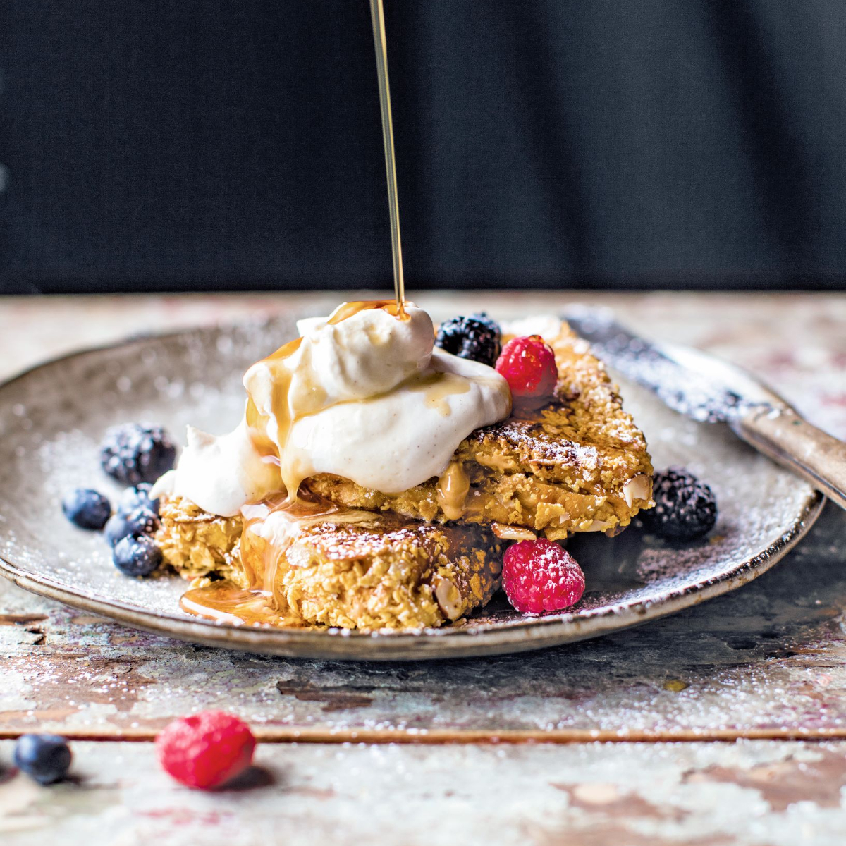 Thieghan Gerards Arme Ritter mit Erdnussbutter-Crunch sind da genau das Richtige. Dieses Rezept findet sich neben zahlreichen anderen, tollen Rezepten in ihrem Kochbuch „Das hippe Landkochbuch“. Genau wie ihre anderen Kreationen sind auch die Armen Ritter mit Erdnussbutter-Crunch kaum zu übertreffen und die perfekte Ergänzung für jeden Frühstückstisch! Ein in Eiermilch mit Bourbon getauchtes Brioche Erdnussbutter-Sandwich, umhüllt von einer knusprigen Mischung aus Cornflakes und Mandeln, wird in Butter golden gebraten und anschließend mit Zimtsahne, Ahornsirup und frischen Beeren serviert. Einfach himmlisch!