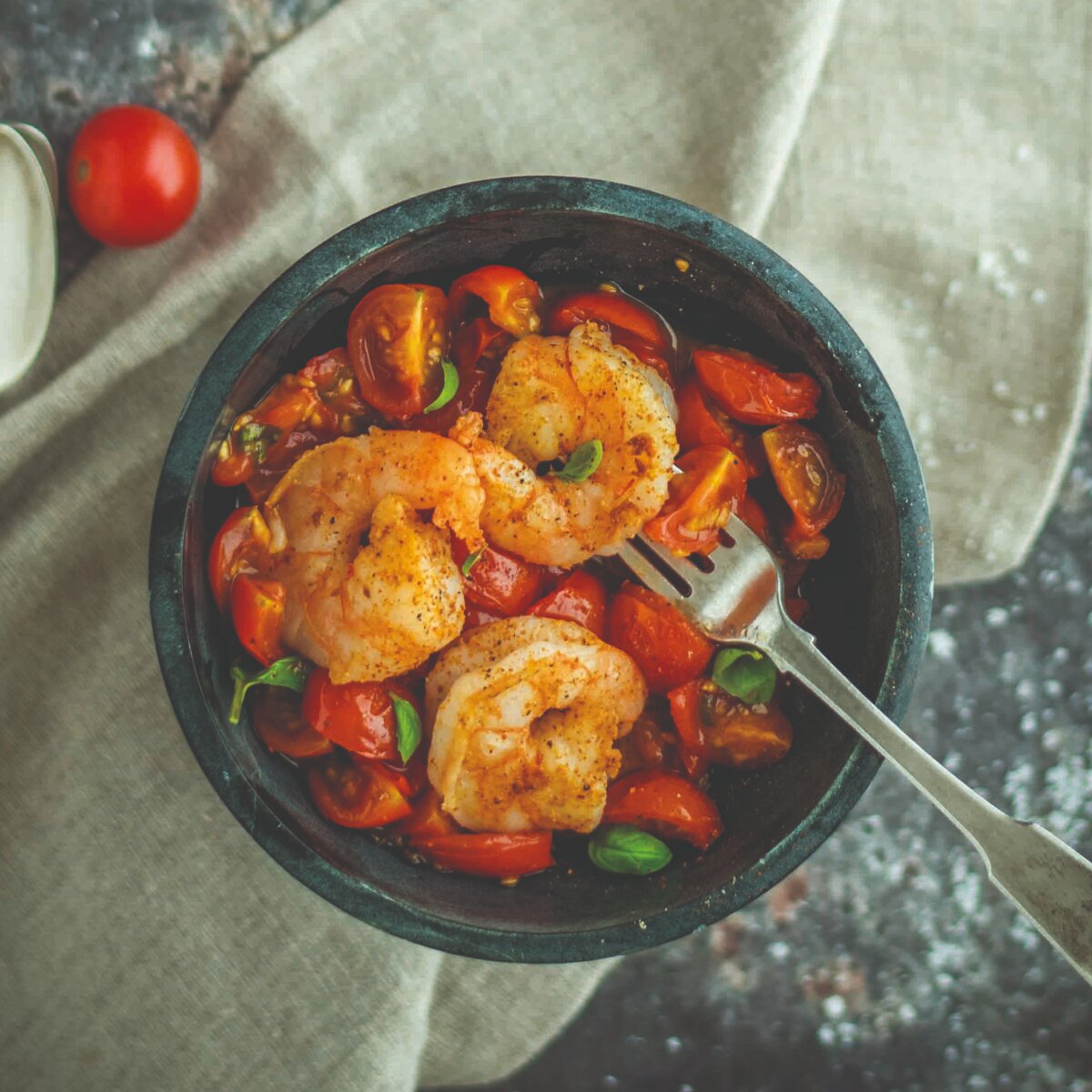 Im Geiste guter Gesellschaft und dem gemeinsamen Essen, finden diese Woche köstliche Riesengarnelen ihren Weg auf unsere Teller. Scharf angebraten und selbstverständlich in vorzüglicher Begleitung in Form saftiger Kirschtomaten und leichter Schärfe von Frühlingszwiebeln ergibt sich ein köstliches Gericht, das in wenigen Minuten zubereitet ist. Dank der intensiven Farben entsteht ein wahrhaftes kulinarisches Kunstwerk, das den Traum von sommerlichen Abenden ein wenig näher rücken lässt…