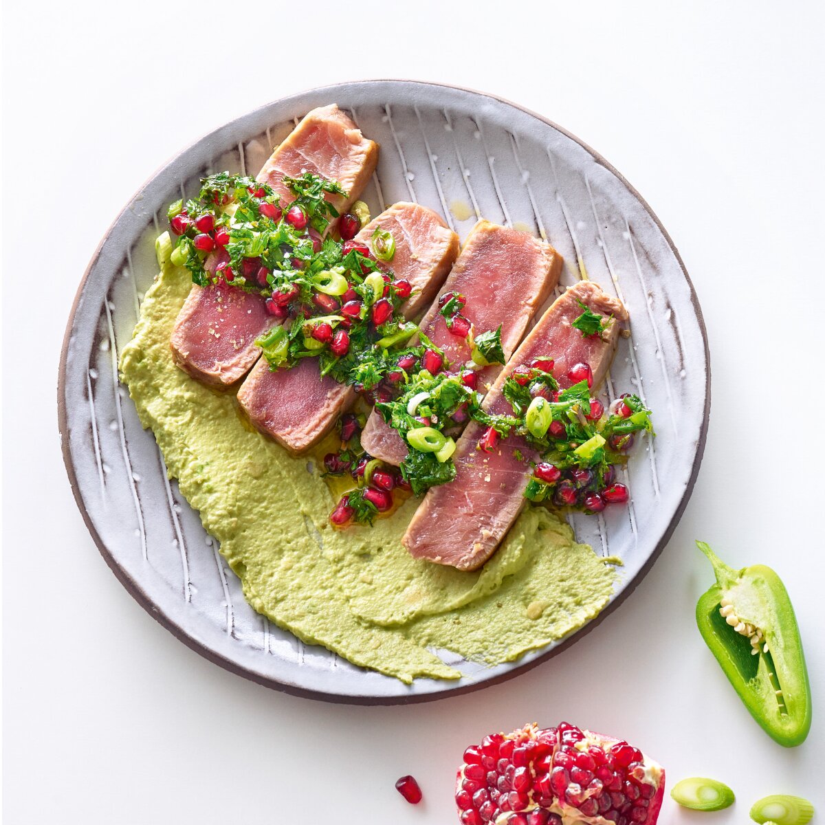 Es gibt kurz angebratenen Thunfisch, der sich aber auch durch Hähnchen oder frischen Blattsalat ersetzen lässt, mit zarter Avocadocreme und als absolutes Highlight ein Granatapfel-Kräuter-Relish. Dieses köstliche Relish aus dem Kochbuch „Toppings“ ist wunderbar fruchtig, frisch, mit einer feinen Schärfe, die perfekt ergänzt wird durch die Aromen zahlreicher Kräuter.