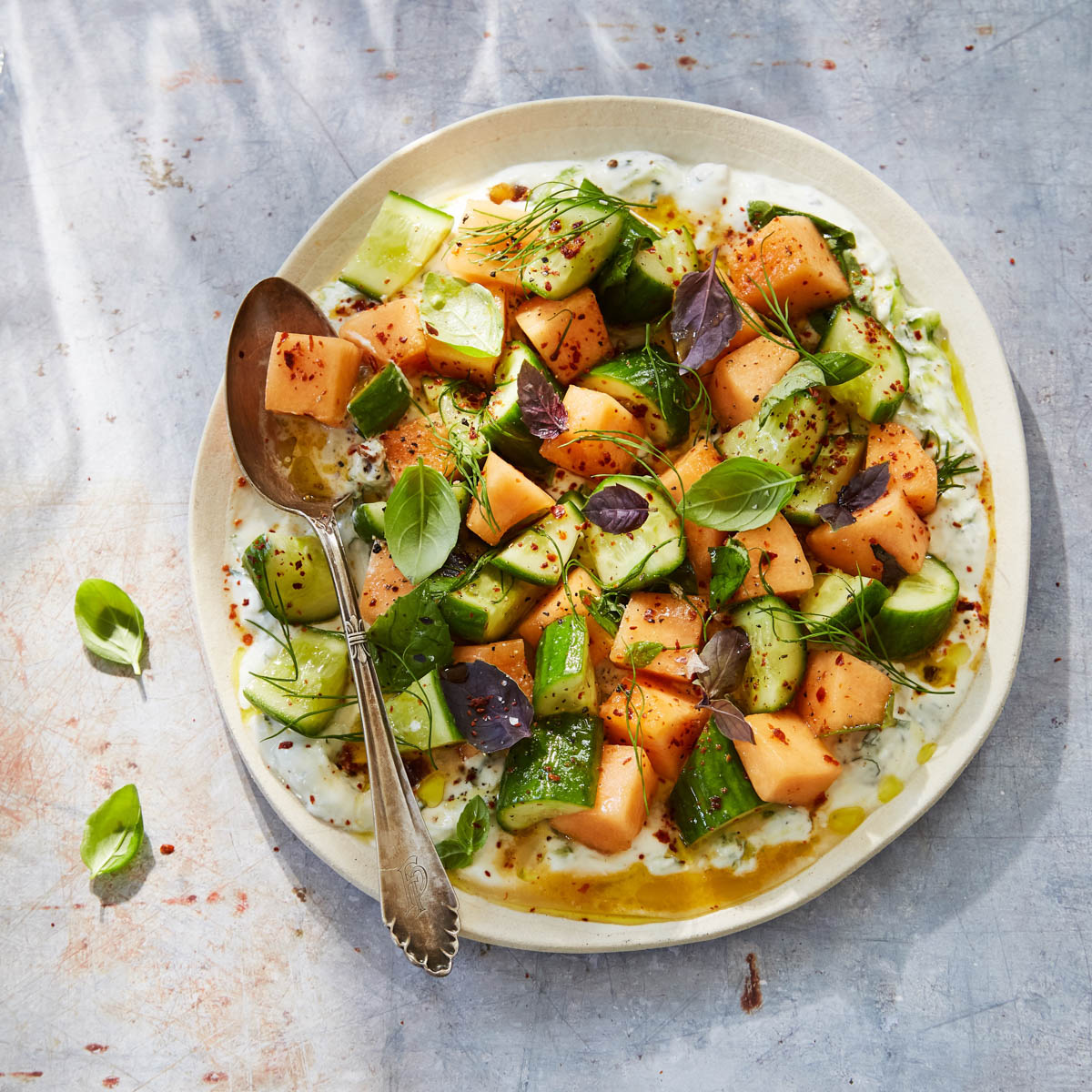 Es gibt knackig frische Salate, prickelnde Getränke, aromatisches Gemüse vom Grill und leichte Snacks für zwischendurch – alles natürlich ohne langes Schmorren, Backen oder Kochen. Auch dieser fruchtig-frische Salat aus Gurken und Cantaloupe-Melonen kommt ganz ohne Ofen und Co. aus. Ein paar Kräuter und ein leckerer Minze-Joghurt reichen um den perfekten Sommersalat zu zaubern.