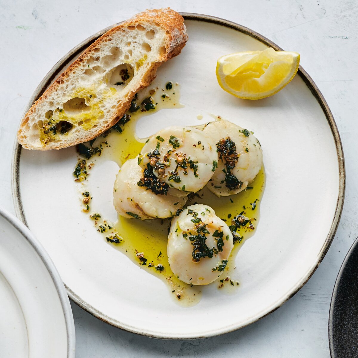 Jakobsmuscheln sind die geheimen Königinnen der französischen Küche, die selbst bei den erfahrensten Köchen Nervosität hervorrufen, jeden Gast aber in einen Zustand der Verzückung versetzen. Jeglichen Stress bei der Zubereitung umgehend werden für die Muscheln für dieses Rezept in karamellisierter Butter pochiert. Dabei bekommt das zarte Muschelfleisch ein einzigartiges Aroma, das ergänzt wird durch die Frische der Zitrone, sowie Knoblauch und etwas Koriandersamen.
