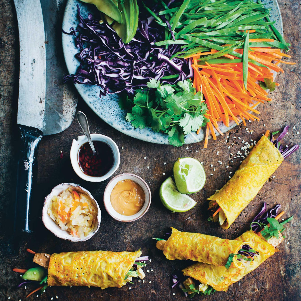 Mit ihrem Rezept für die Koreanischen Gemüsepfannkuchen zeigen die Beiden nun, wie abwechslungsreich ein ursprünglich einfacher Reismehl-Pfannkuchenteig sein kann. Man gibt koreanische geriebene Karotten zum Teig, füllt die fertigen Pfannkuchen dann mit koreanische inspirierter Rohkost und mariniertem Tofu und serviert sie dann wie Frühlingsrollen.