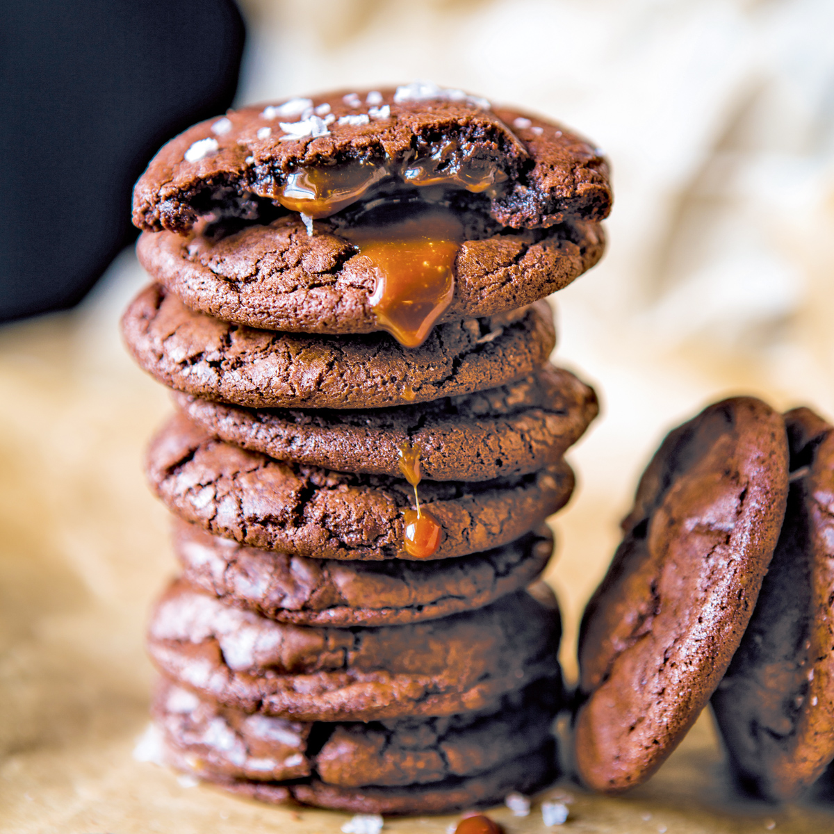 Schoko-Cookies. Wer ihnen bis jetzt noch nicht verfallen ist, wird es spätestens sein, nachdem er Tieghan Gerards mit Salzkaramell gefüllte Variante probiert hat. Der Keks ist pure Zartbitterschokolade und dennoch wunderbar weich. Die Füllung aus Milchschokoladenkaramell zerschmilzt auf der Zunge. Den allerletzten Kick bekommt der saftige Keks durch Meersalzflocken. Noch Fragen?