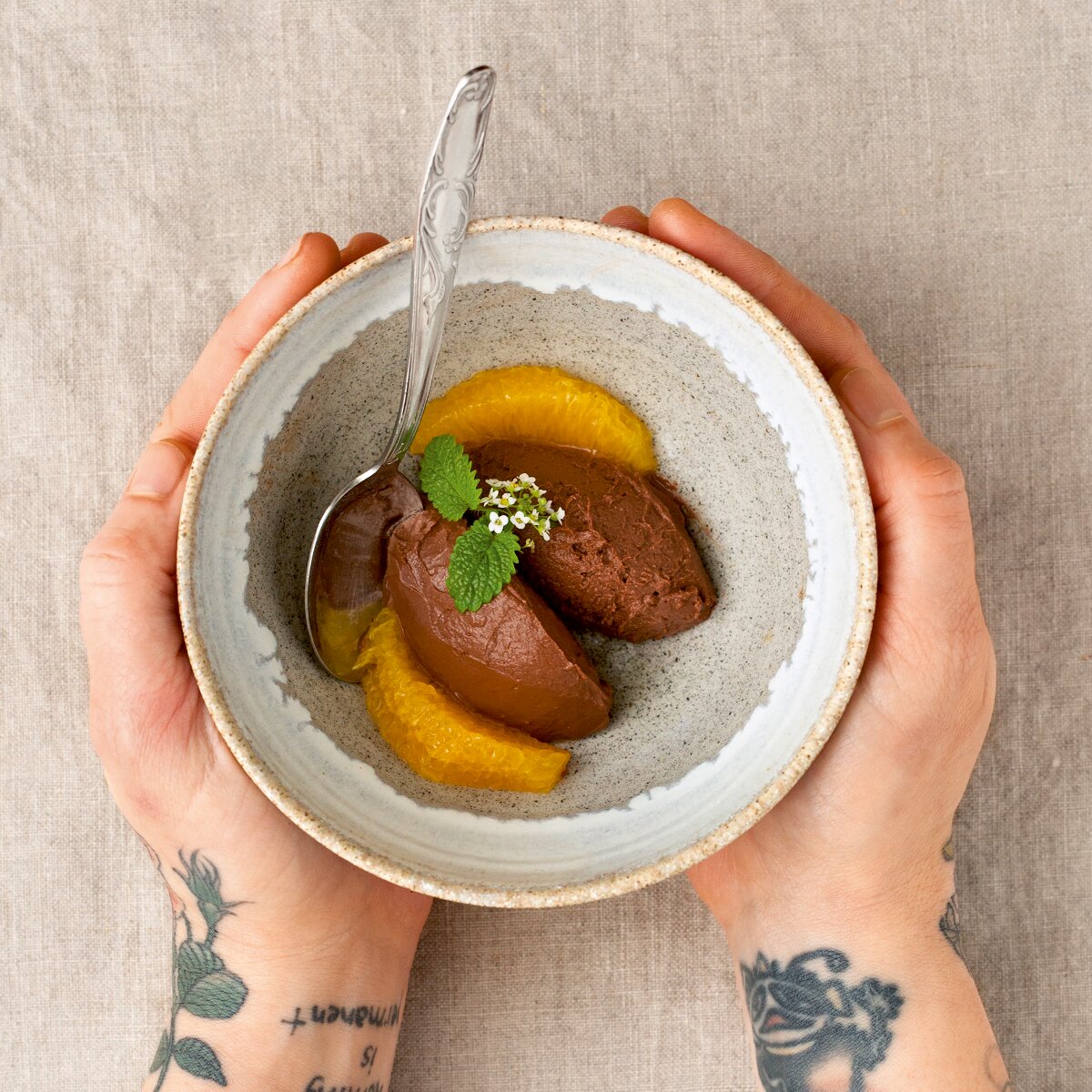 Selbstverständlich vegan und absolut unwiderstehlich, bestätigt diese Mousse einmal mehr meine Theorie, dass vegane Schokolade der Inbegriff aromatischer Harmonie und Perfektion ist. Vegan-Queen Sophia Hoffmann scheint der gleichen Meinung zu sein und beglückt uns in ihrem Kochbuch „Die kleine Hoffmann“ mit diesem und vielen anderen wunderbaren Rezepten. Orange, Zimt und Kardamom verhelfen der Schokolade zu einem herrlich-winterlichen Aroma, während Seidentofu – keine Angst vor dem Tofu, ich verspreche das Ergebnis ist umwerfend – das Ganze cremig werden lässt.