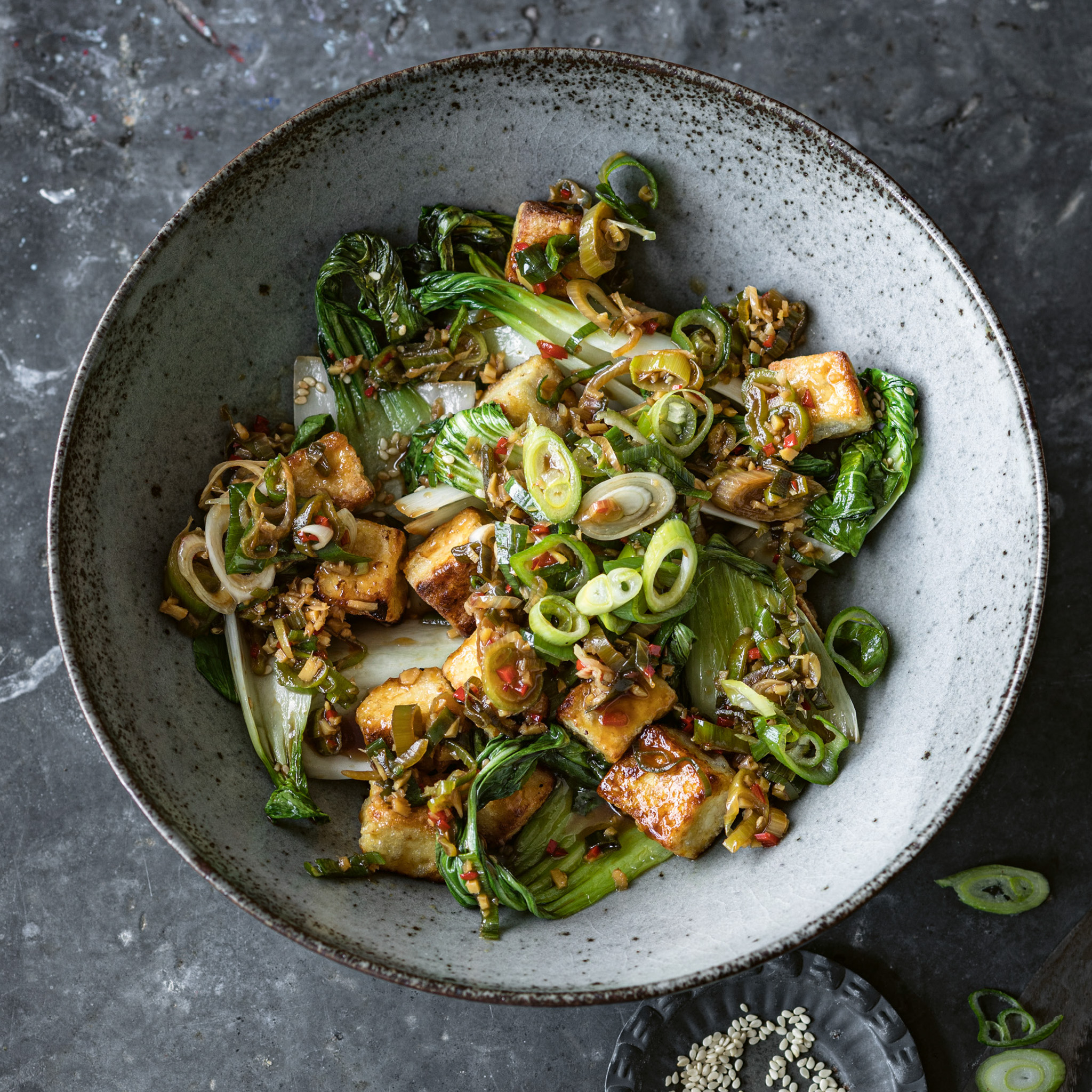Das beweist auch dieser fantastische chilischarfe Teriyaki-Tofu mit Pak Choi. Dabei ist der Tofu – entgegengesetzt zu so manchem Vorurteil – knusprig angebraten und in einer würzigen Mischung aus Teriyaki- und Soja-Sauce mit Chilli und Knoblauch gewendet. Dazu gibt man knackigen, frischen Pak Choi und am Besten Reis oder Mei-Nudeln – fertig ist das perfekte Abendessen in 20 Minuten!